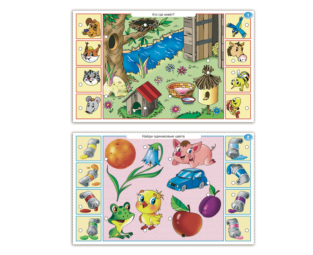 Яркие, веселые, очень детские рисунки в этих карточках! И задания не очень сложные. В 5 лет здесь уже нечего делать. Много заданий на ассоциации, на сравнение, на нахождение предметов - разных и одинаковых.