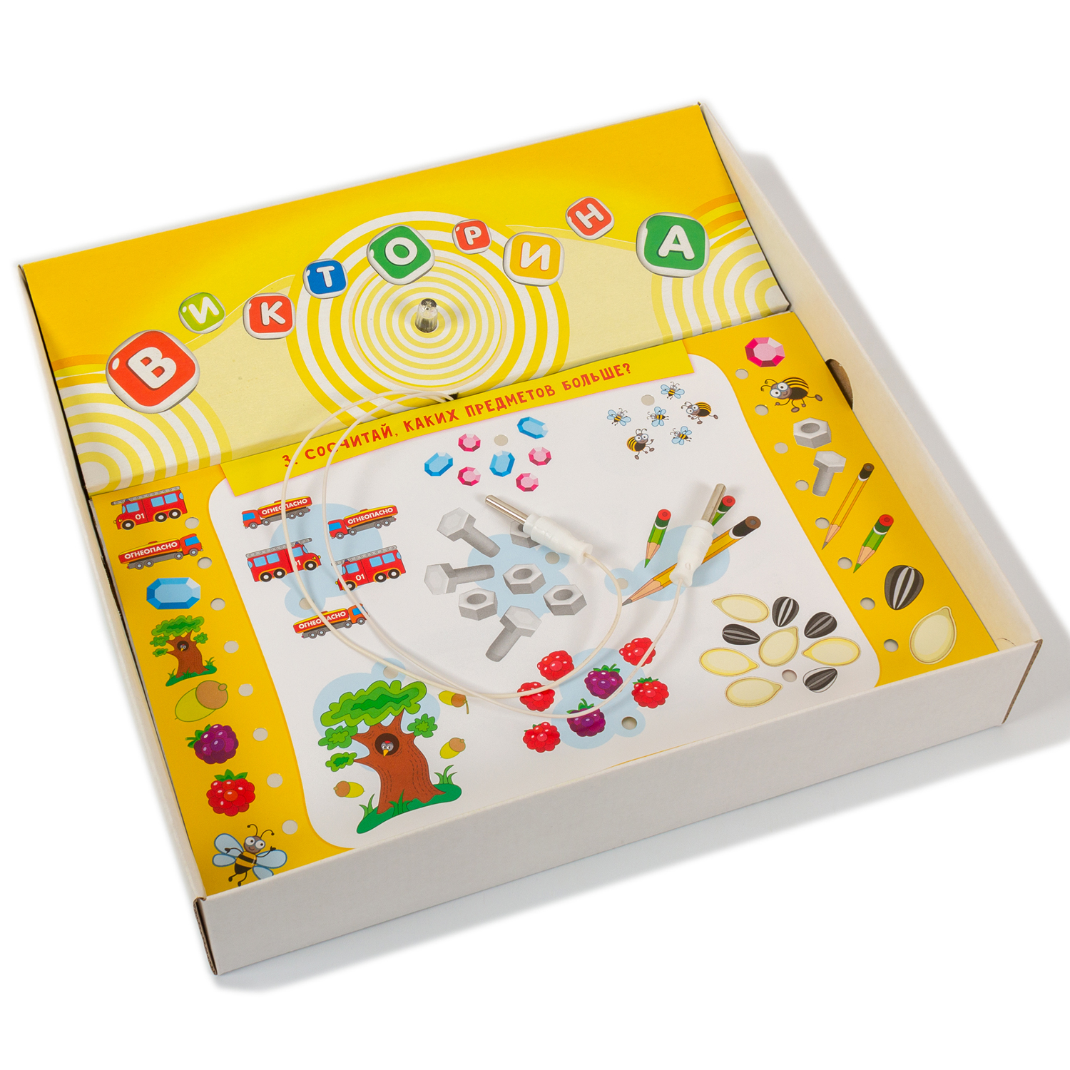 В игре 10 двусторонних карточек, 20 заданий. На каждой карточке – 8-10 пар изображений (всего 174 «вопроса» в игре). Игроки выбирают одну из карточек, кладут её в коробку поверх электронной платы и читают задание. Затем с помощью двух проводков-электродов выбирают на карточке парные изображения – прикладывают электроды к отверстиям рядом с картинками. Если ответ правильный, загорается лампочка и звучит музыка.