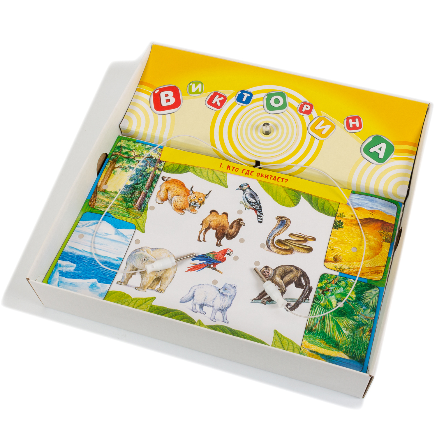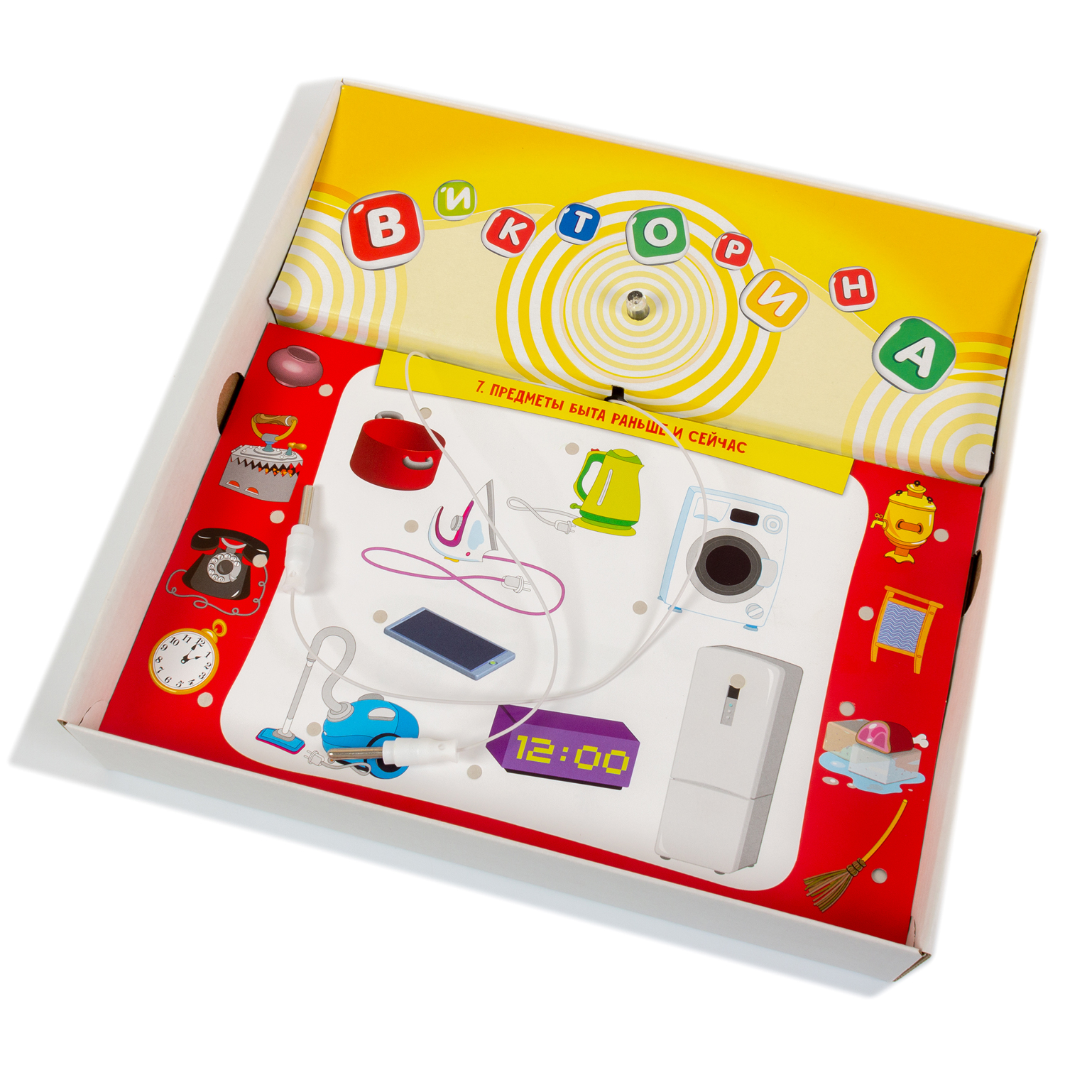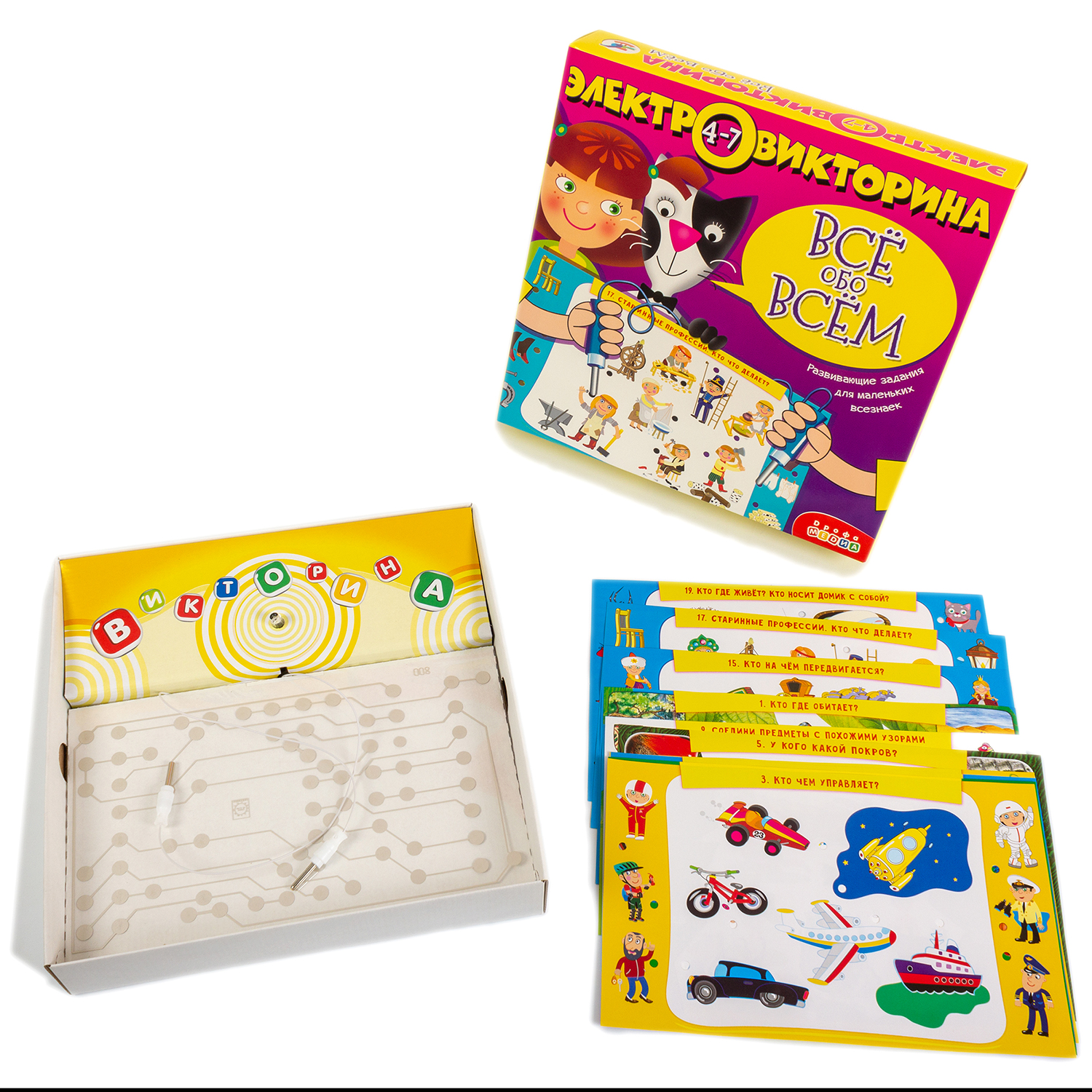 В электровикторине игрок с помощью проводящих ток проводков ищет правильные ответы на вопросы. Один проводок прикладывают рядом с вопросом, а второй — рядом с предполагаемым ответом. Если ответ правильный, электрическая схема замкнётся, загорится лампочка и зазвучит музыка. Электронная плата, используемая в наших играх, — универсальна. Поэтому, если у вас есть одна электровикторина, то вам не нужно покупать другие игры в коробках, а достаточно приобрести наборы карточек на другие темы.