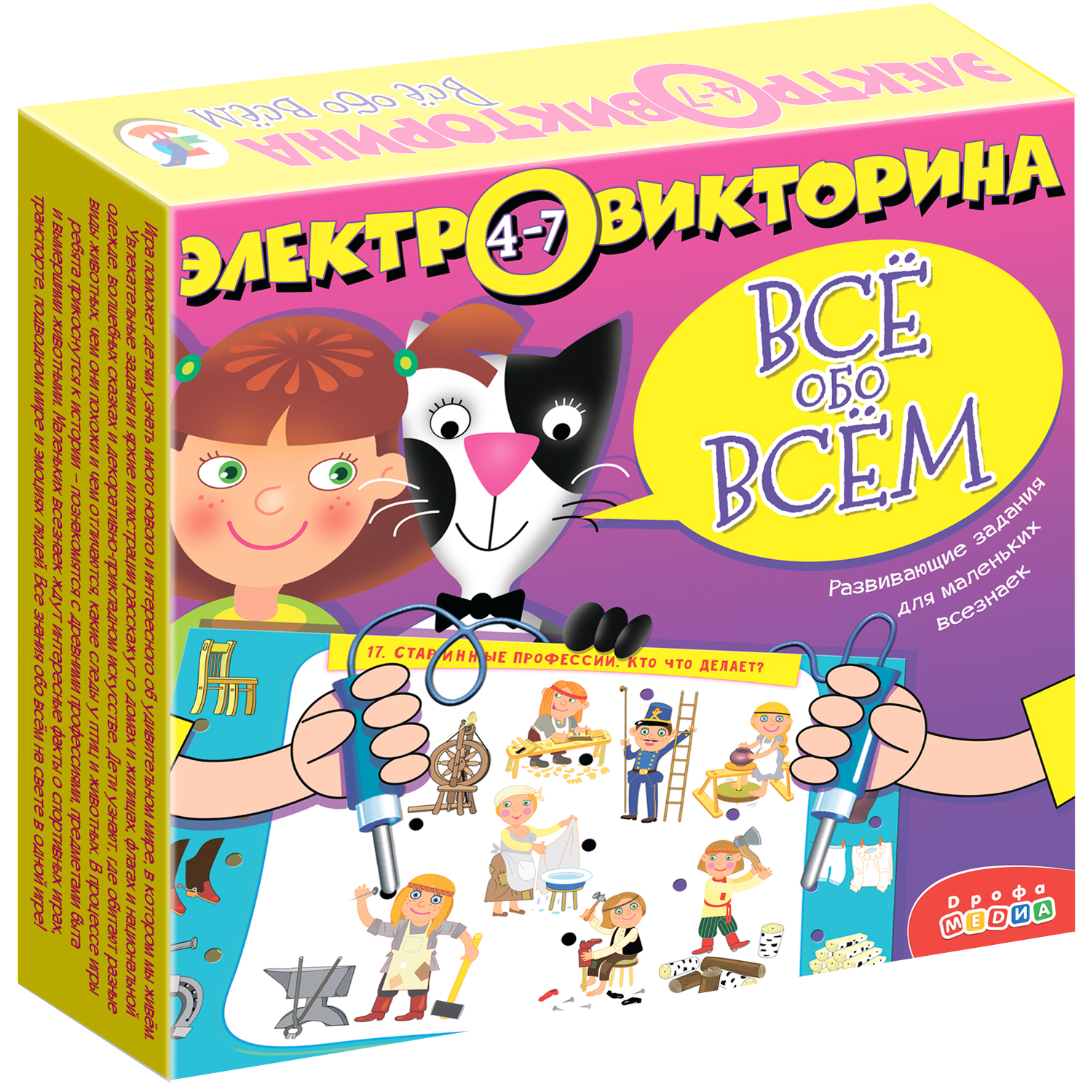 Электровикторина «Всё обо всём» познакомит ребят с прекрасным и удивительным миром вокруг нас. Дети узнают много нового и интересного: в каких жилищах живут разные народы, что за животные обитали на Земле в древности, как выглядят флаги разных государств, а ещё научатся различать следы разных животных, познакомятся с подводным миром и профессиями наших предков.