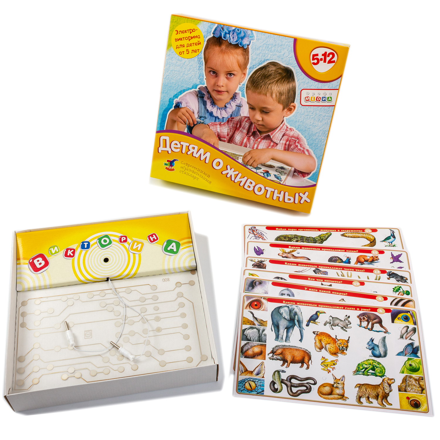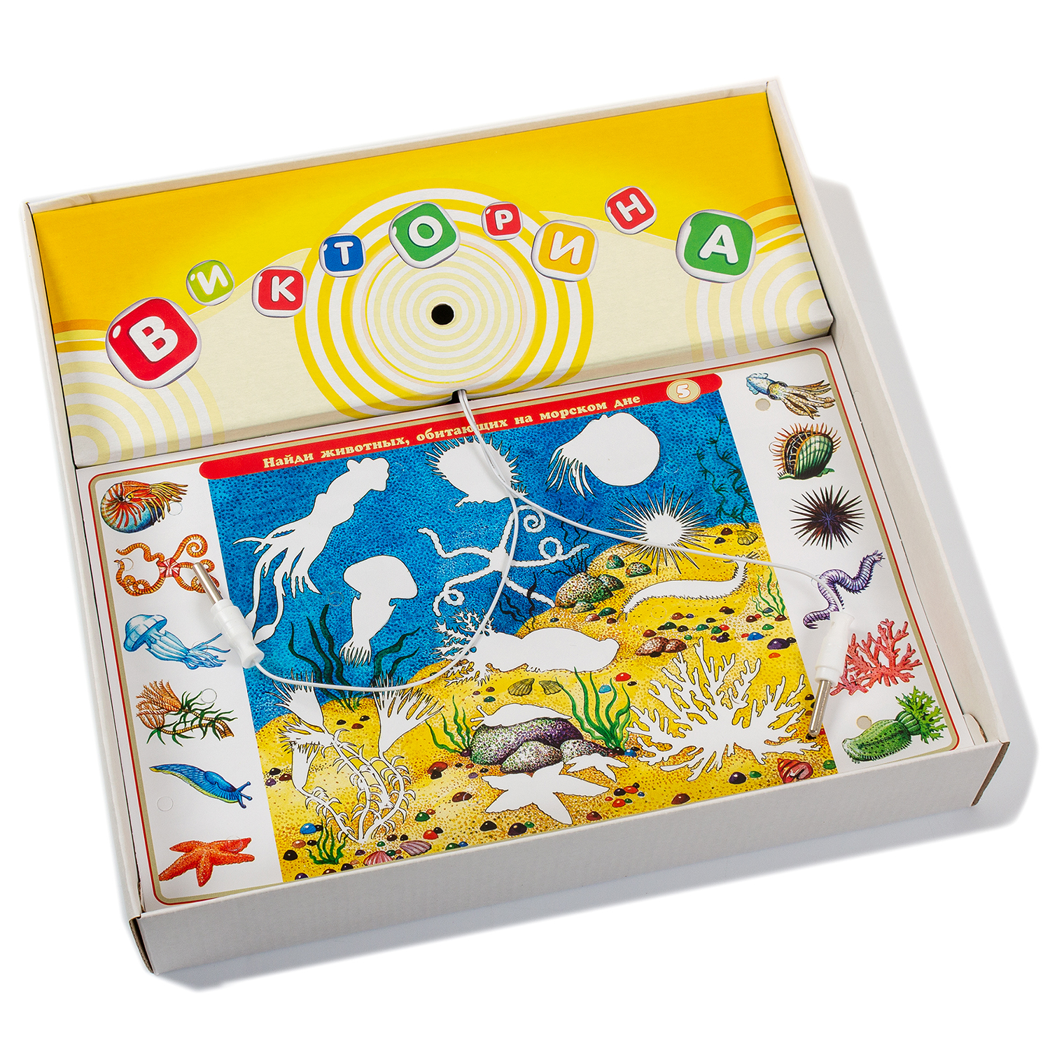 В комплекте: 10 двусторонних карточек, плата, светозвуковой модуль, батарейки, брошюра с ответами, правила.