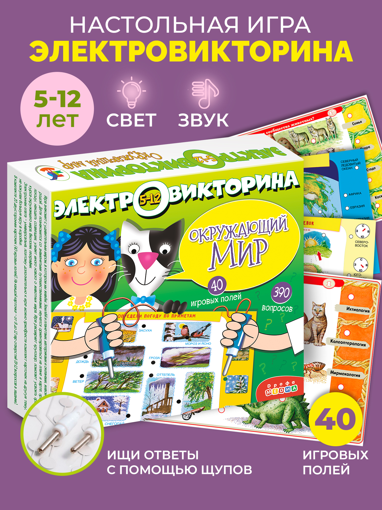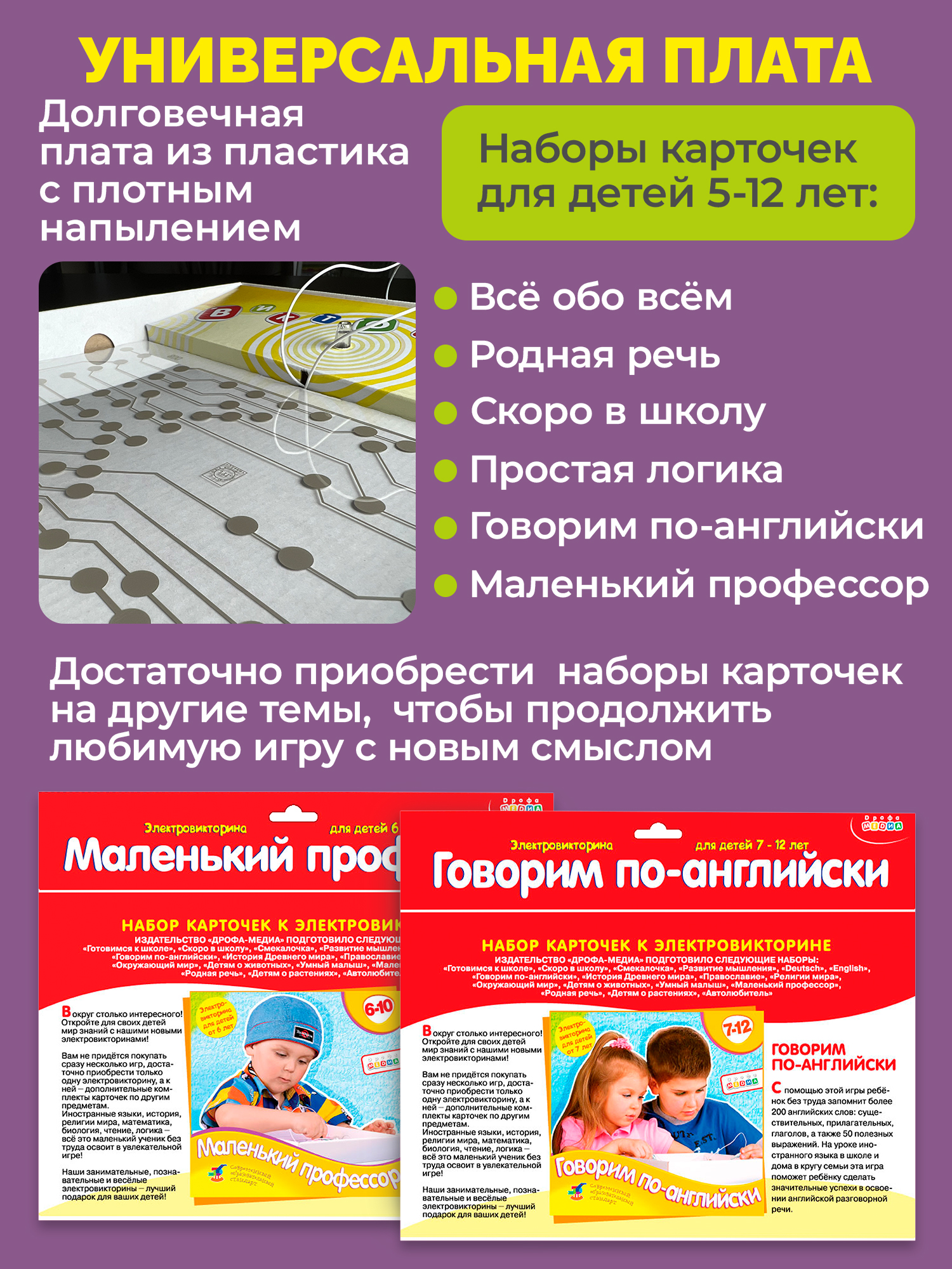 Электронная плата, используемая в наших играх, — универсальна. Поэтому, если у вас есть одна электровикторина, то вам не нужно покупать другие игры в коробках, а достаточно приобрести наборы карточек на другие темы.