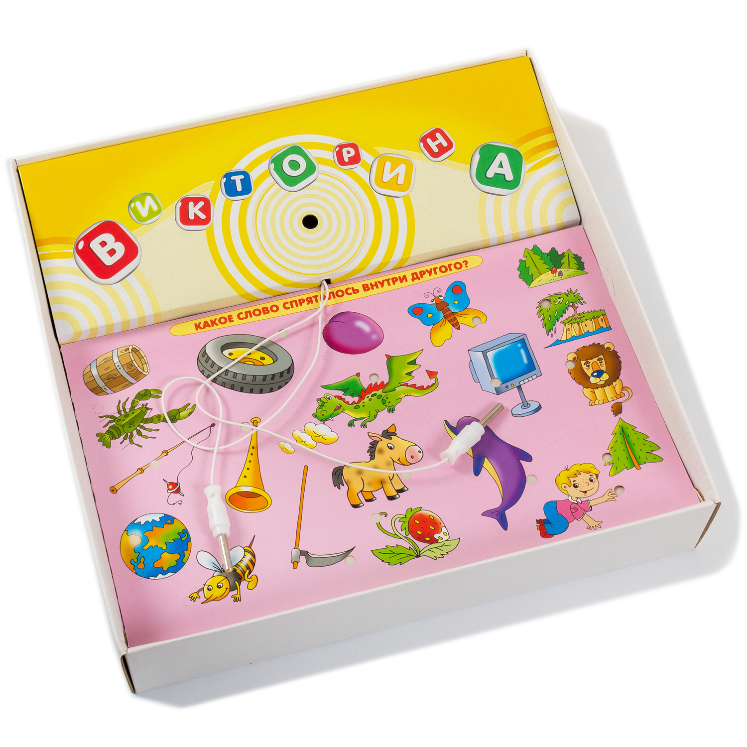 В комплекте: 10 двусторонних карточек, плата, светозвуковой модуль, батарейки, правила с ответами.