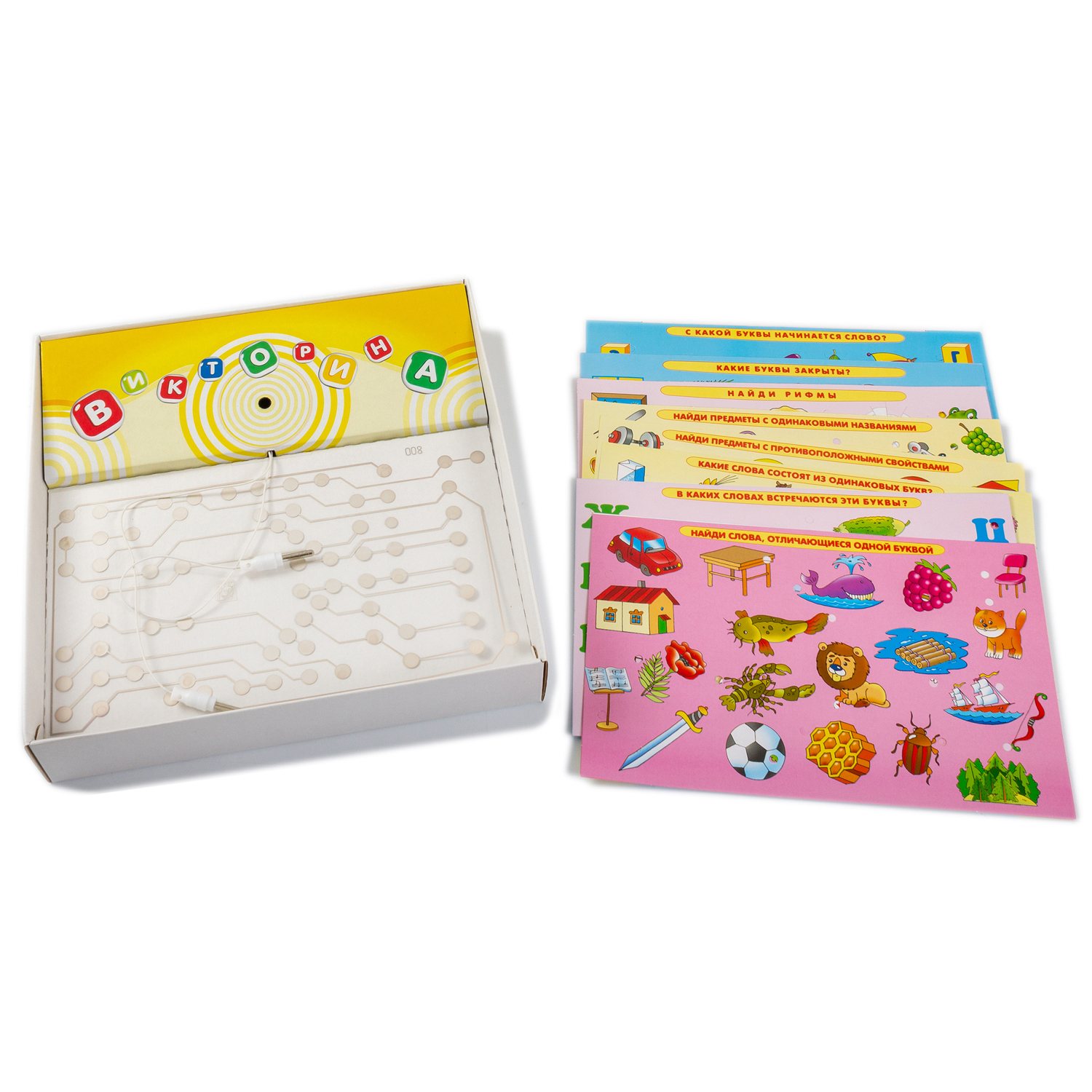 Электронная плата, используемая в наших играх, — универсальна. Поэтому, если у вас есть одна электровикторина, то вам не нужно покупать другие игры в коробках, а достаточно приобрести наборы карточек на другие темы.