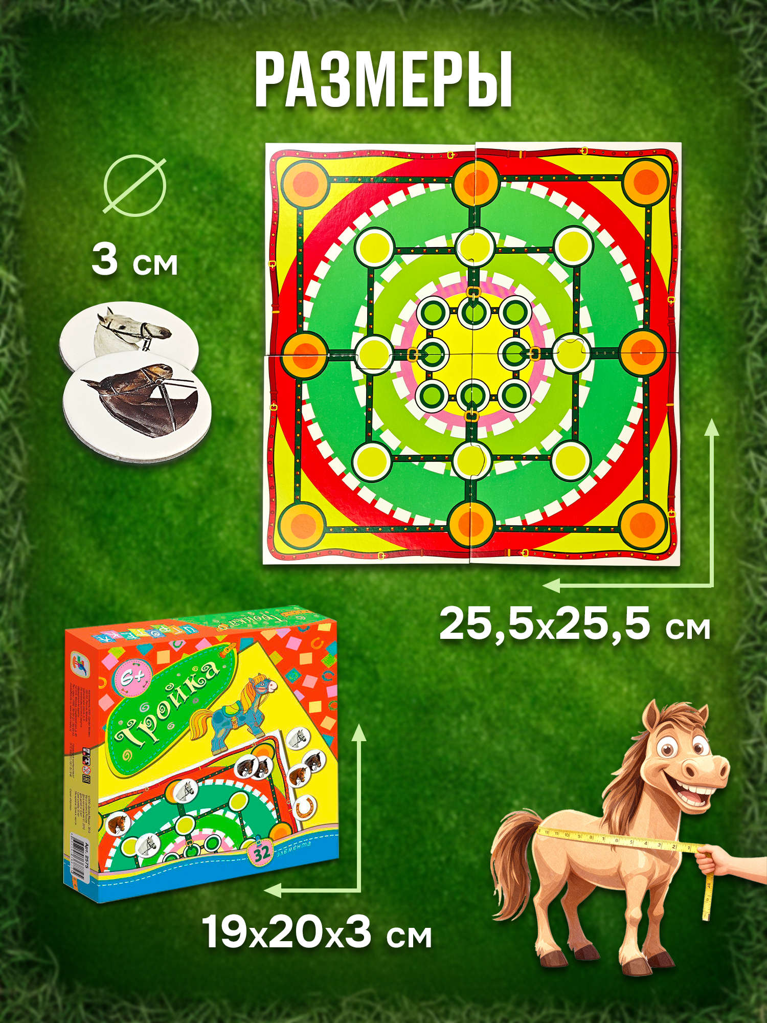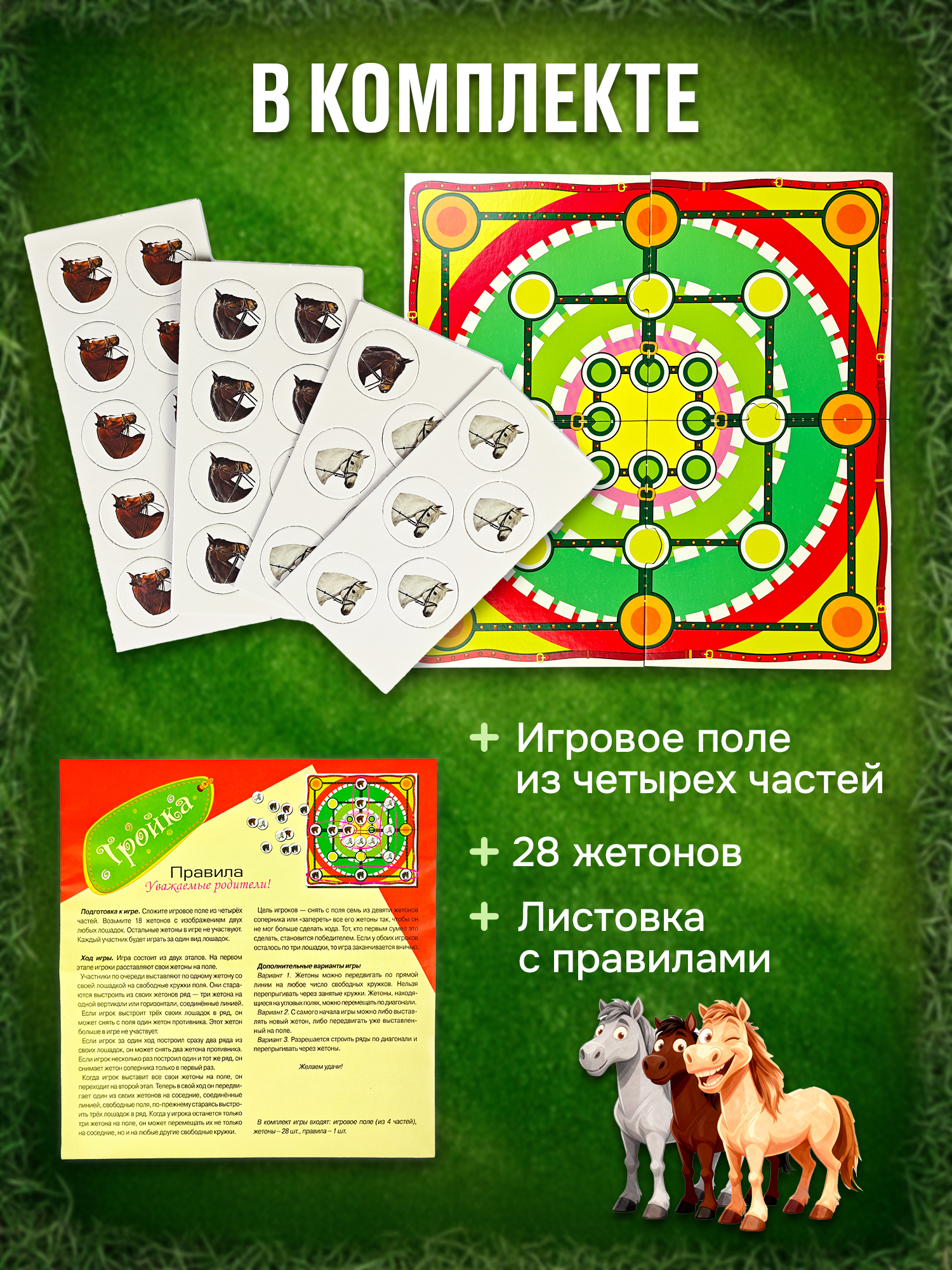 В комплекте: игровое поле (из 4 частей), 28 жетонов, правила.