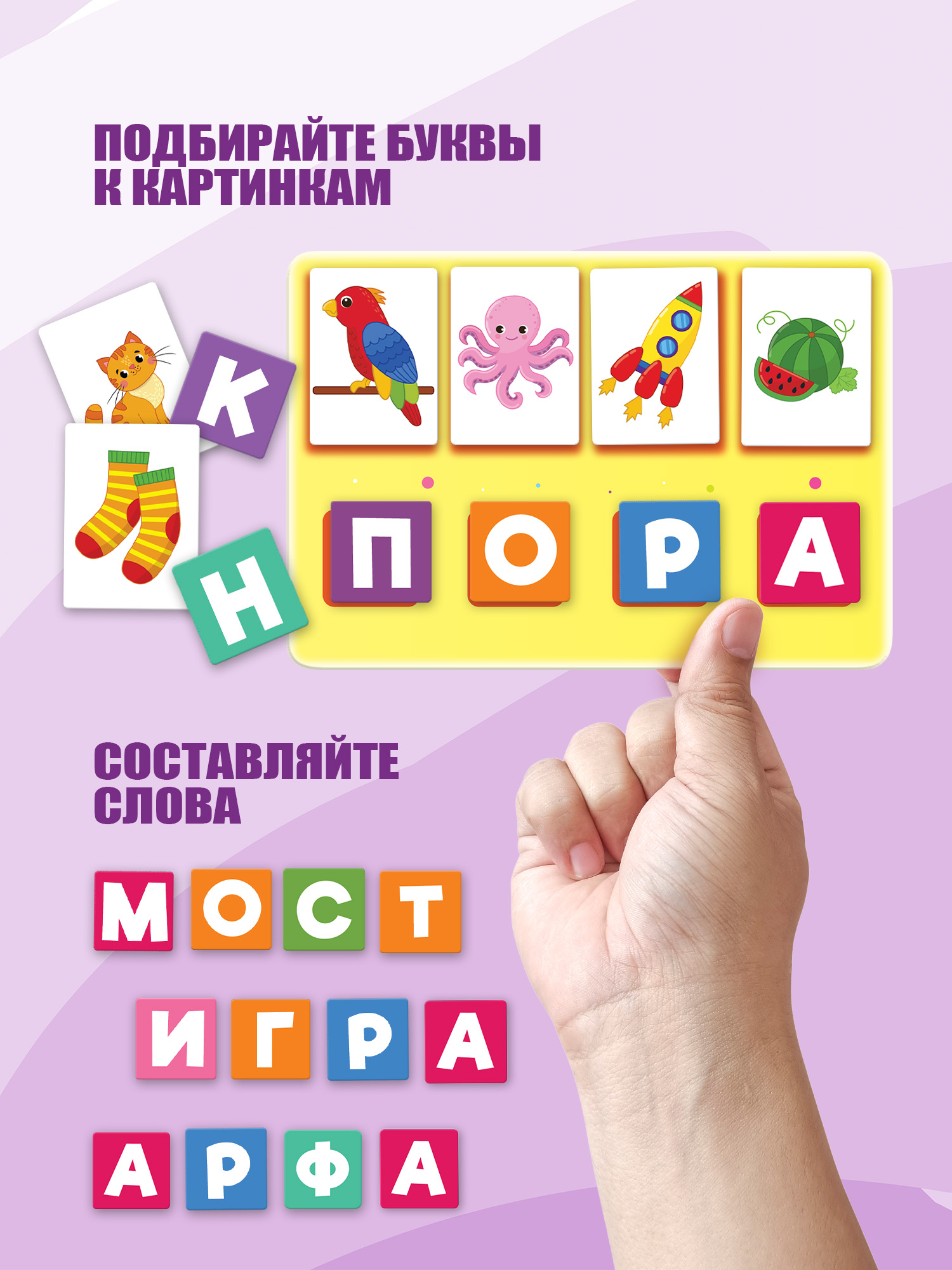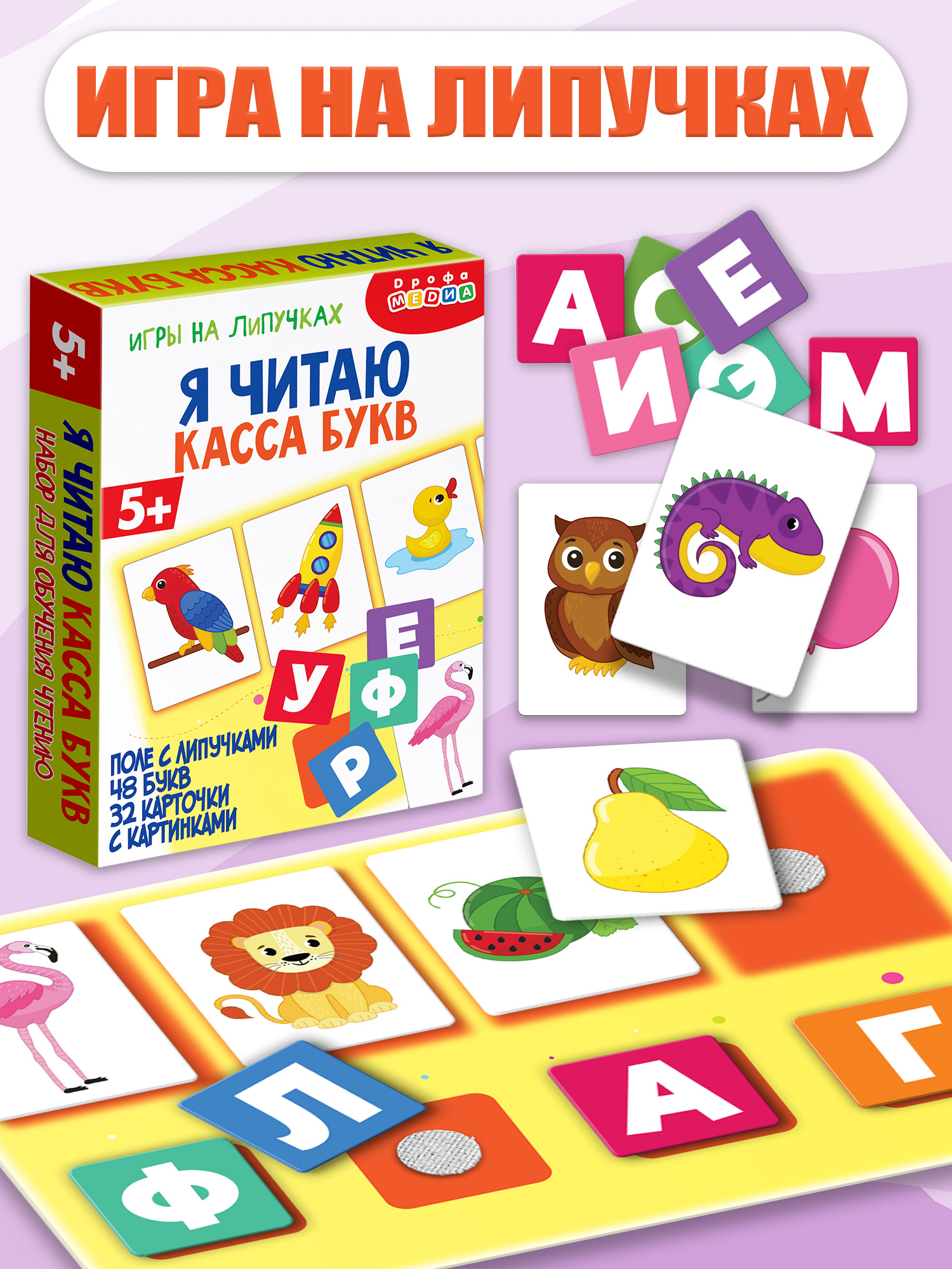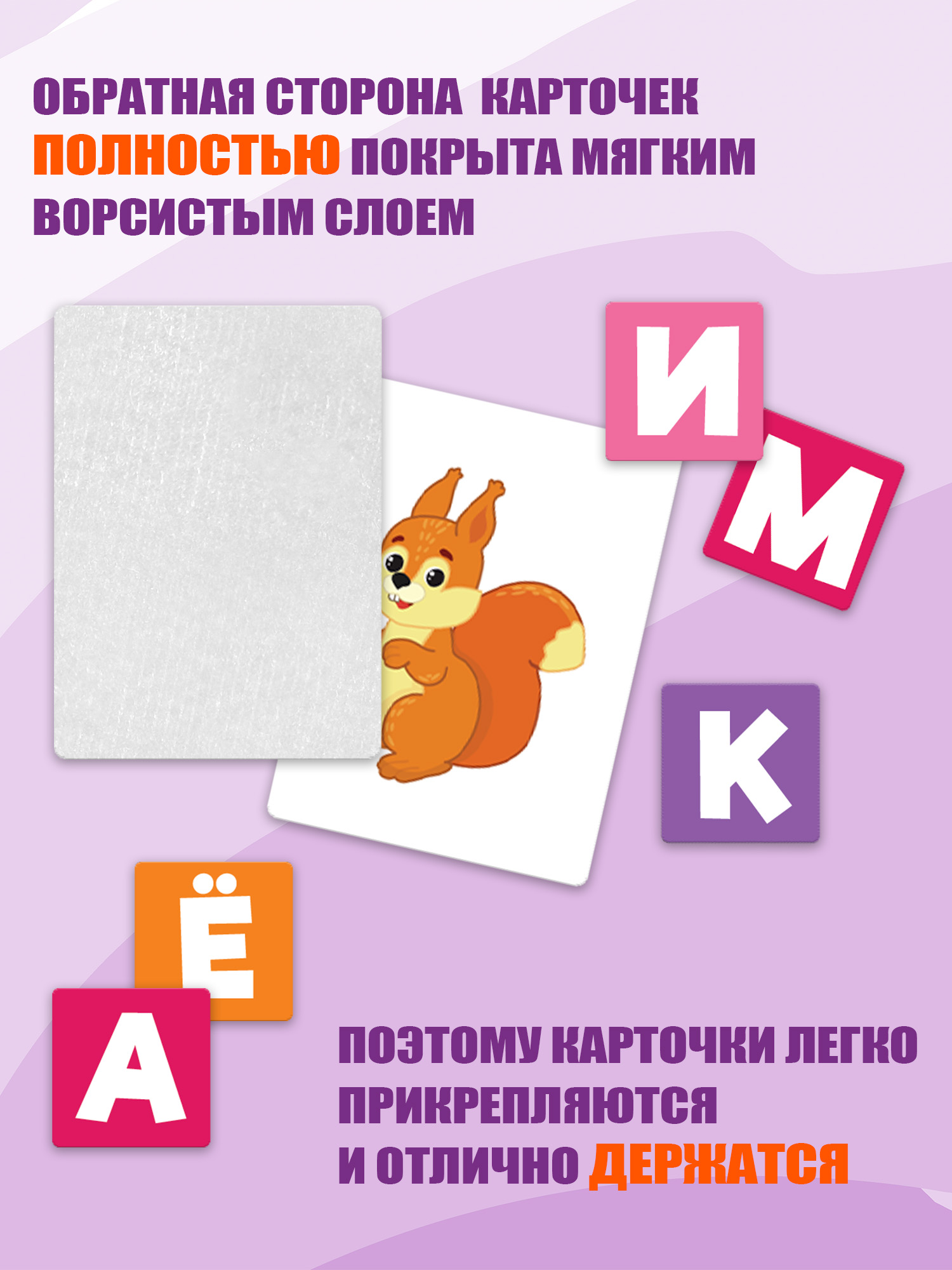 Карточки крепятся на игровое поле с помощью липучки «велькро», как на одежде и обуви. На поле можно составлять слова, подбирать буквы к картинкам.