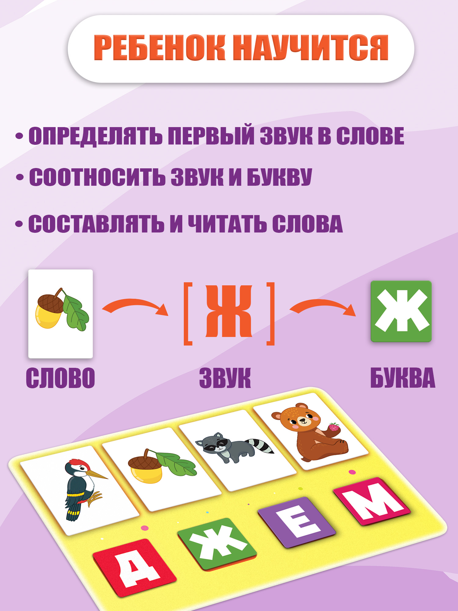 Игра для обучения чтению, учит определять первый звук в слове, соотносит звук и букву, складывать и читать слова. Развивает речь, мышление, мелкую моторику.