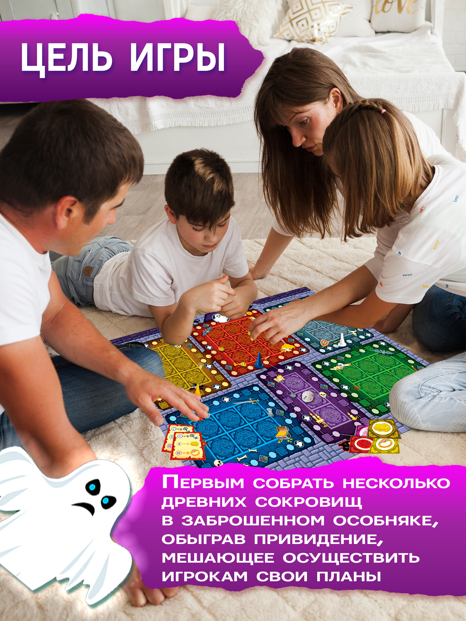 Цель игры – первым собрать на игровом поле несколько древних сокровищ, в соответствии со своей картой-заданием. Дом с привидением — идеальный выбор для семейного вечера, детской компании и любителей настольных игр.