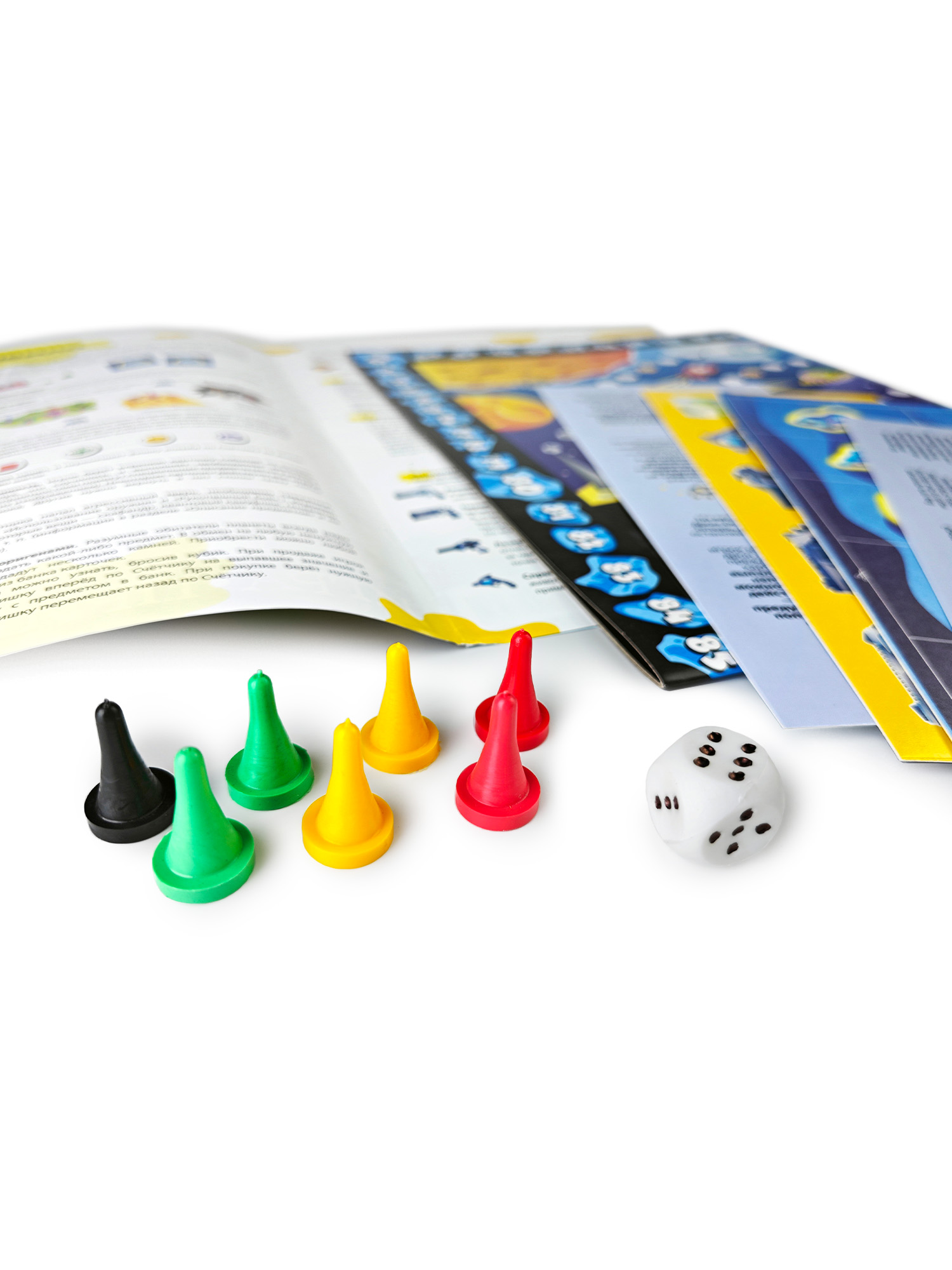 В комплекте: игровое поле, 36 карточек событий, 10 карточек предметов, 7 фишек, 1 кубик и правила.