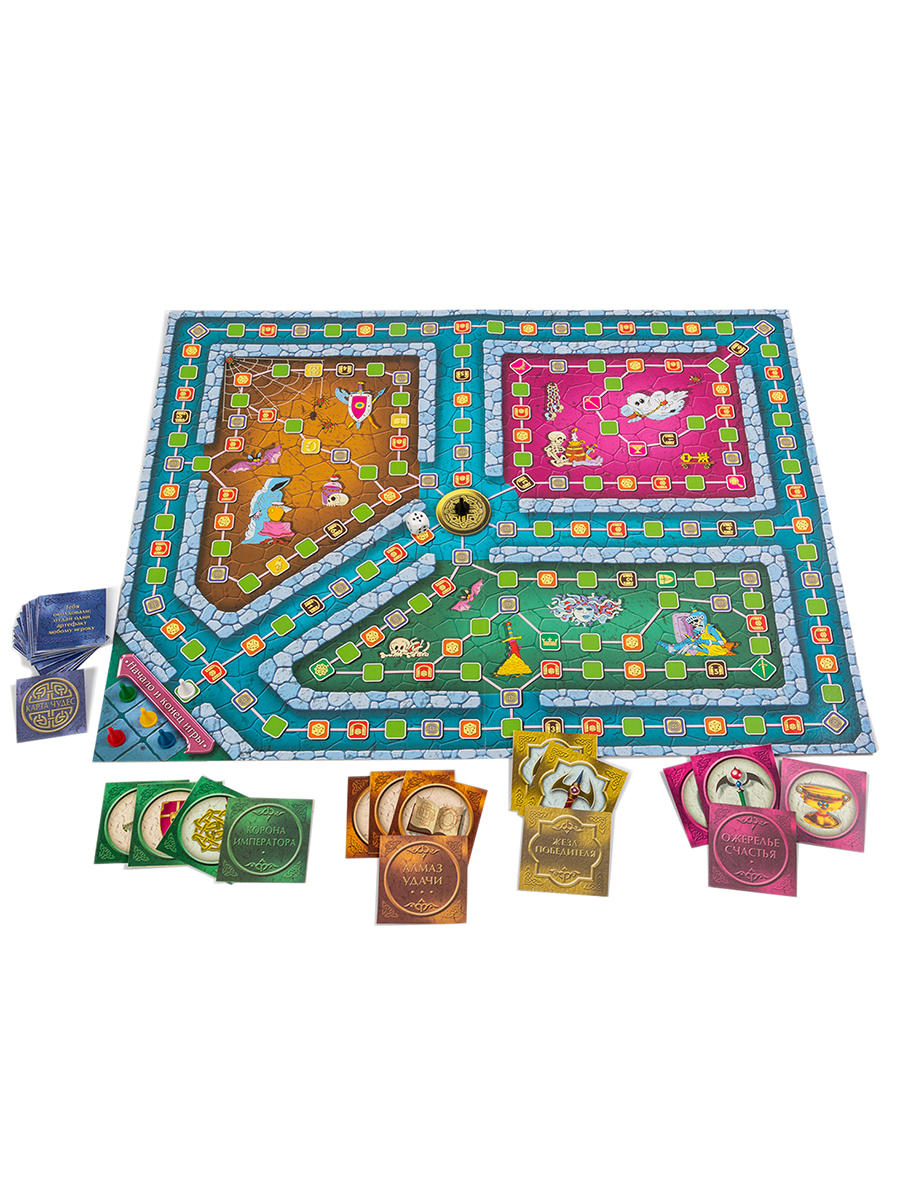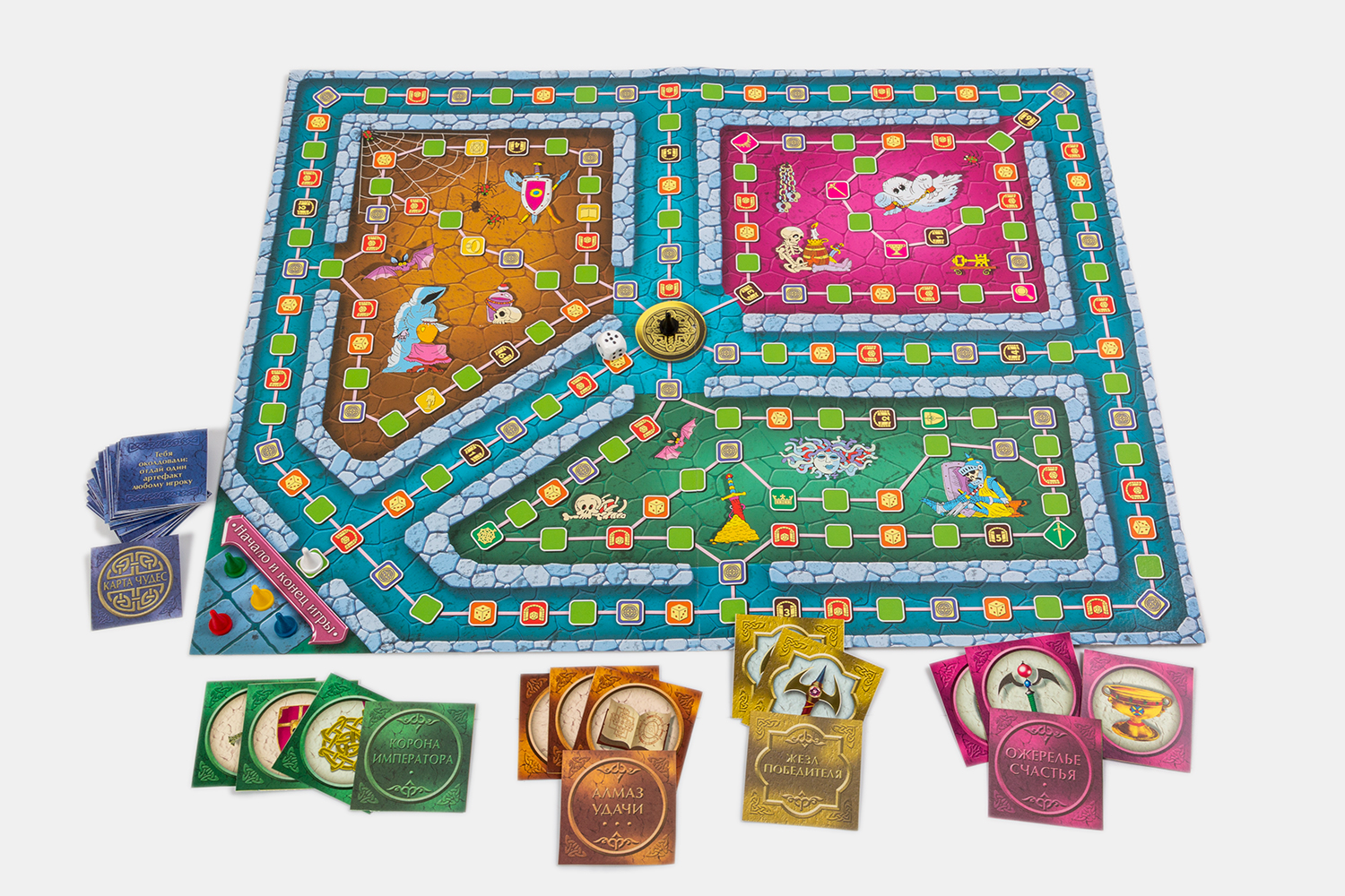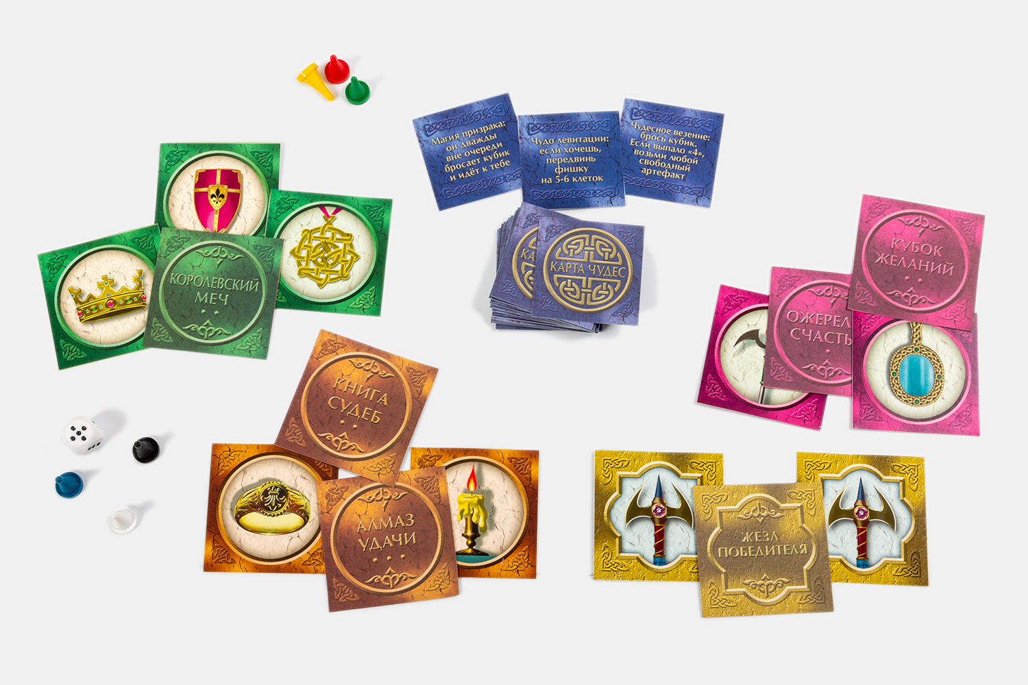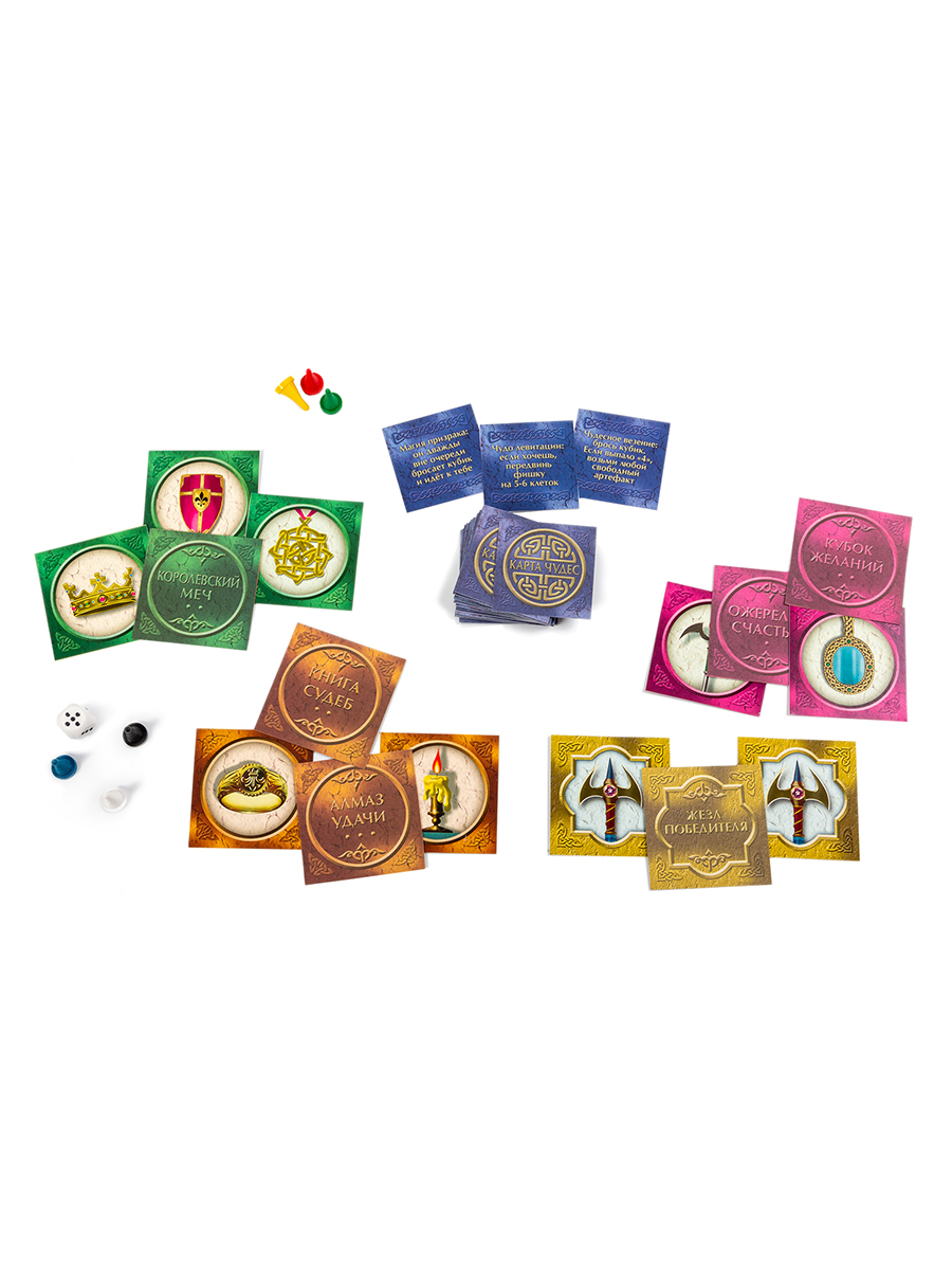 В комплекте: игровое поле, 30 карт чудес, 12 карточек магических предметов, 6 фишек, 1 кубик и правила.