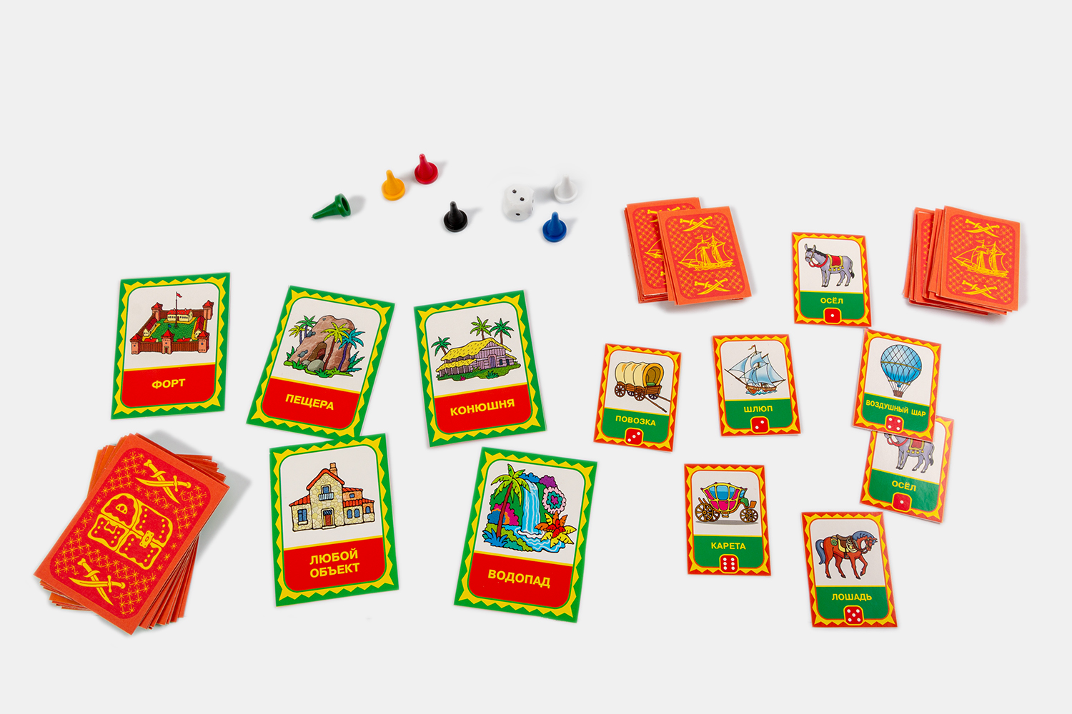 В комплекте: игровое поле, 16 карточек маршрутных объектов, 32 карточки транспорта, 6 фишек, 1 кубик и правила.