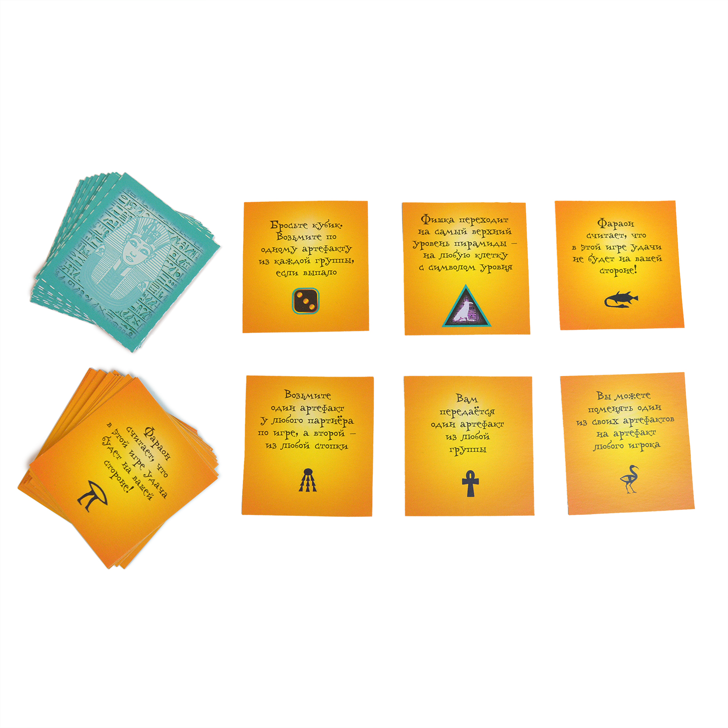 Цель – первым отыскать в пирамиде следы фараона, то есть изображения артефактов на карточках. Каждый артефакт разбит на четыре части, разбросанные по всей пирамиде. Тот, кто первым соберёт 4 части, из которых можно сложить целый артефакт, становится победителем.