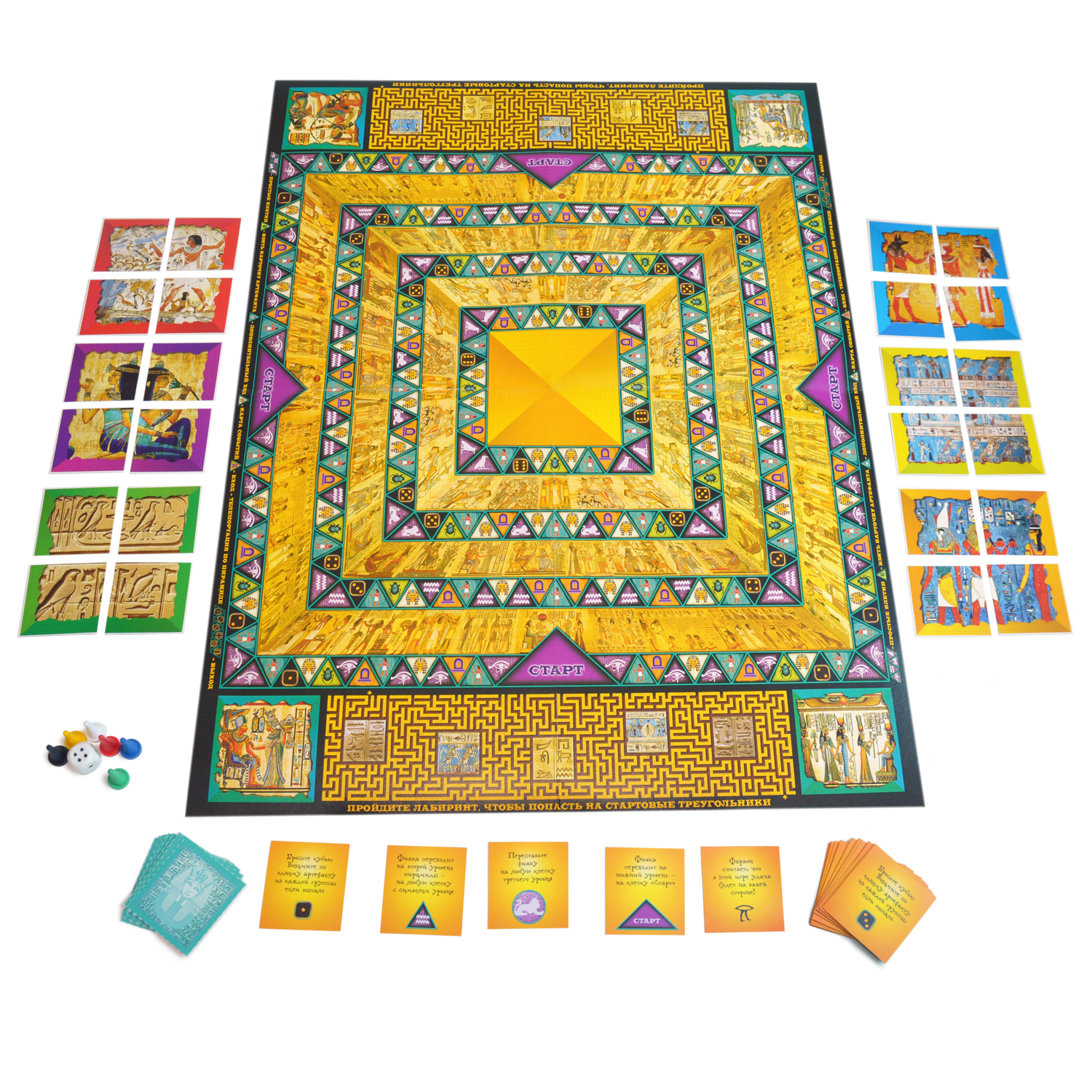 В комплекте: игровое поле, 30 карточек событий, 24 карточки артефактов, 6 фишек, кубик, правила.