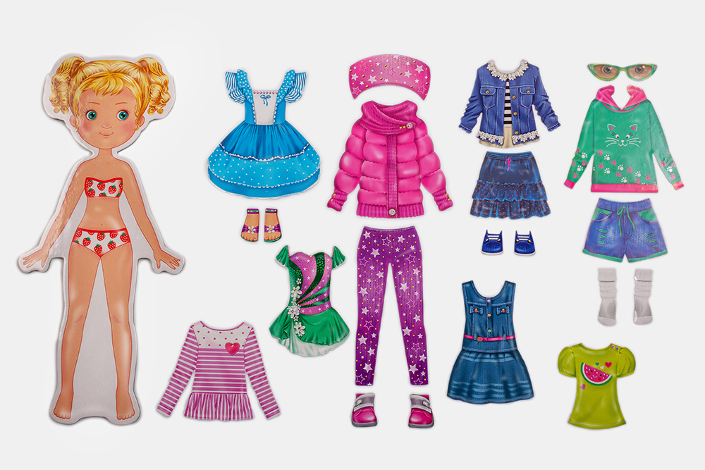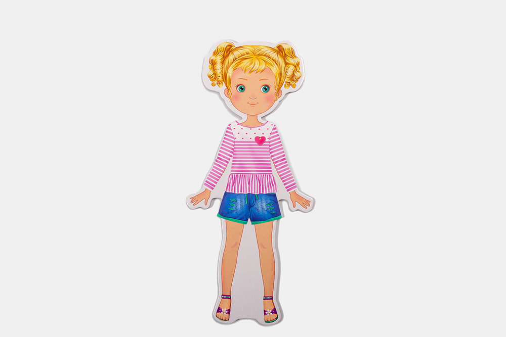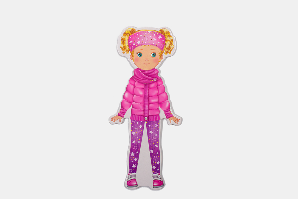 В набор входит куколка и её наряды. Одежда представляет собой статик-стикеры. Это тонкий материал без клеевого слоя, он не прилипает к рукам, но отлично держится на куклах, даже если наряды наклеены в два слоя. Девочкам не придётся вырезать кукольную одежду и придерживать её руками во время игры, чтобы наряд не слетел. Нужно просто отделить нужный элемент гардероба от основы и приклеить его на куклу.