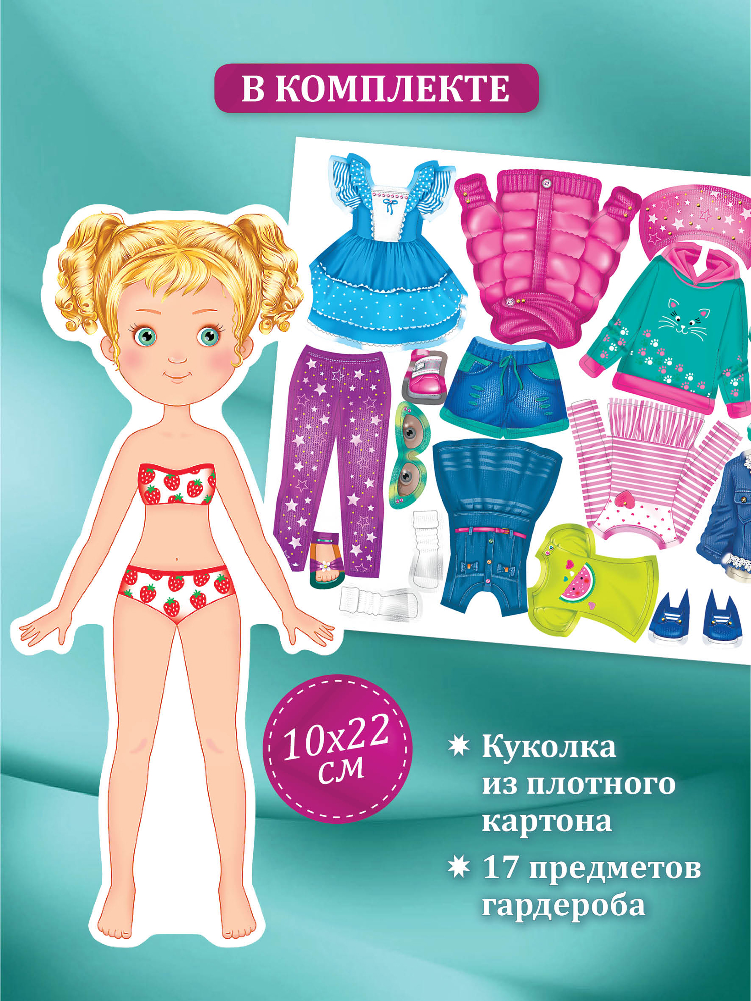 Сама кукла выполнена из плотного картона, её не так просто порвать или помять. Размеры куклы 10х21,5 см.