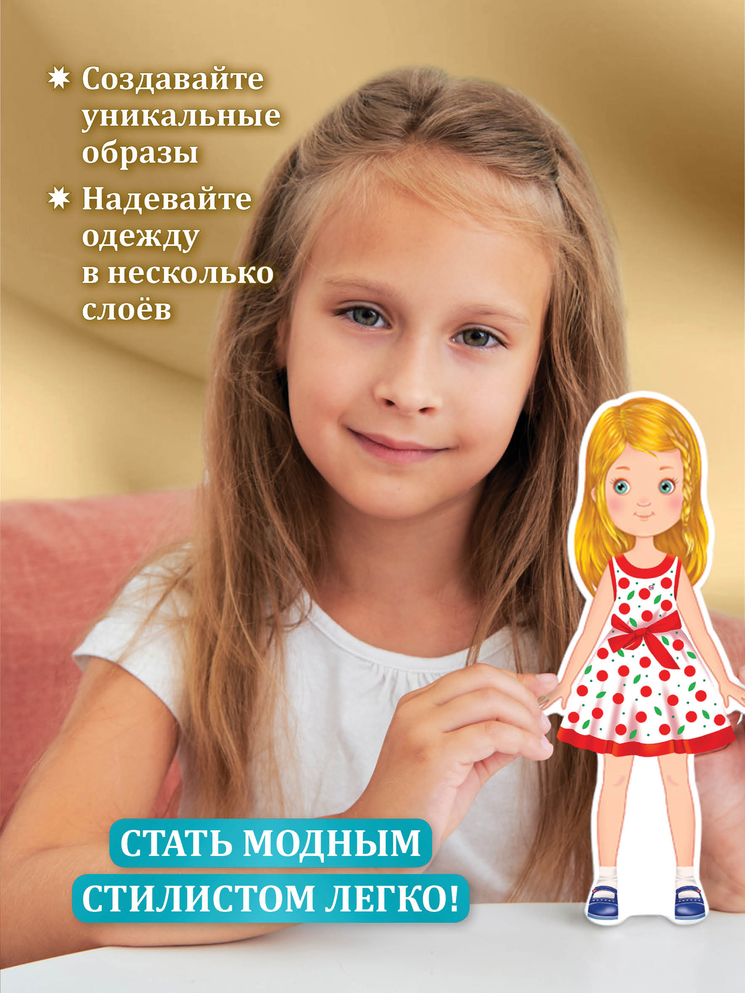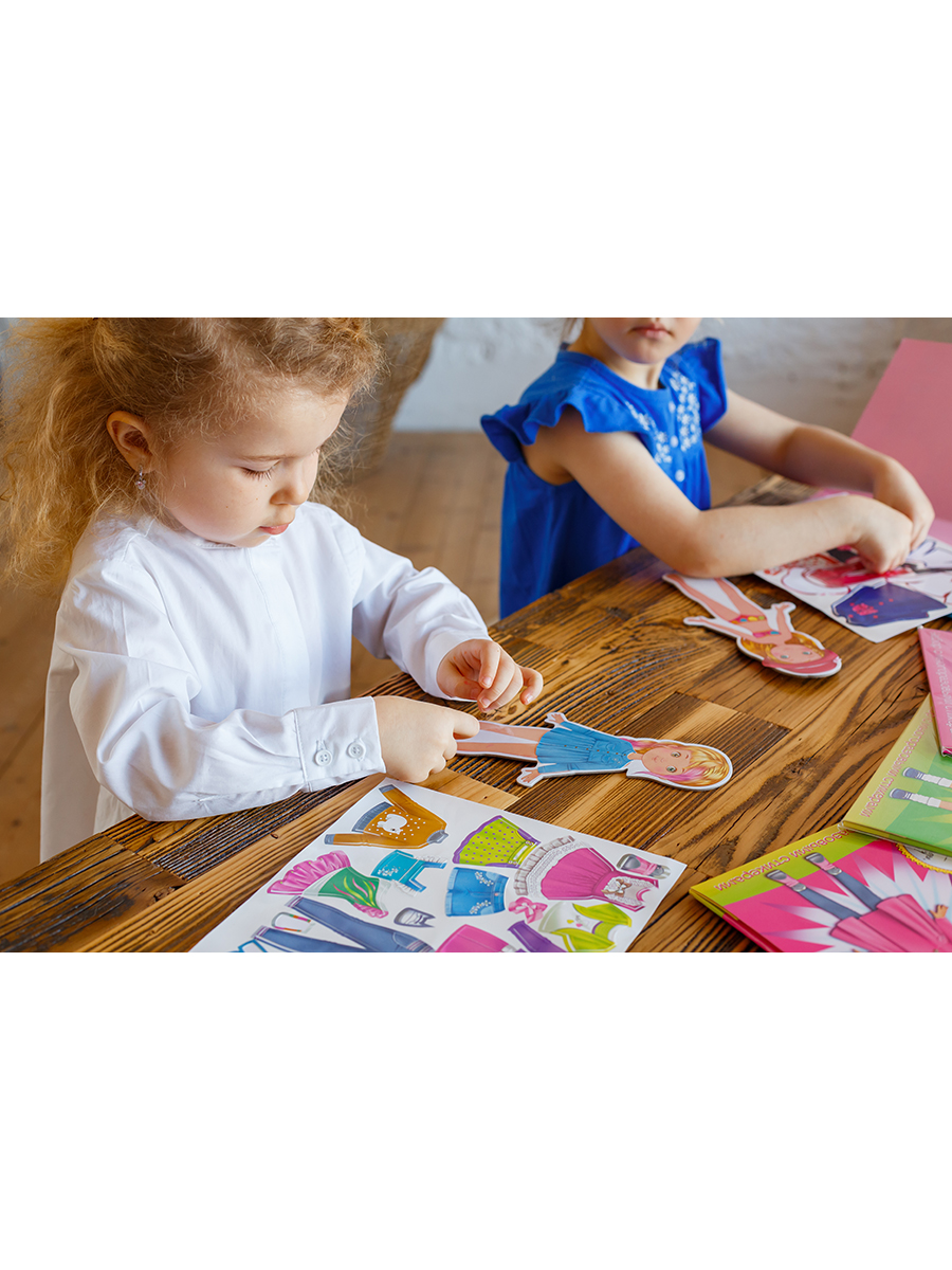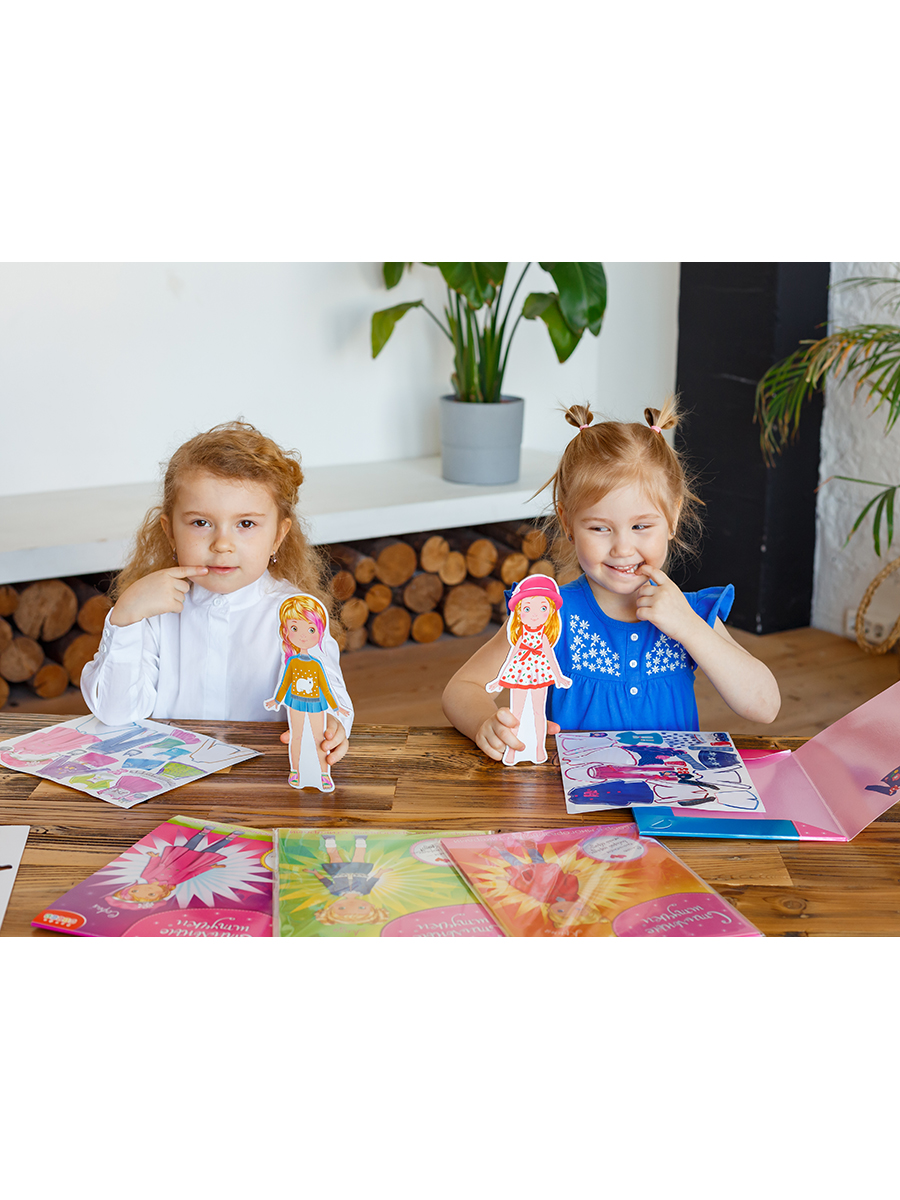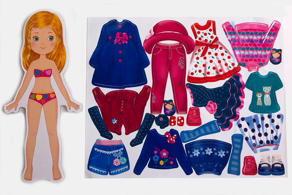 В набор входит куколка и её наряды. Одежда представляет собой статик-стикеры. Это тонкий материал без клеевого слоя, он не прилипает к рукам, но отлично держится на куклах, даже если наряды наклеены в два слоя. Девочкам не придётся вырезать кукольную одежду и придерживать её руками во время игры, чтобы наряд не слетел. Нужно просто отделить нужный элемент гардероба от основы и приклеить его на куклу.