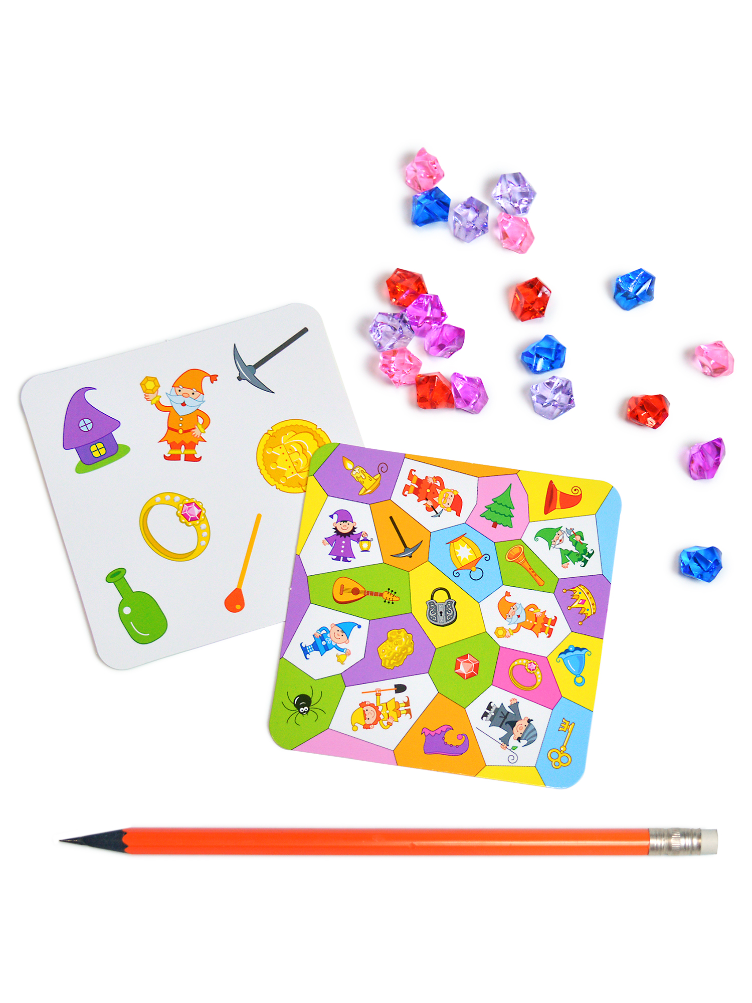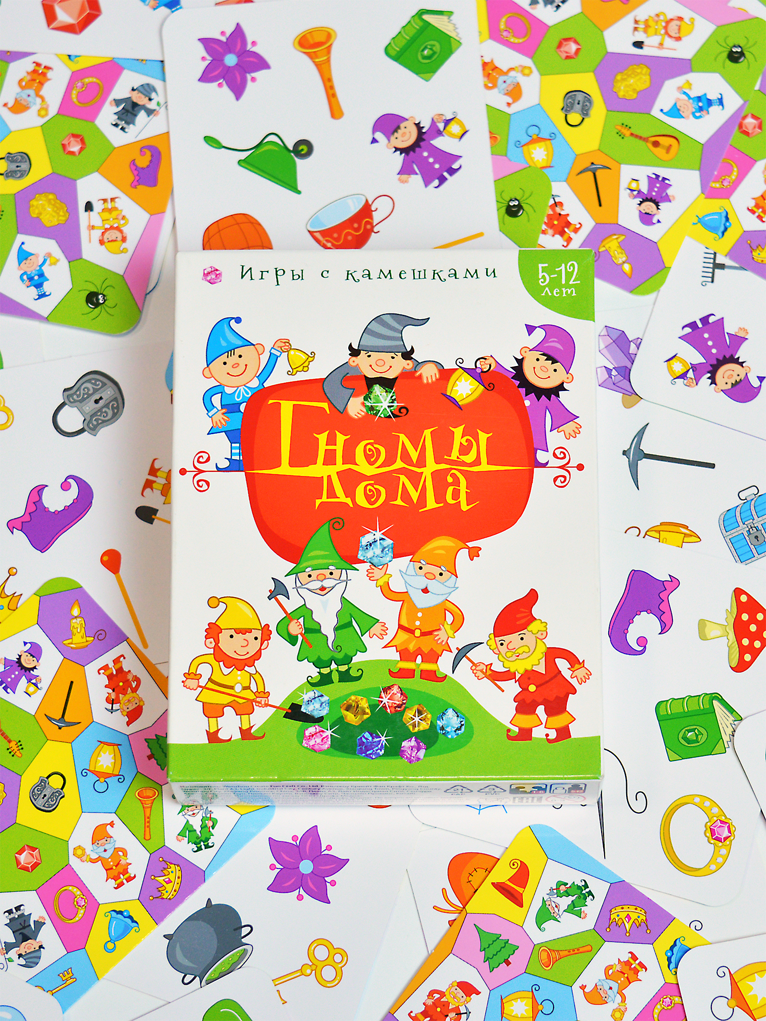 У гномов дома все вверх дном! Все смешалось на картах - камни, золото, кружки, лейки, паутины, свечки, бочки, ключи и горные топоры… Кто первым сможет найти нужный предмет? «Гномы дома» - быстрая и весёлая игра на внимание и скорость реакции. На любых двух карточках есть только одна общая картинка. Именно её и нужно найти! 5 вариантов игры.