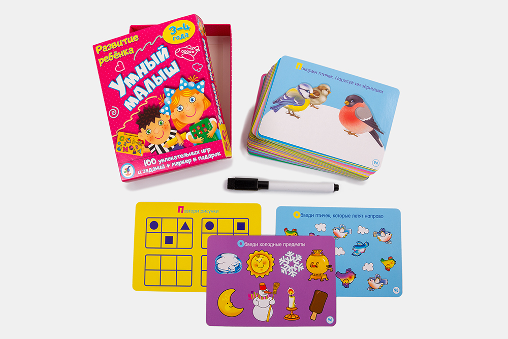 Карточная игра для детей 3-4 лет с интересными и увлекательными заданиями. Заданий много, можно выполнить все, а потом стереть, перемешать и играть снова. В процессе игры развивается внимательность, память, мышление, воображение, логика и мелкая моторика. Благодаря компактному размеру, карточки незаменимы в поездке, на даче и пикнике.