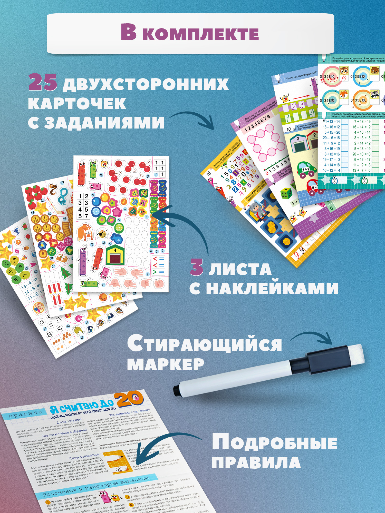 В комплекте: 25 каточек, 3 листа с наклейками, маркер, инструкция.
