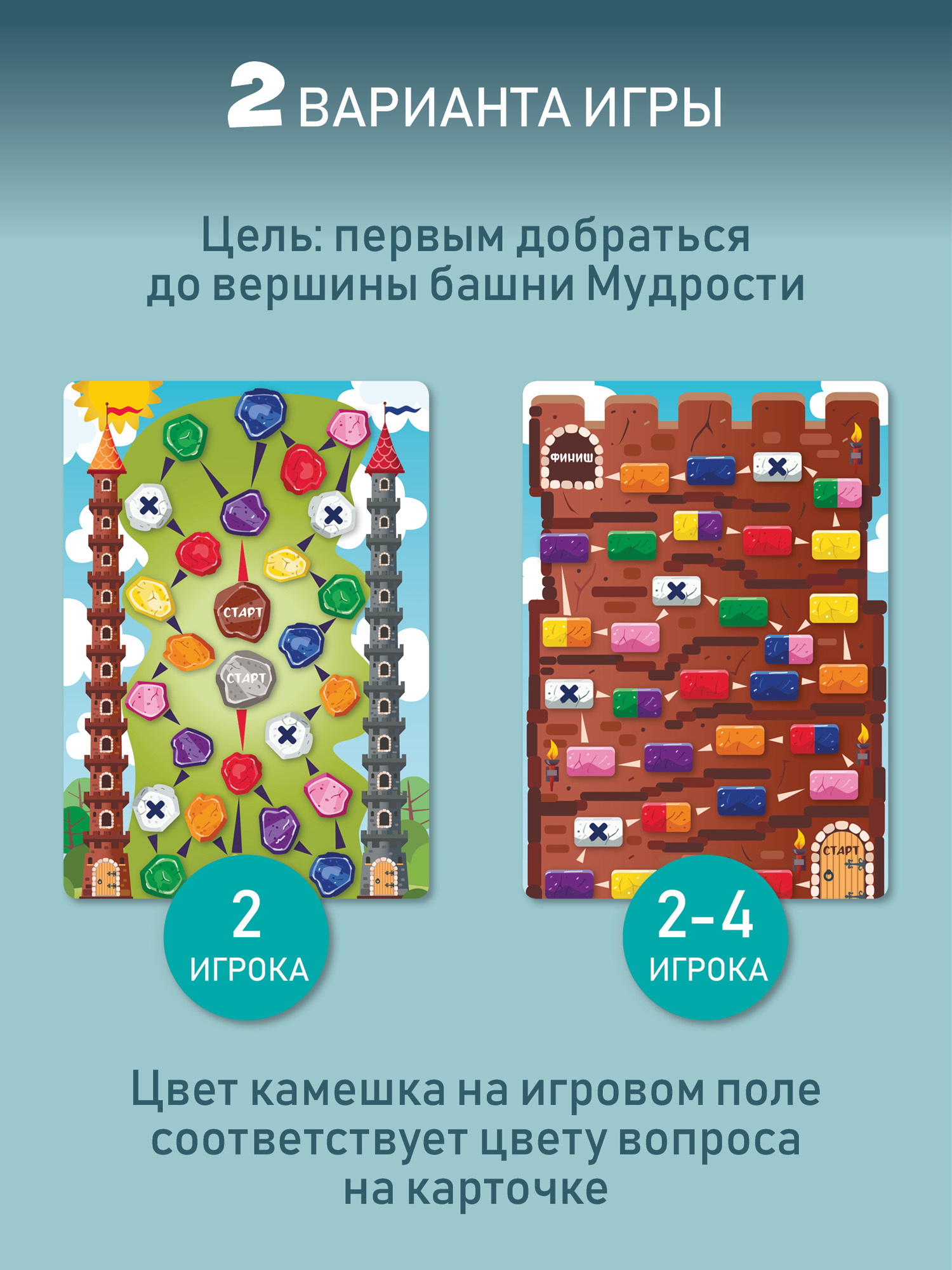 Игрокам нужно давать правильные ответы, чтобы достичь вершины башни Мудрости. В правилах 2 варианта игры. Чем больше знаешь, тем скорее победишь!