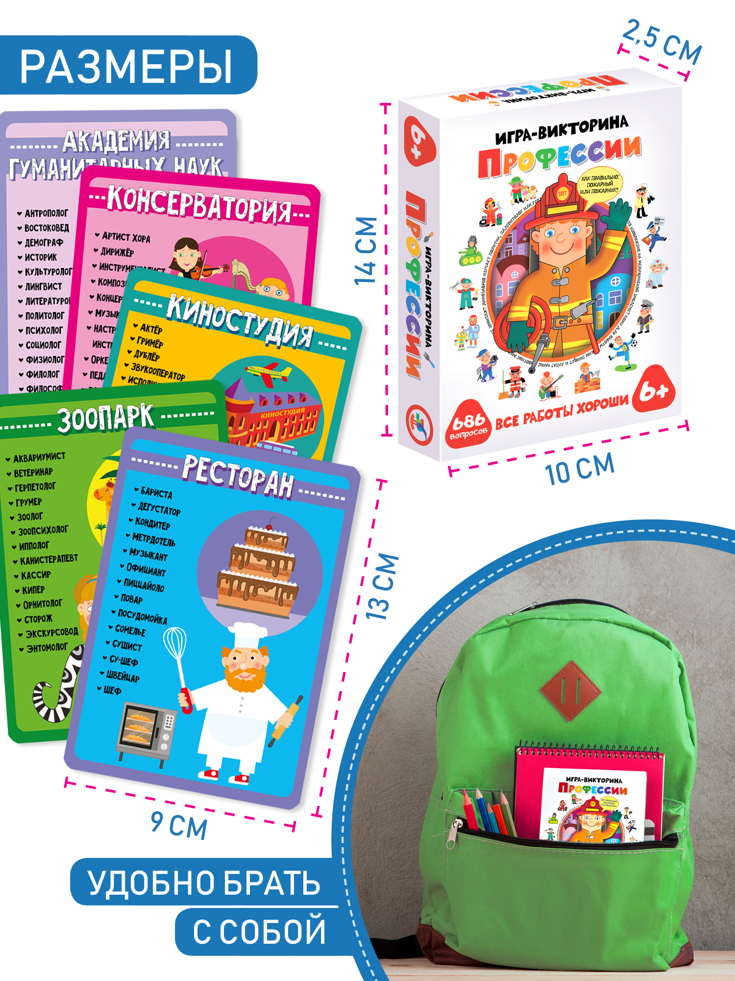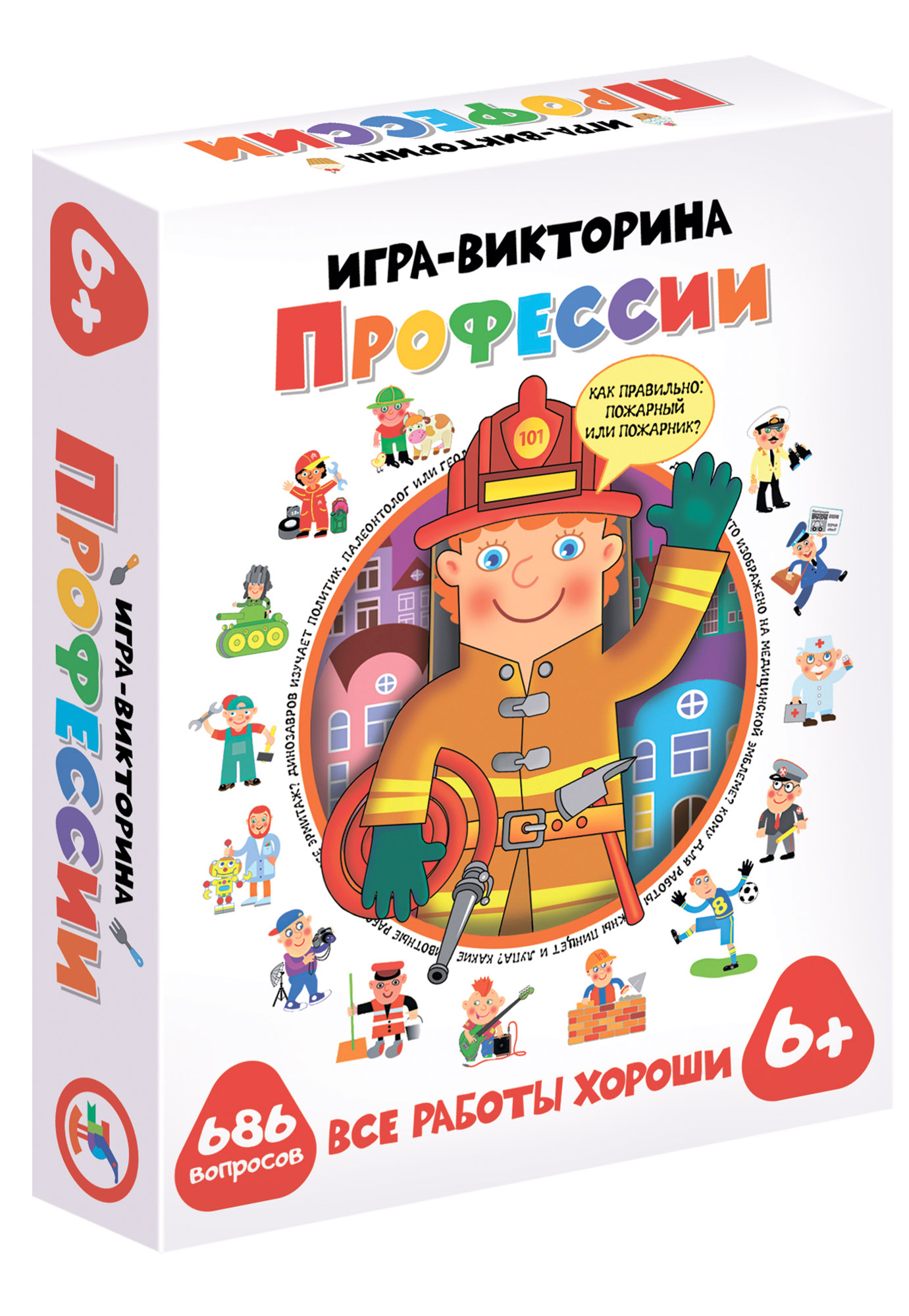 Занимательная игра-викторина позволит узнать много нового о сотнях современных профессий, таких как кинолог и ветеринар, модельер и арт-директор, микробиолог и нанотехнолог, курьер и инкассатор, продюсер и шоумен. Всего более 600 вопросов. 2 игровых мини-поля - 2 варианта игры.