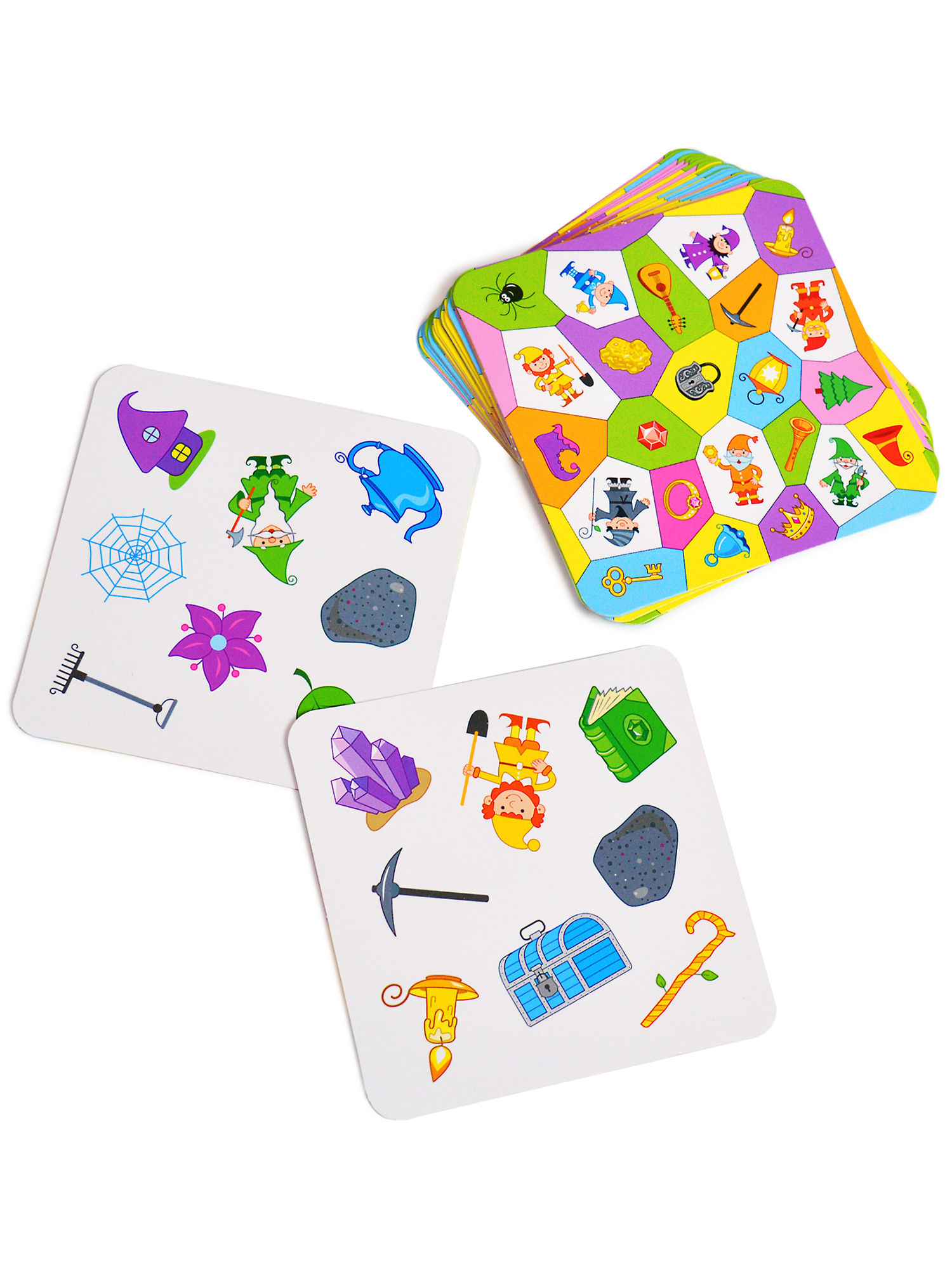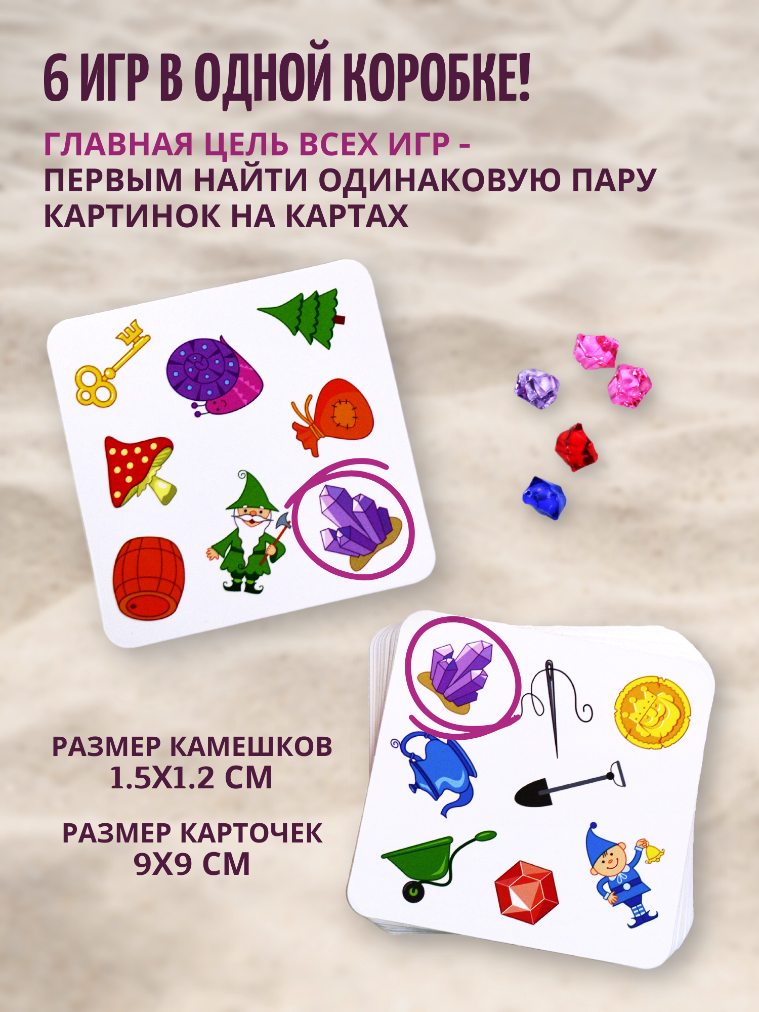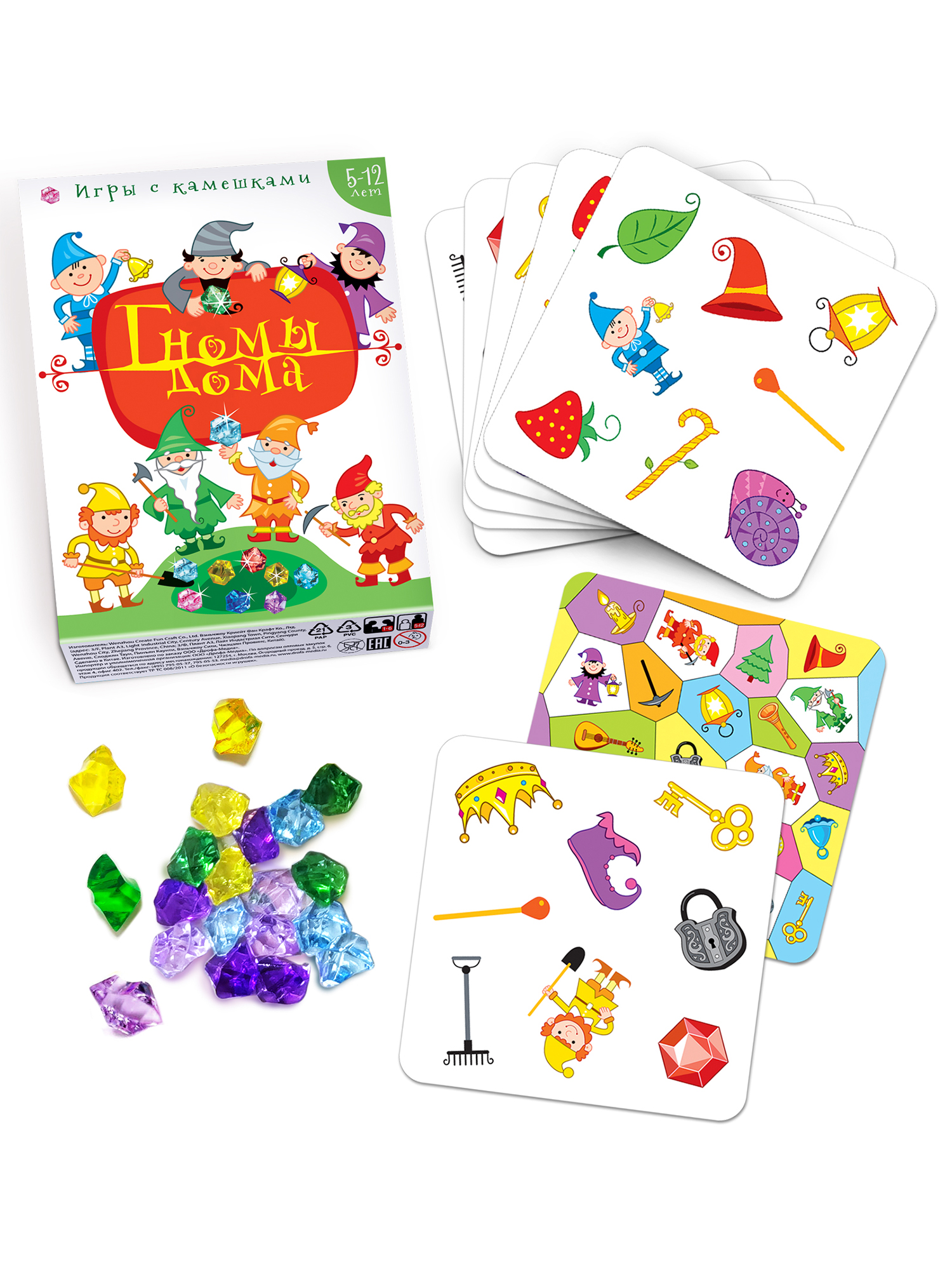 У гномов дома все вверх дном! Все смешалось на картах - камни, золото, кружки, лейки, паутины, свечки, бочки, ключи и горные топоры… Кто первым сможет найти нужный предмет? «Гномы дома» - быстрая и весёлая игра на внимание и скорость реакции. На любых двух карточках есть только одна общая картинка. Именно её и нужно найти! 5 вариантов игры.