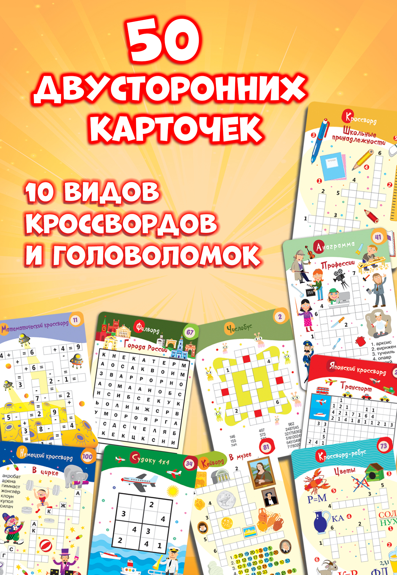 В комплекте 50 двухсторонних карточек, стирающийся маркер, брошюра с правилами и ответами.
