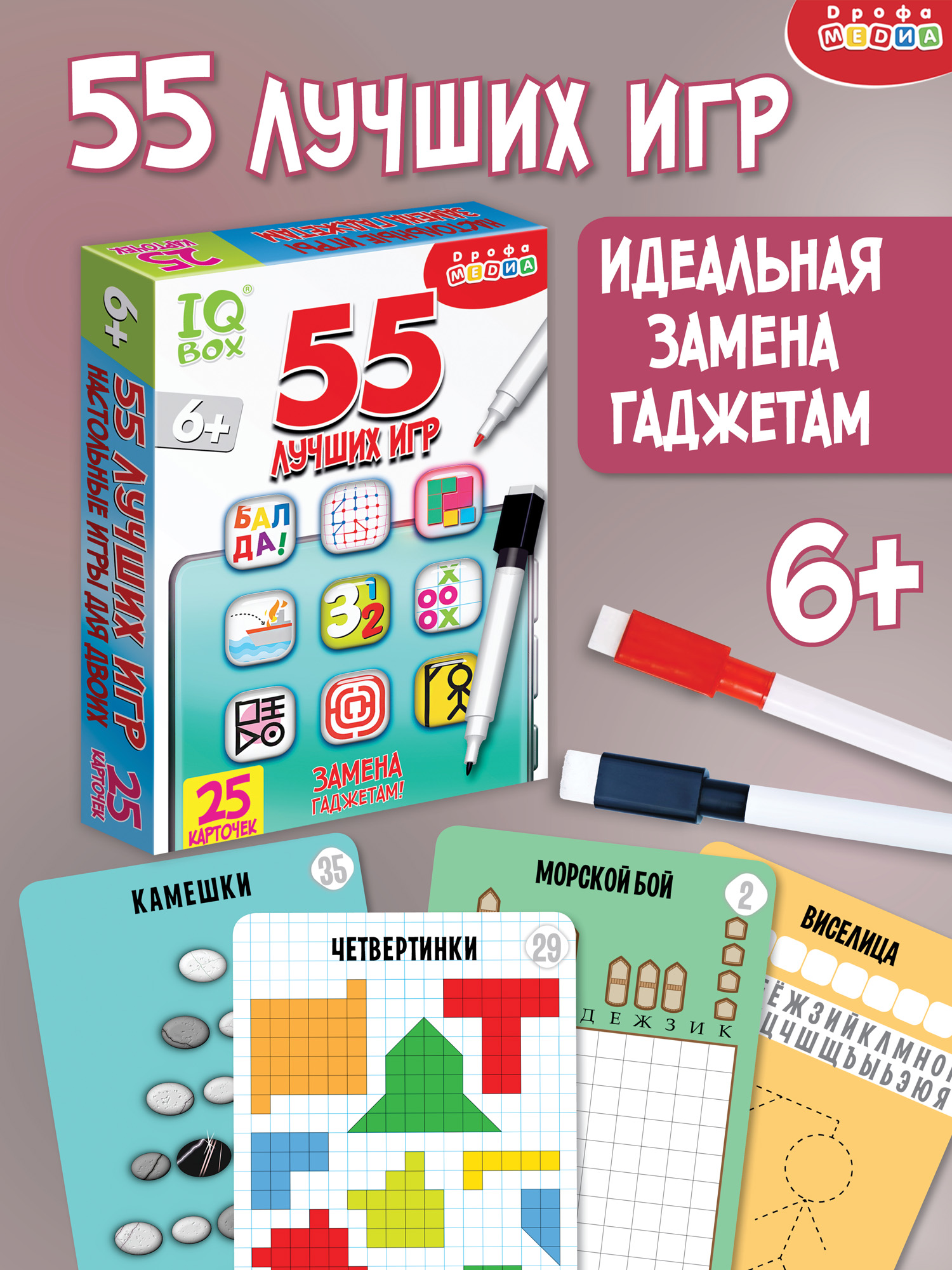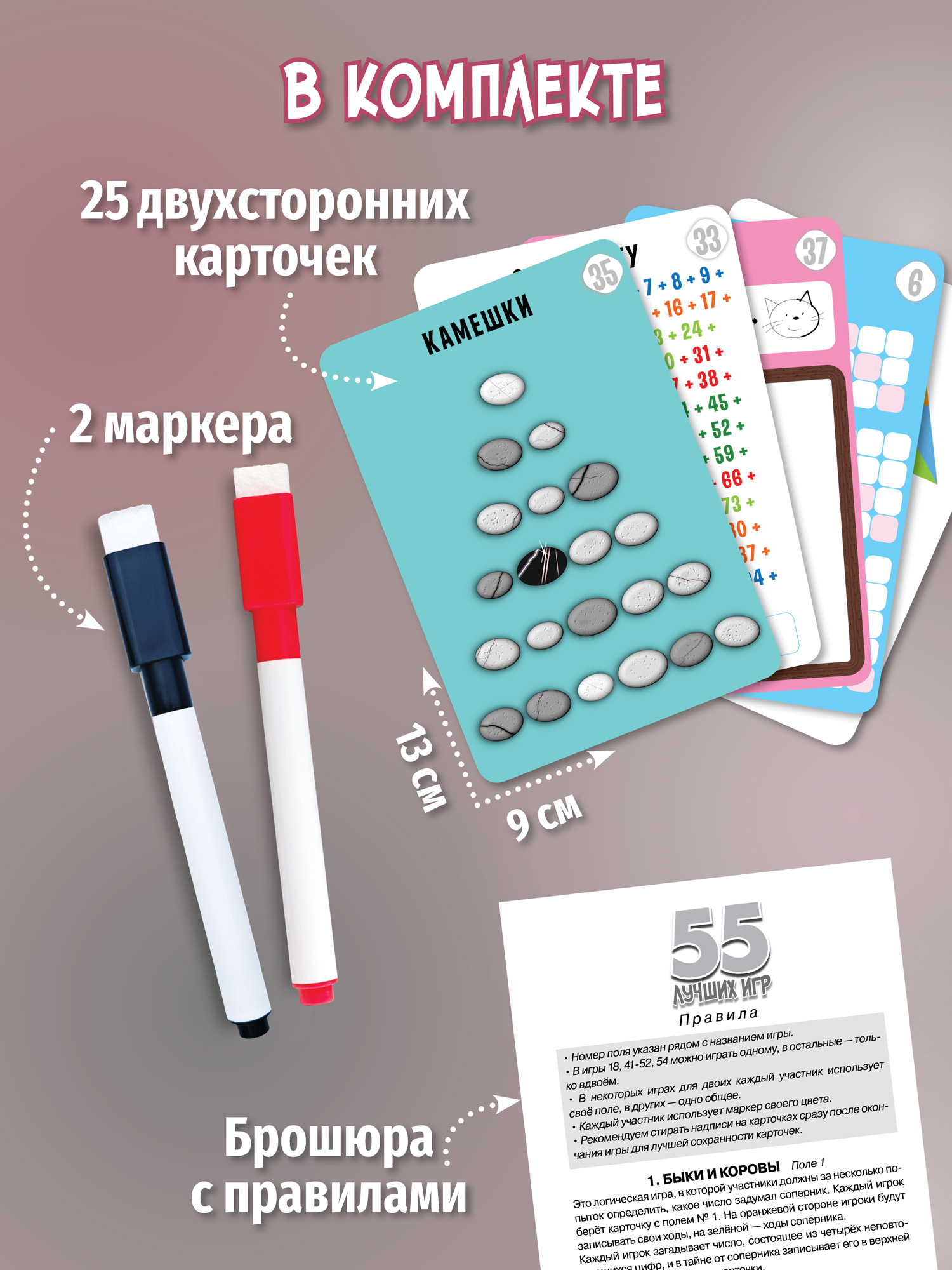 В комплекте: 25 карточек, 2 маркера, брошюра с правилами.