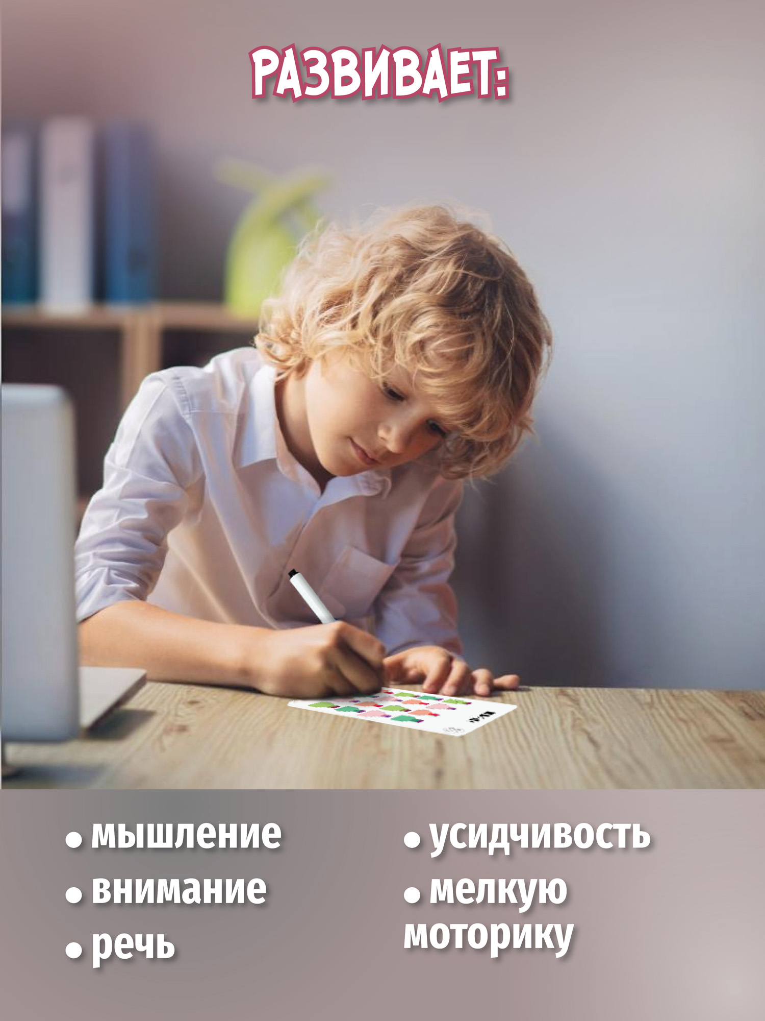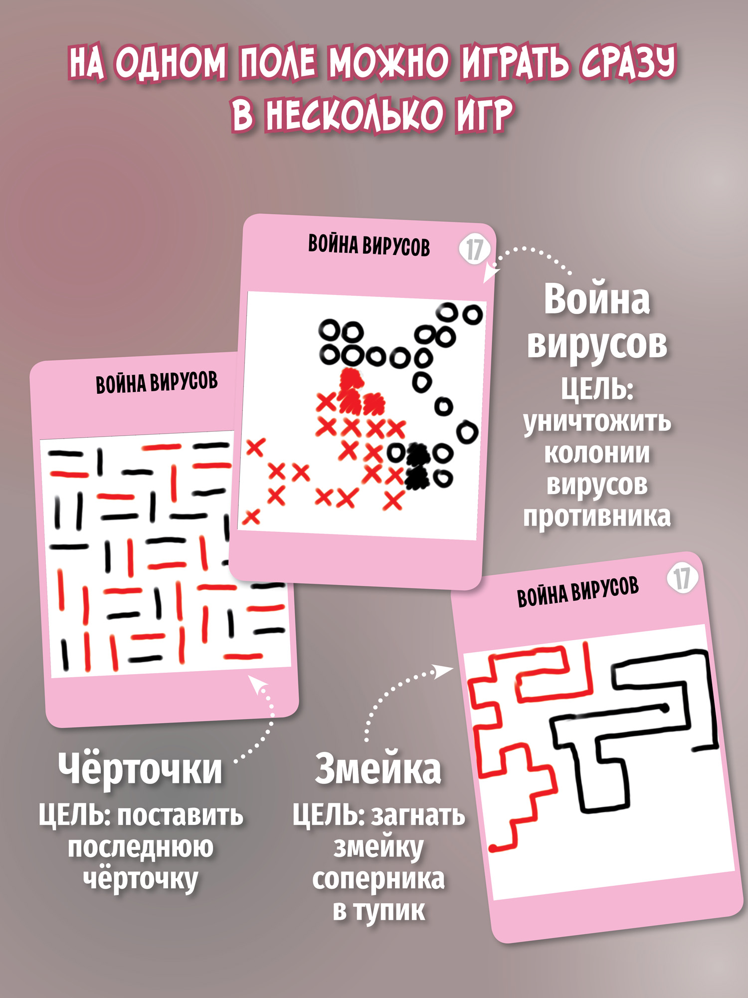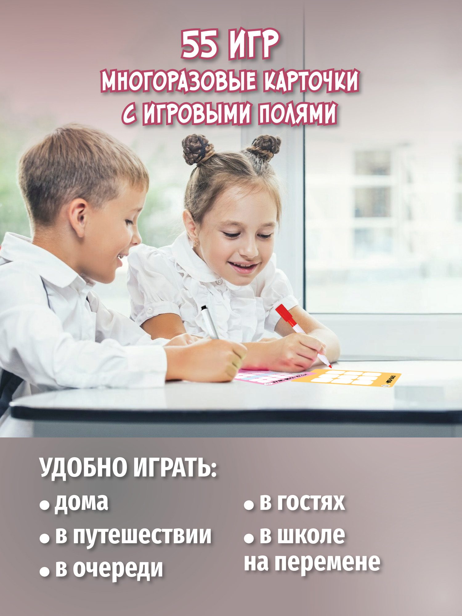 В игре 37 мини-игровых полей, два маркера и брошюра с описанием правил. Играть можно где угодно: дома, в путешествии, в школе, в очереди и даже в гостях. Традиционные игровые поля из картона и два маркера – всё, что нужно, чтобы надолго отвлечь ребёнка от гаджетов!