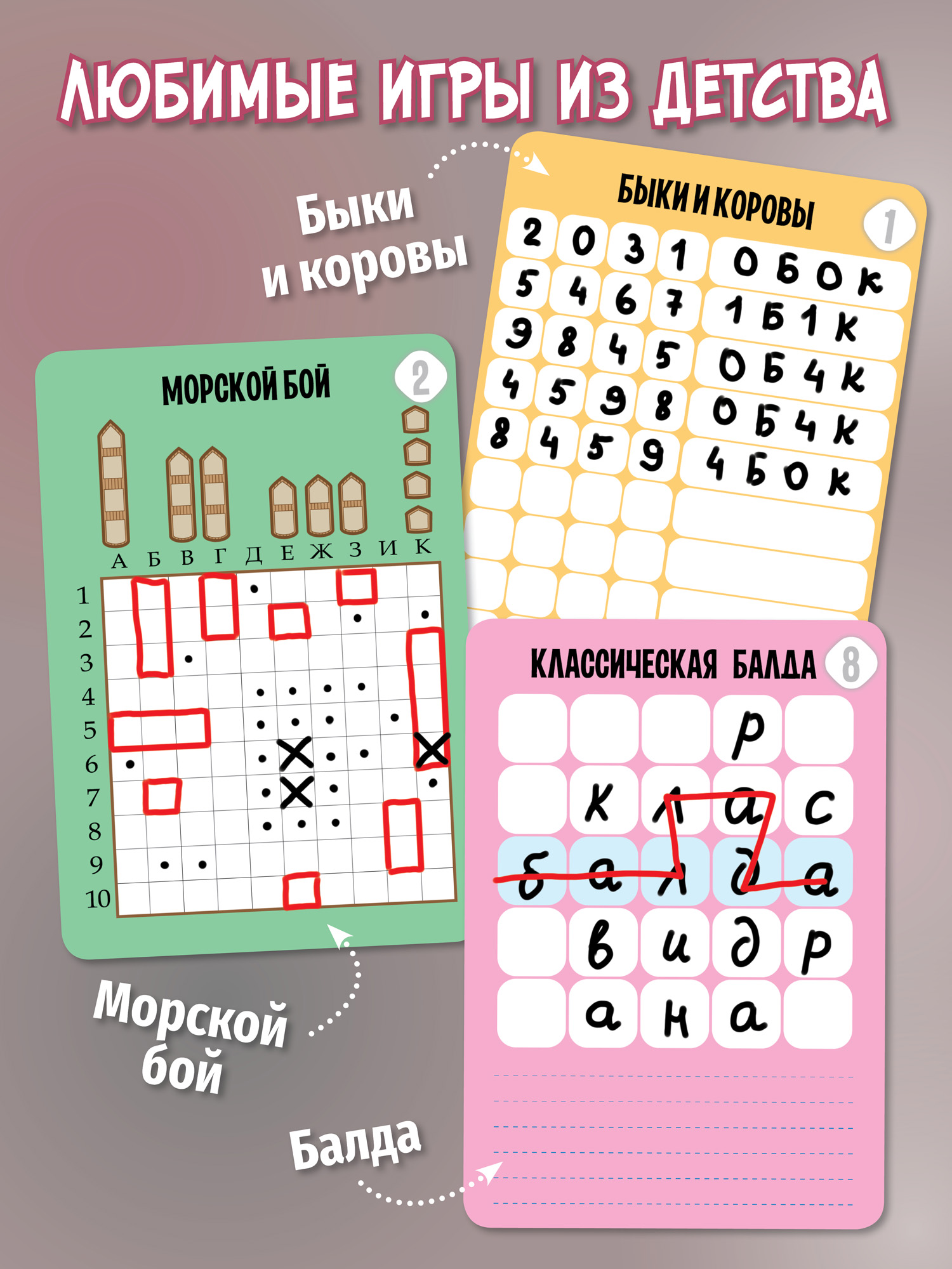 «55 ЛУЧШИХ ИГР» – это сборник любимых игр из детства для двух участников в мини-формате: морской бой, балда, быки и коровы, точки, виселица, крестики-нолики, шифры, головоломки и многое другое.