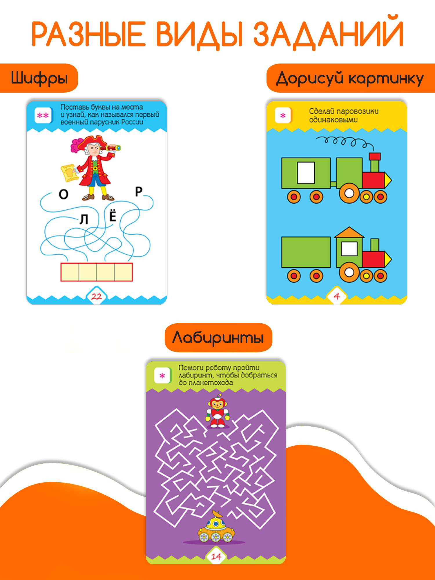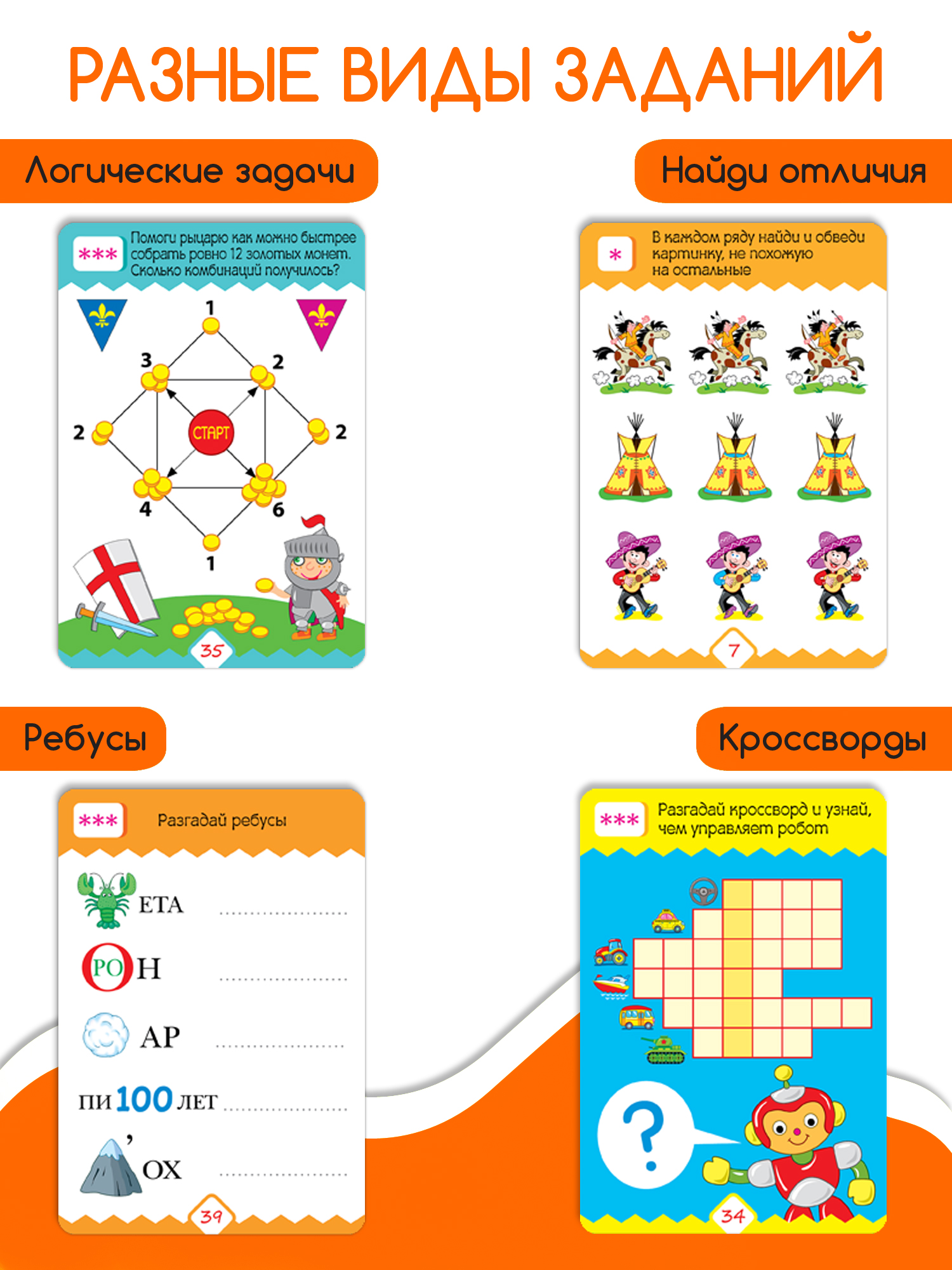 Набор карточек с задачками, лабиринтами, шифрами, ребусами, кроссвордами и другими интересными и увлекательными заданиями. Ребят ждут встречи с грозными пиратами, отважными рыцарями, древними динозаврами и высокотехнологичными роботами. 50 заданий разного уровня сложности (отмечены звёздочкой). Стирающийся маркер позволяет решать головоломки неограниченное количество раз!
