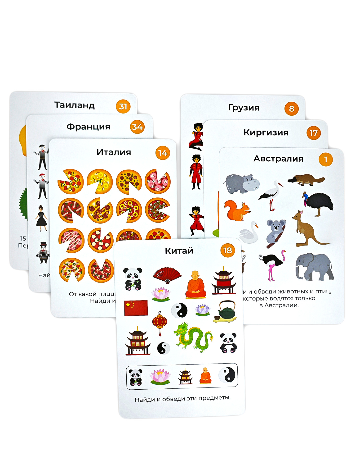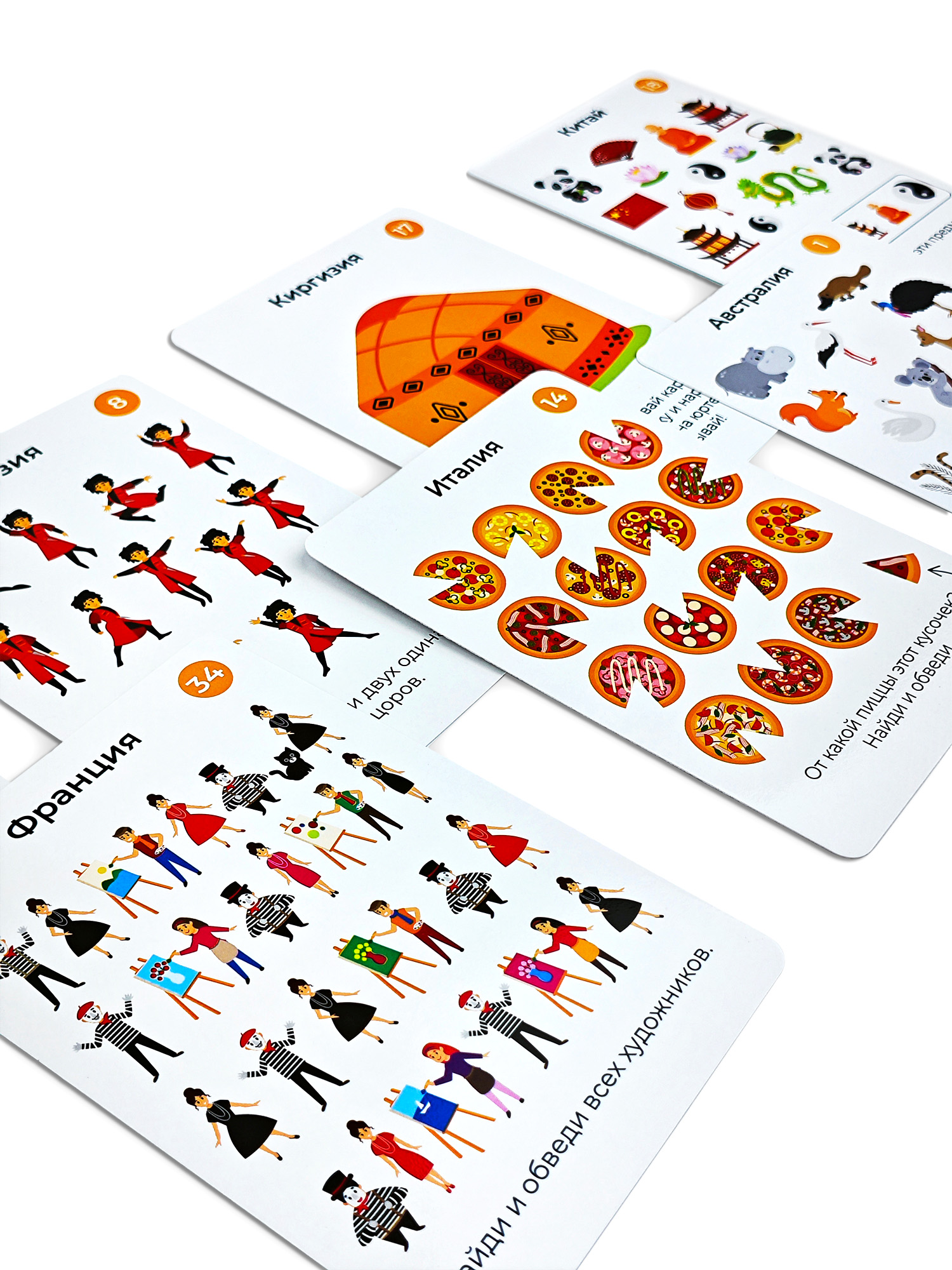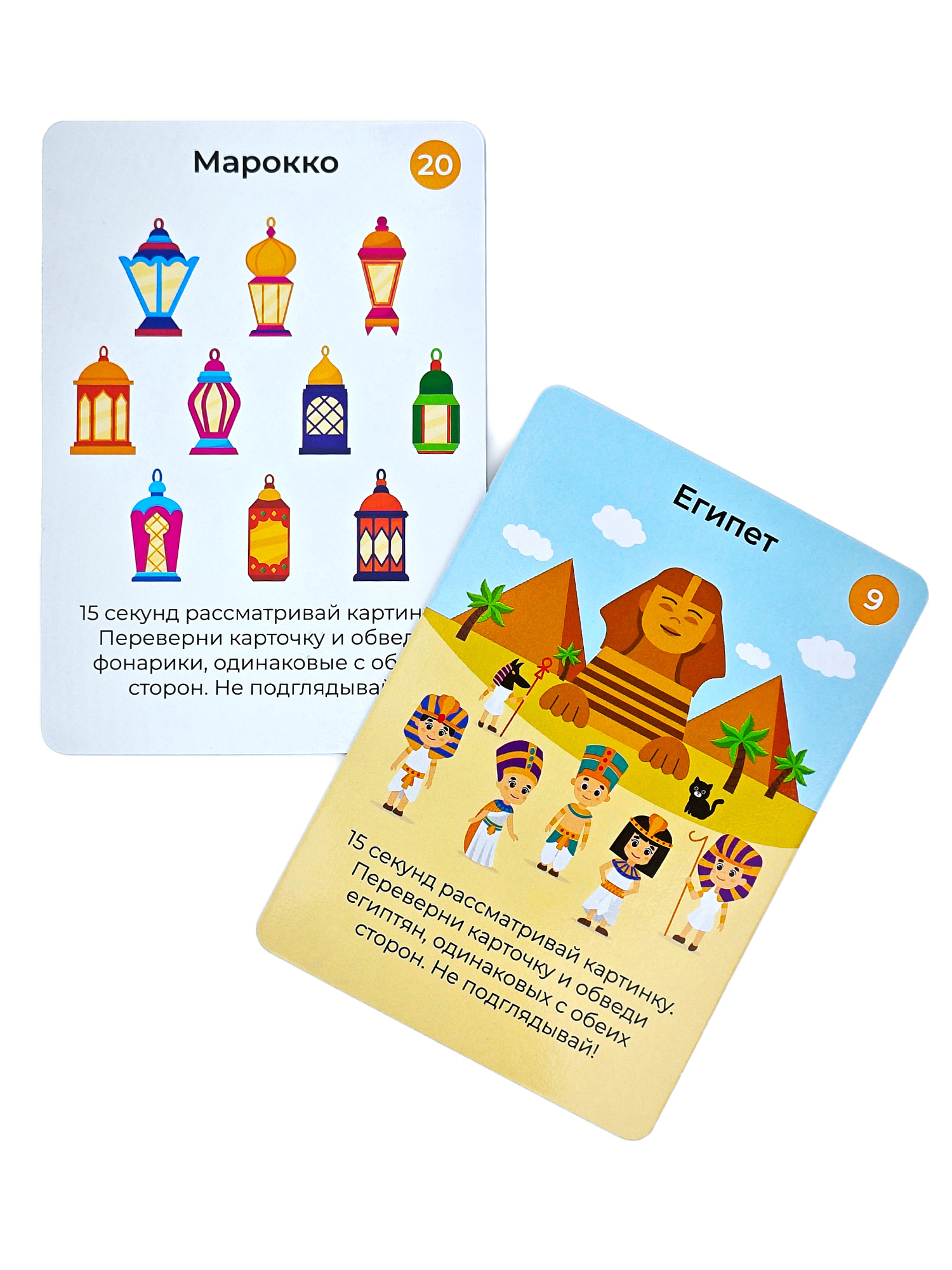 На части карточек прячется чёрный кот. Он может скрываться за предметами, оставлять следы и даже переодеваться человеком. Попробуй его найти!