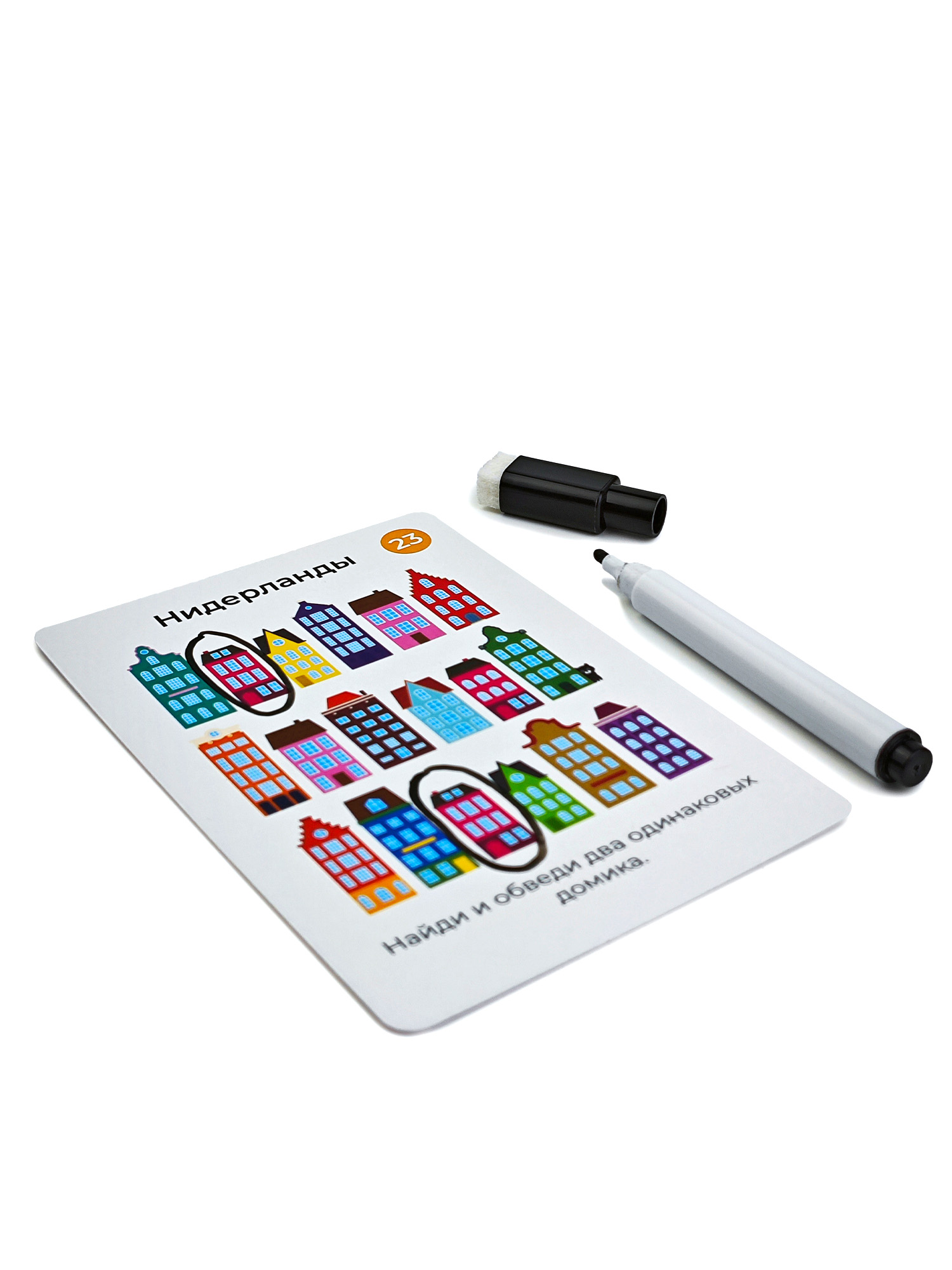 Задания на карточках построены по принципу «найди и обведи»: найди отличия, одинаковые или разные предметы и пр. Их можно выполнять снова и снова, благодаря многоразовым карточкам и маркеру на водной основе.
