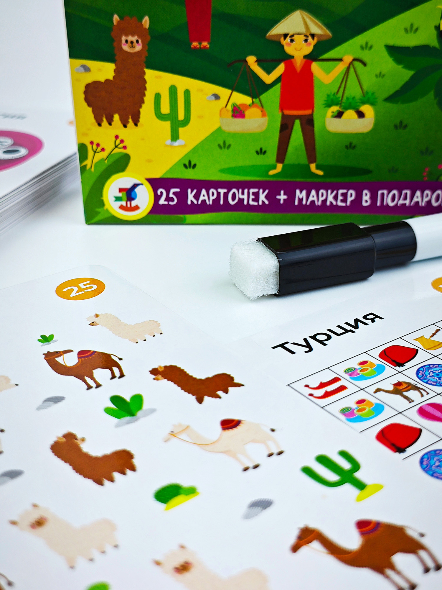 В наборе: 25 карточек из картона, маркер.