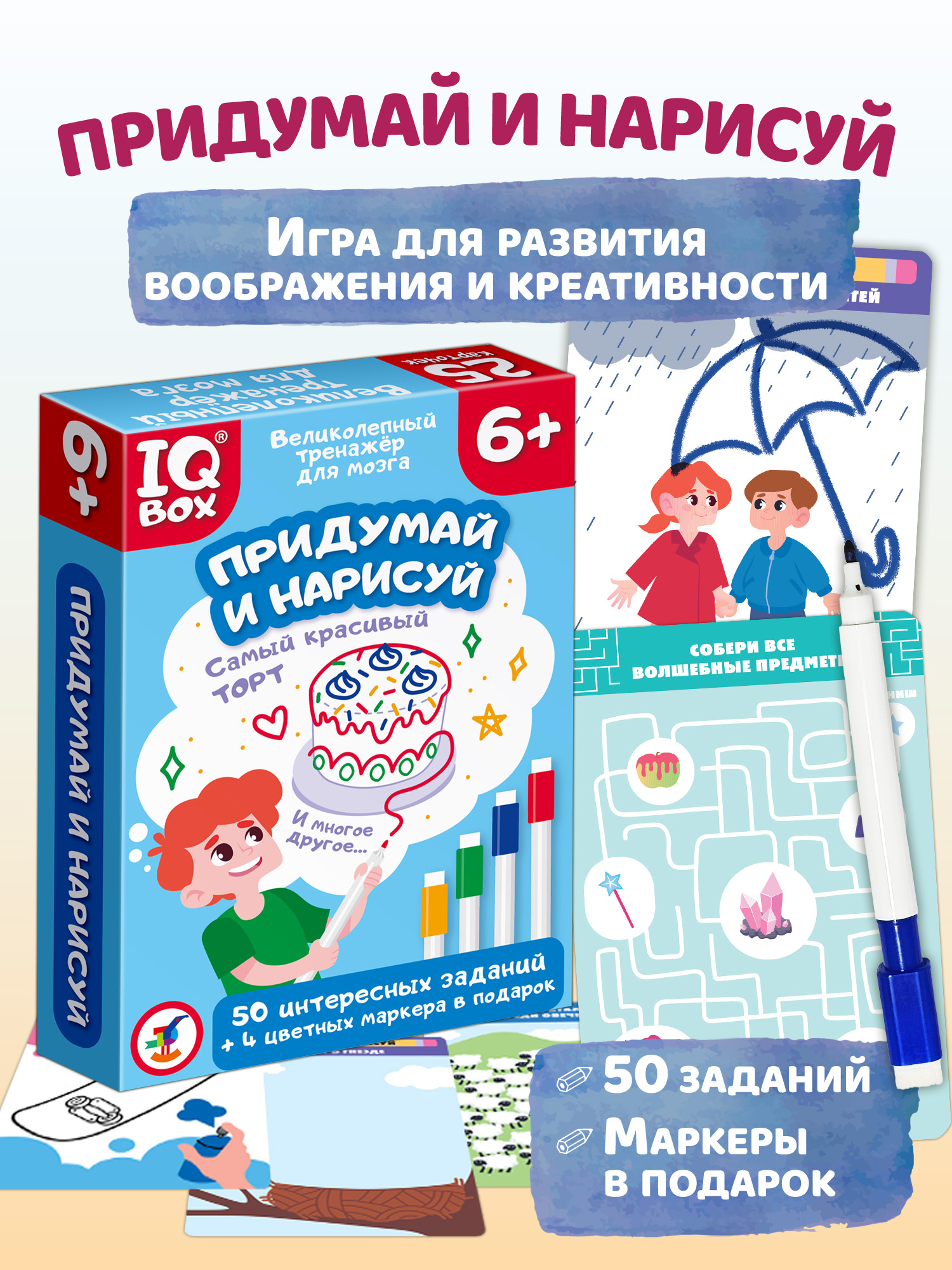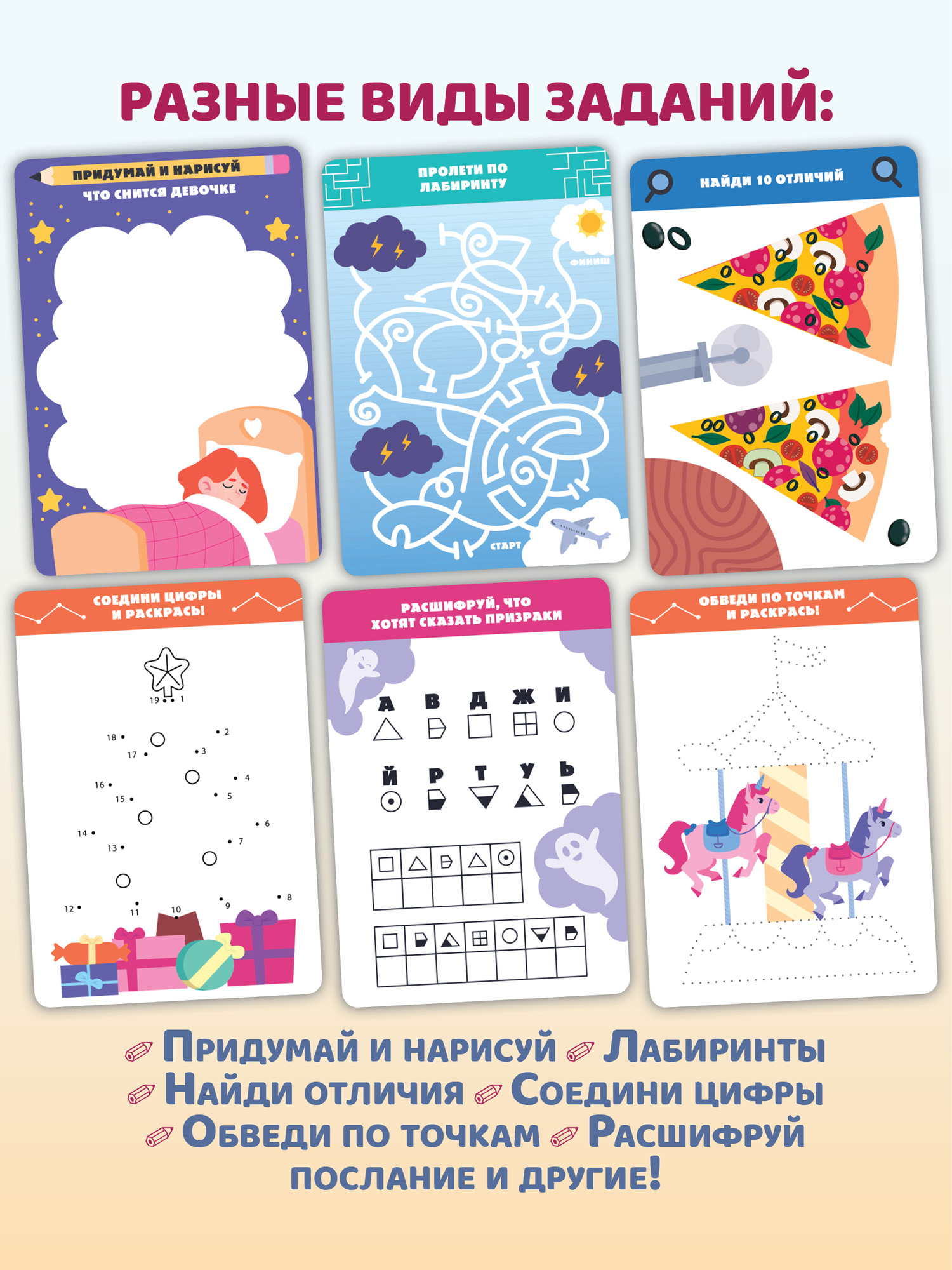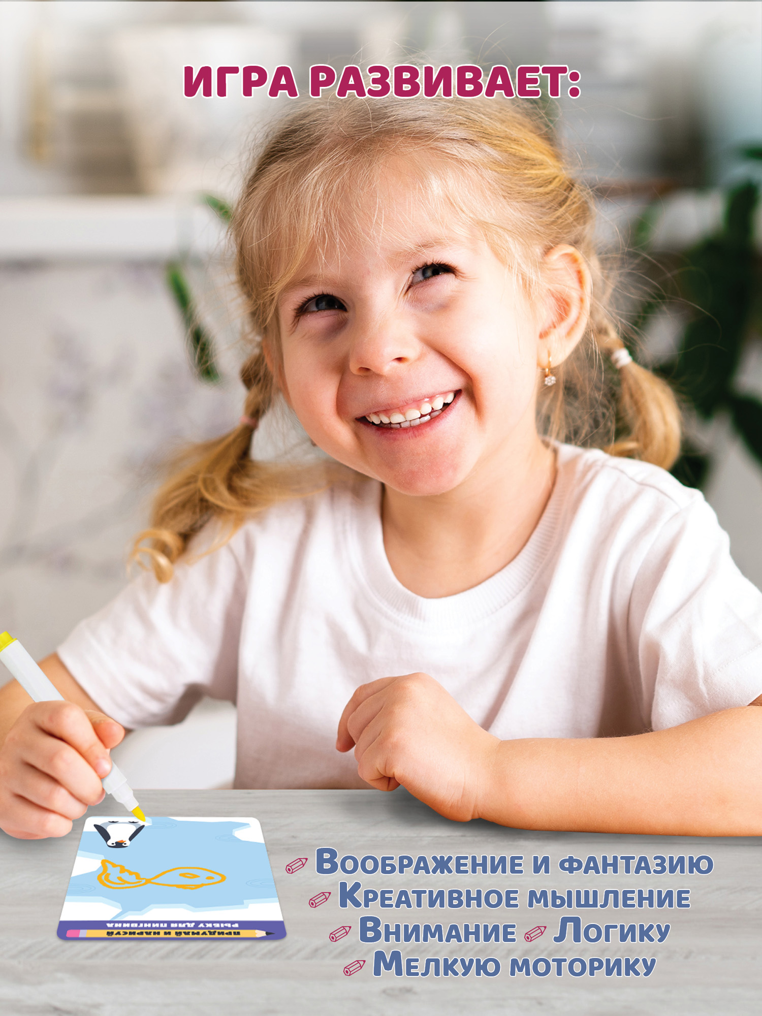 Придумай и нарисуй – это интересная и очень полезная игра, которая развивает воображение и творческие способности. Выполняя задания, ребёнок будет придумывать и воплощать свои идеи в рисунках, проходить лабиринты, рисовать картинки по цифрам и обводить по точкам, раскрашивать, искать отличия, подбирать пары и расшифровывать послания.