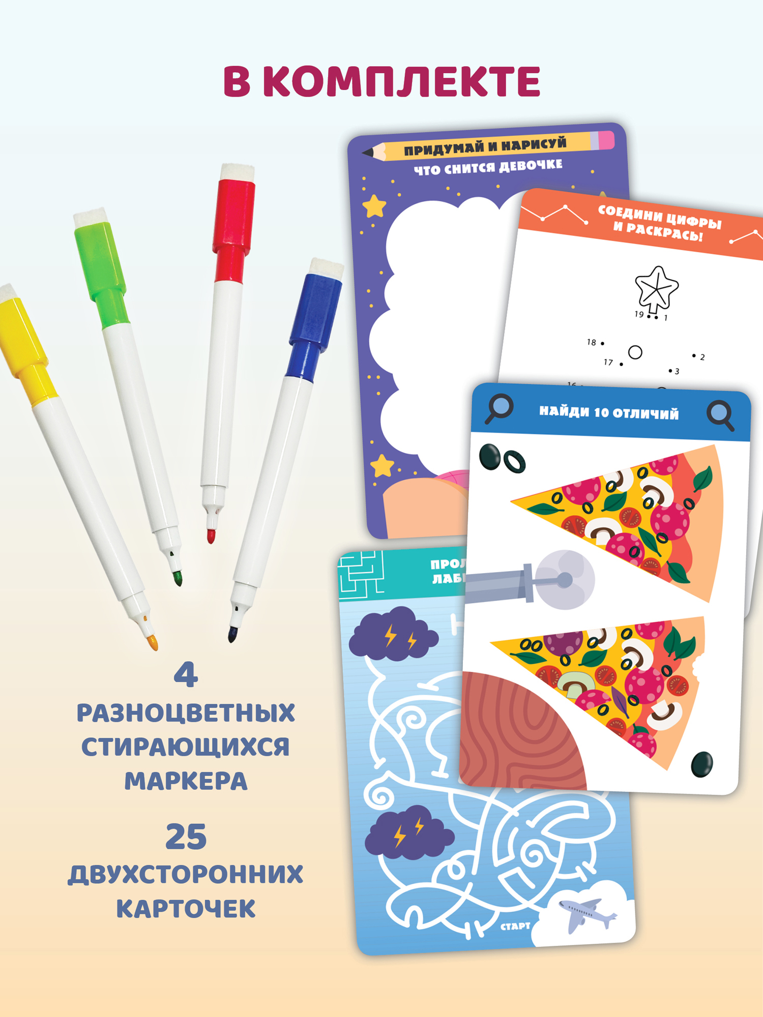 В комплекте: 25 двухсторонних карточек, 4 разноцветных стирающихся маркера.