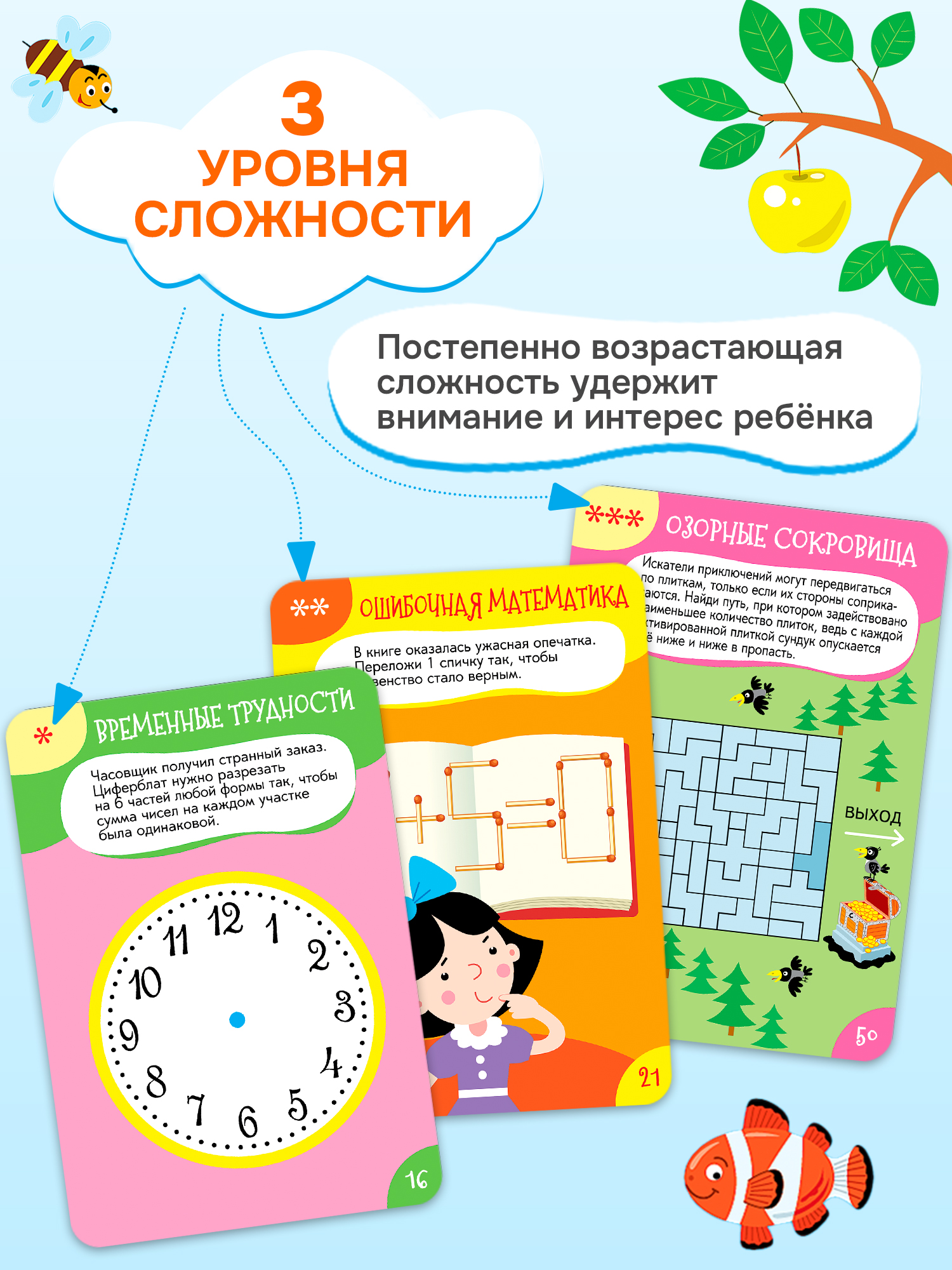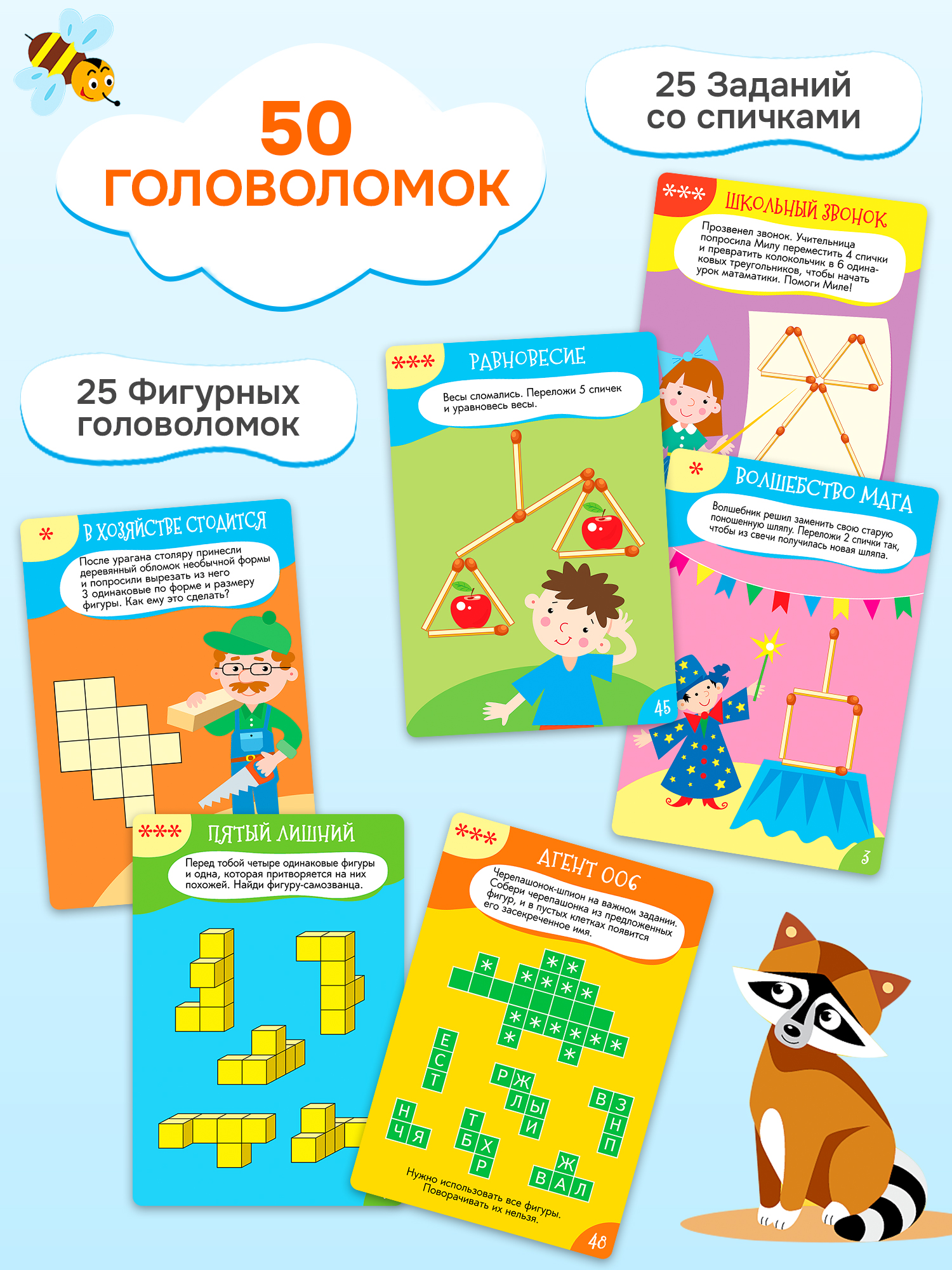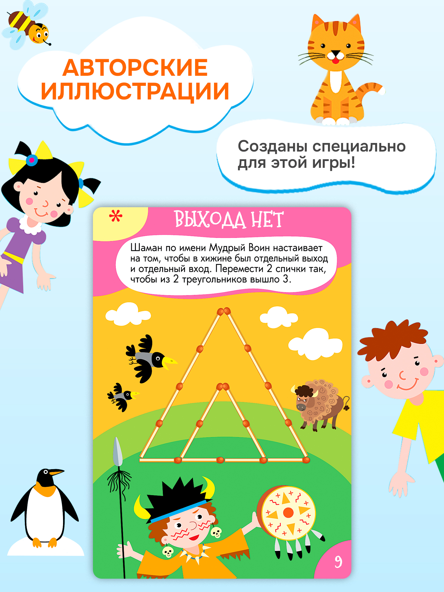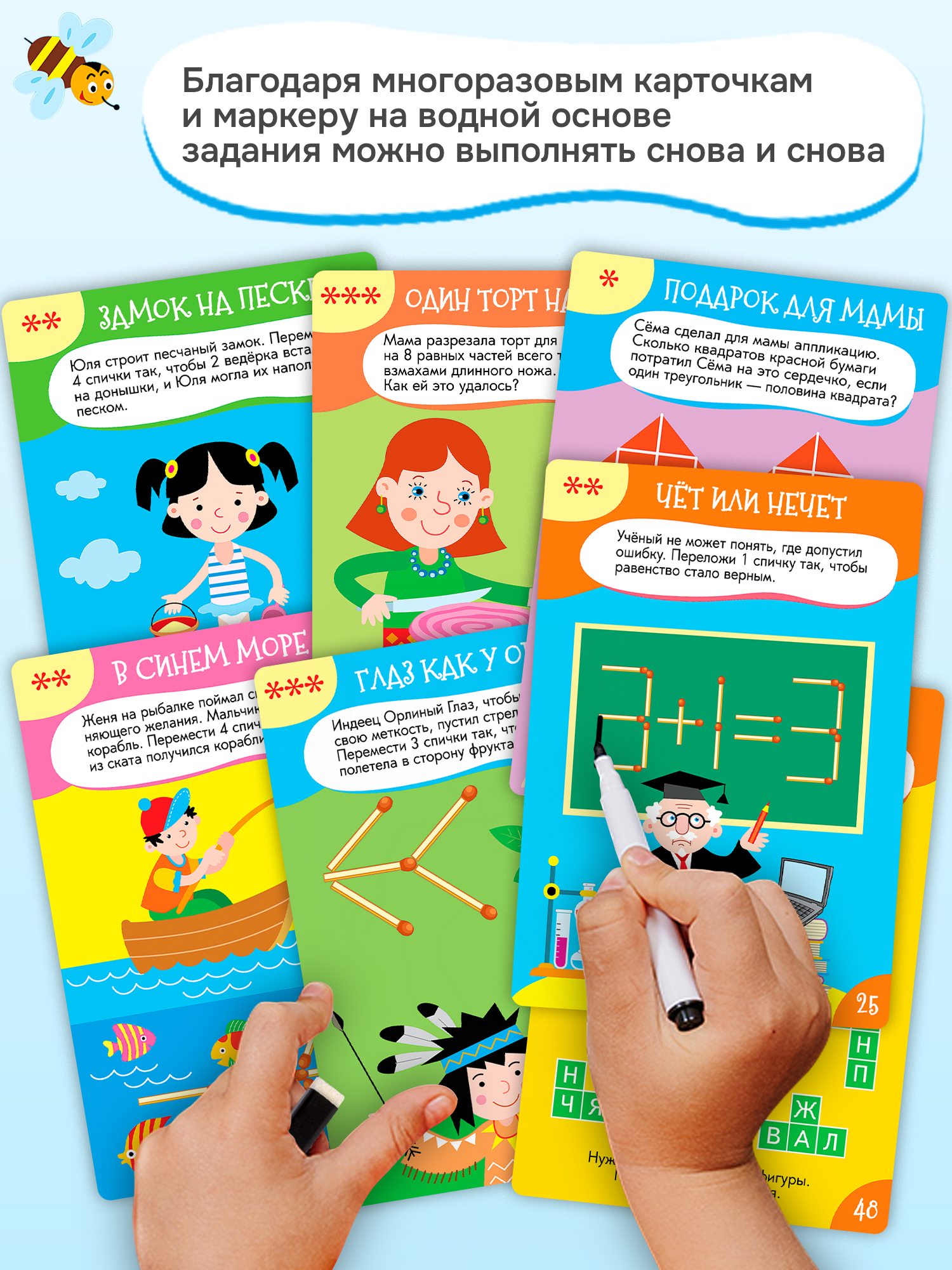 В наборе вы найдёте 25 головоломок со спичками и 25 фигурных головоломок, к которым можно возвращаться снова и снова благодаря маркеру на водной основе, который без труда стирается с поверхности карточки.