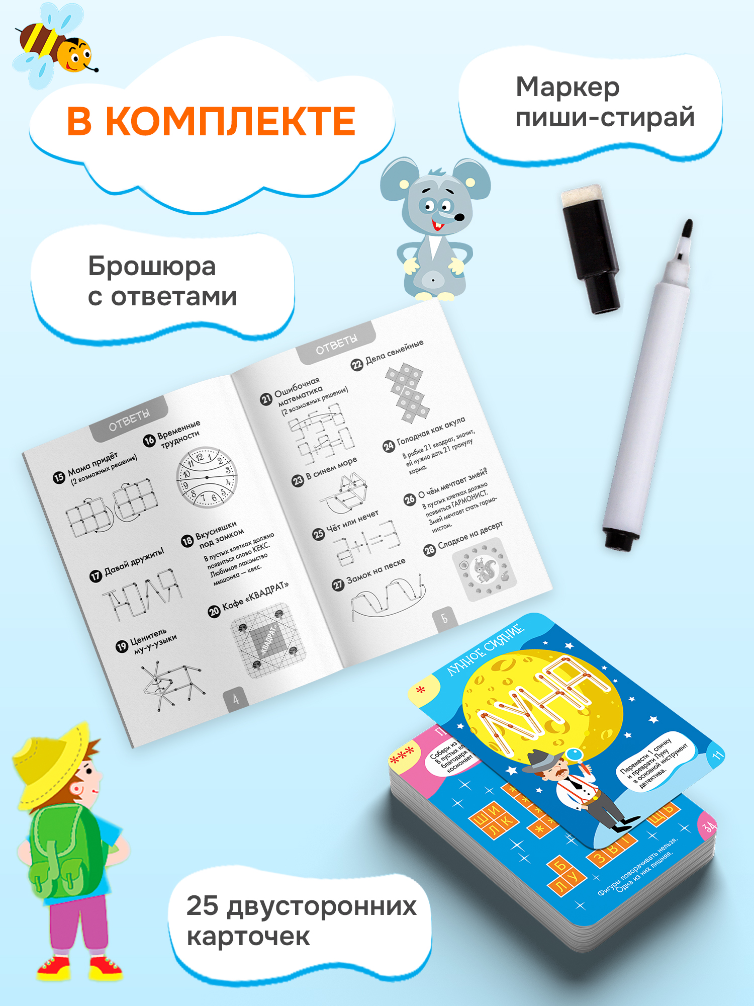 В наборе: 25 карточек из картона, брошюра с ответами и маркер.