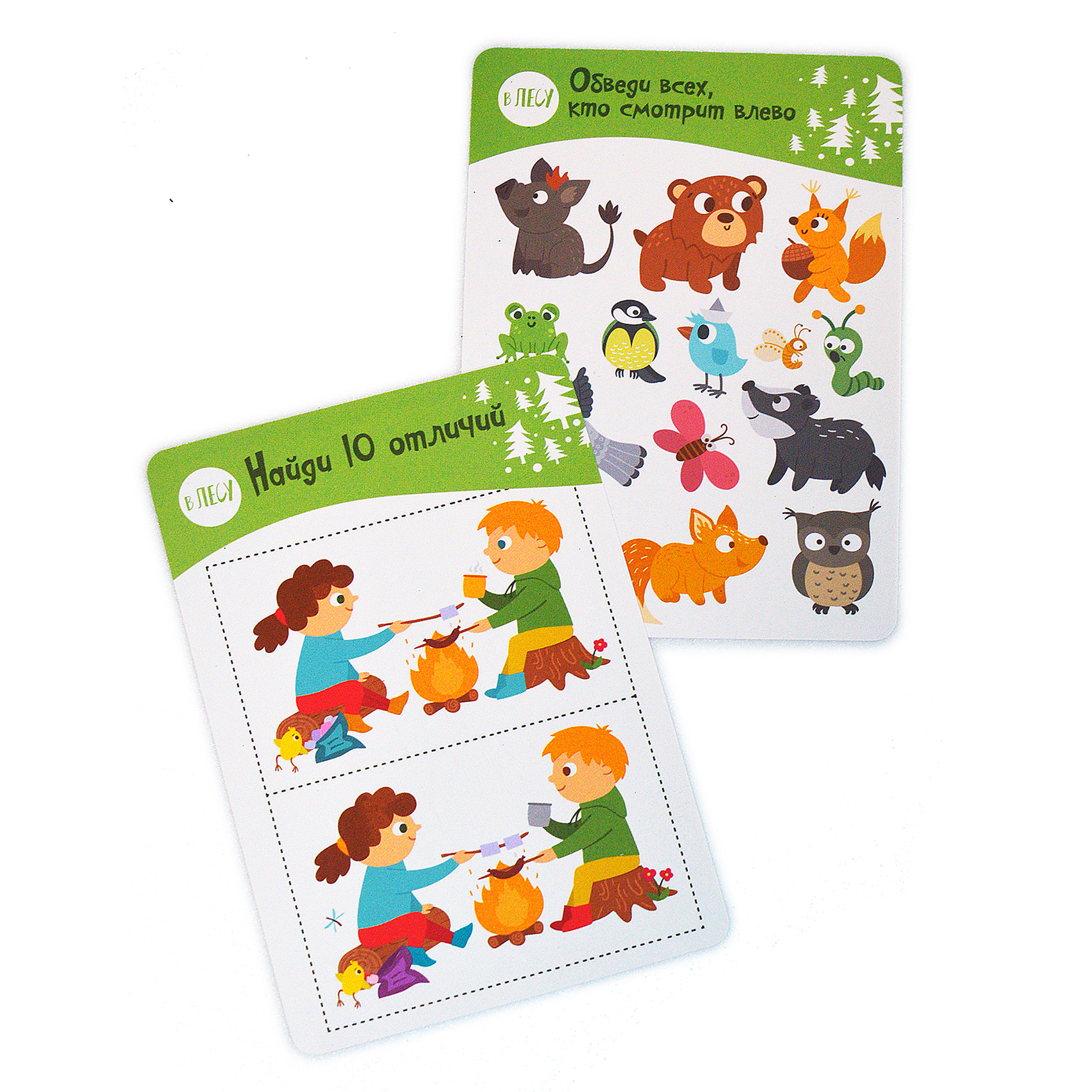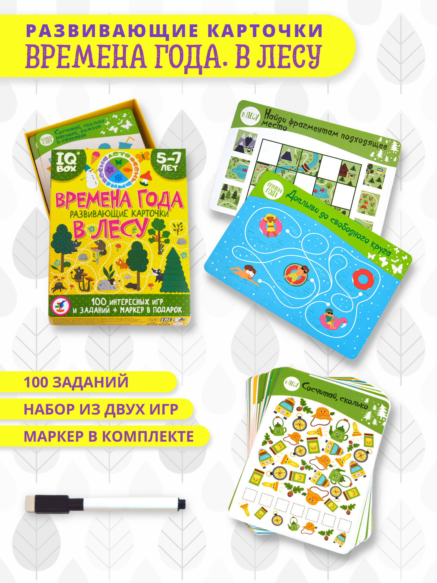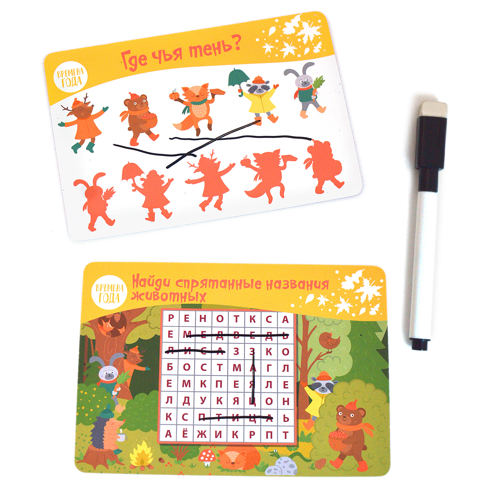 Перед вами набор из двух игр, в которых ребёнок, вооружившись маркером, будет искать отличия и закономерности, проходить лабиринты, считать предметы, обводить, соединять и рисовать. Благодаря многоразовым карточкам и маркеру на водной основе можно выполнять задания снова и снова.