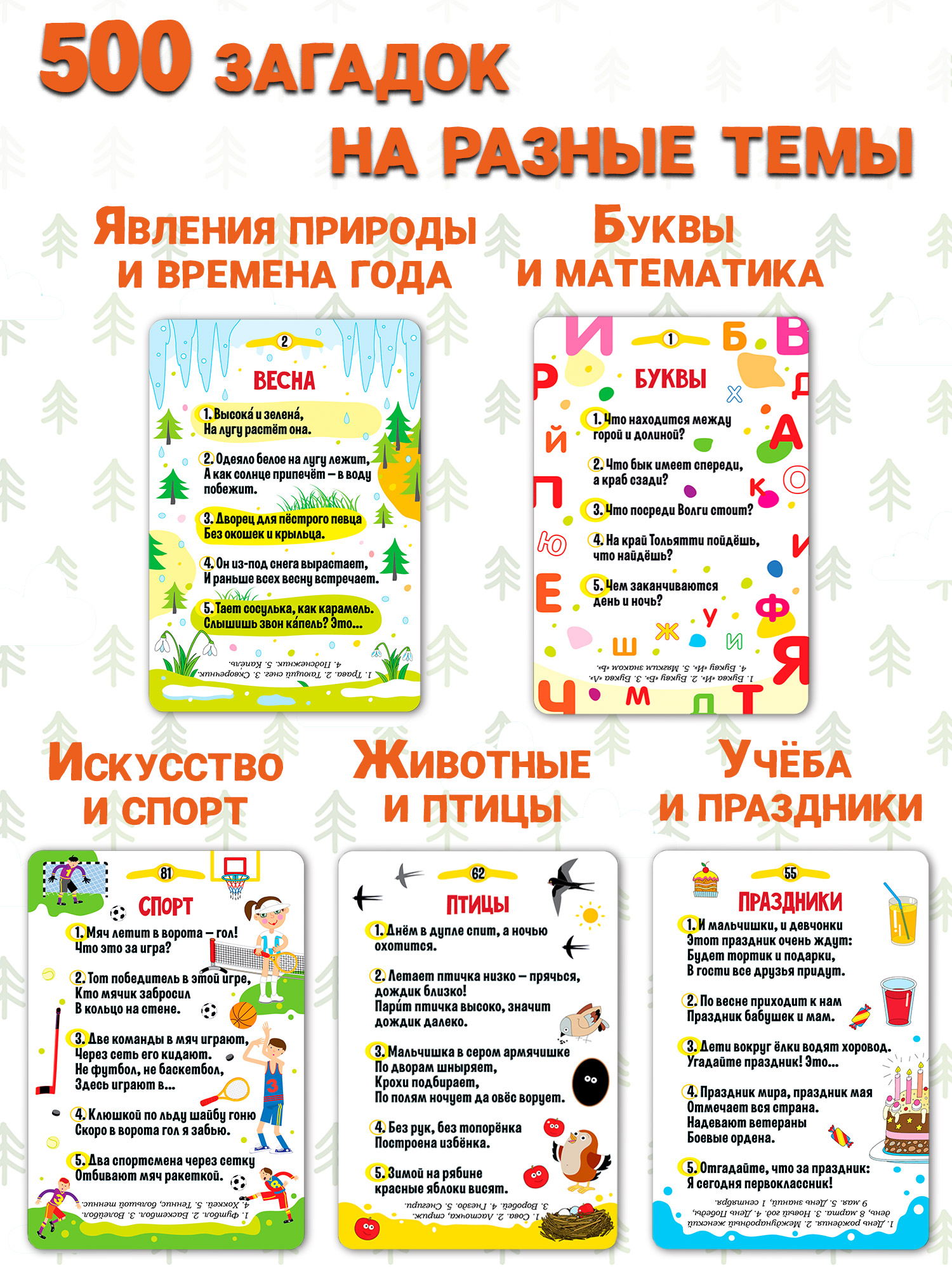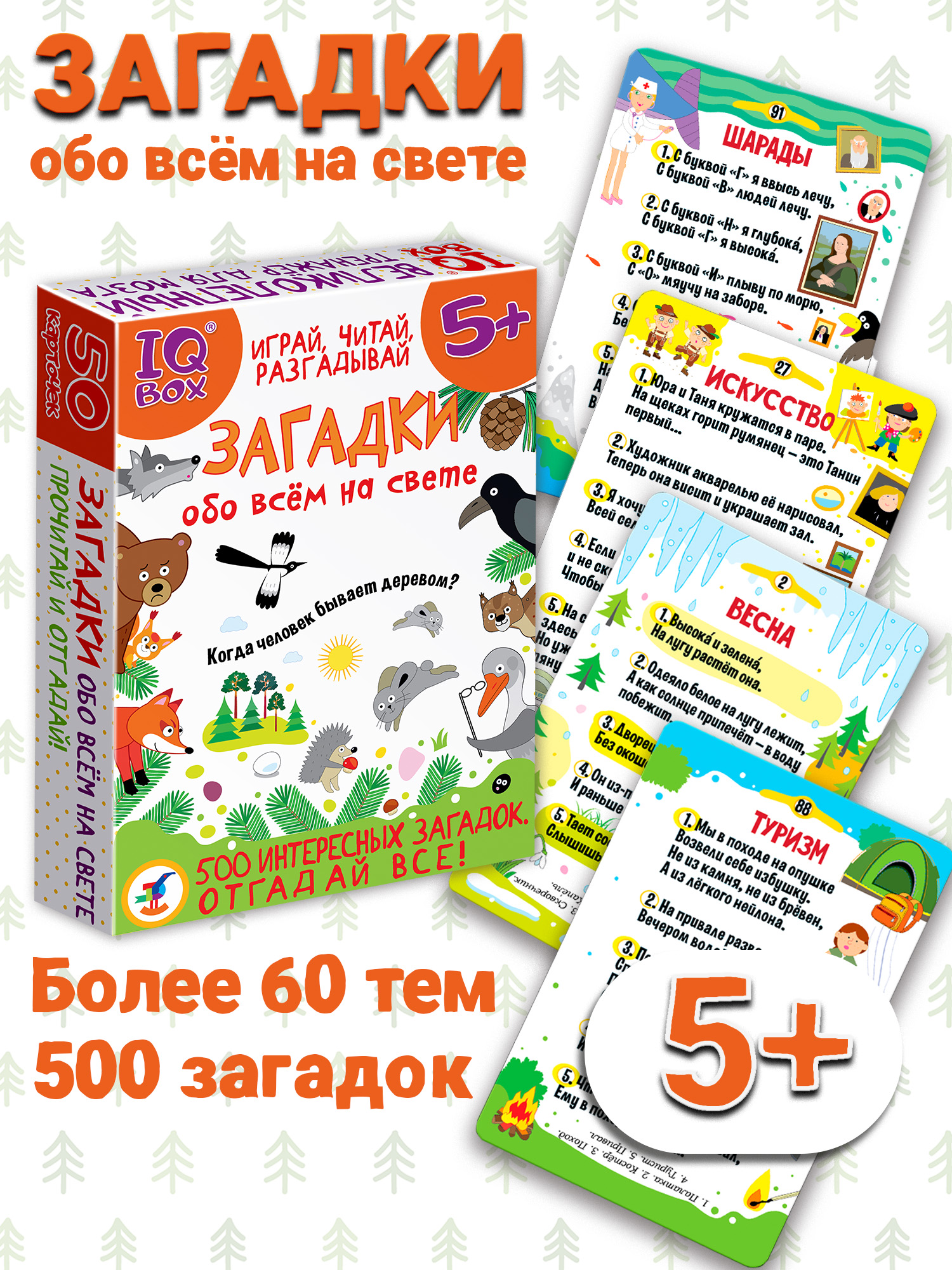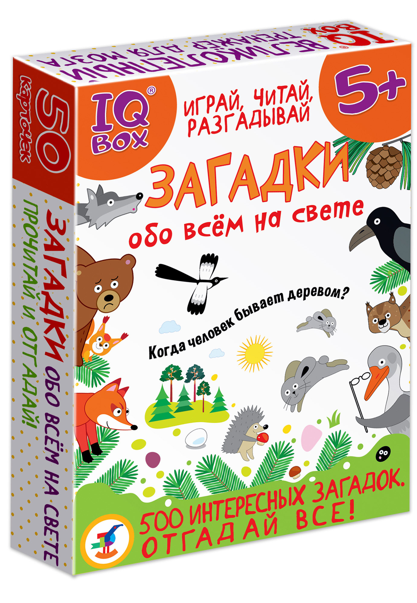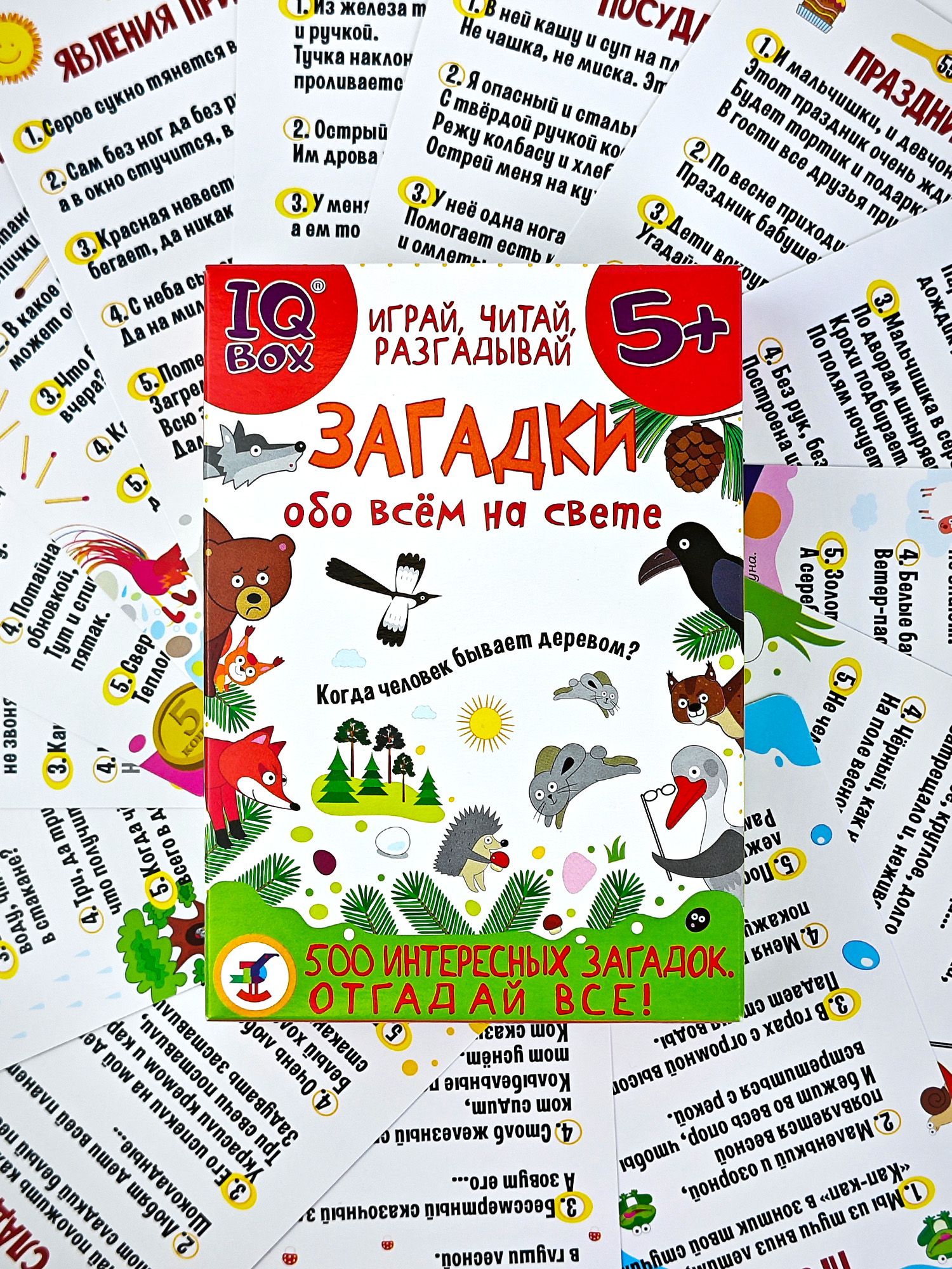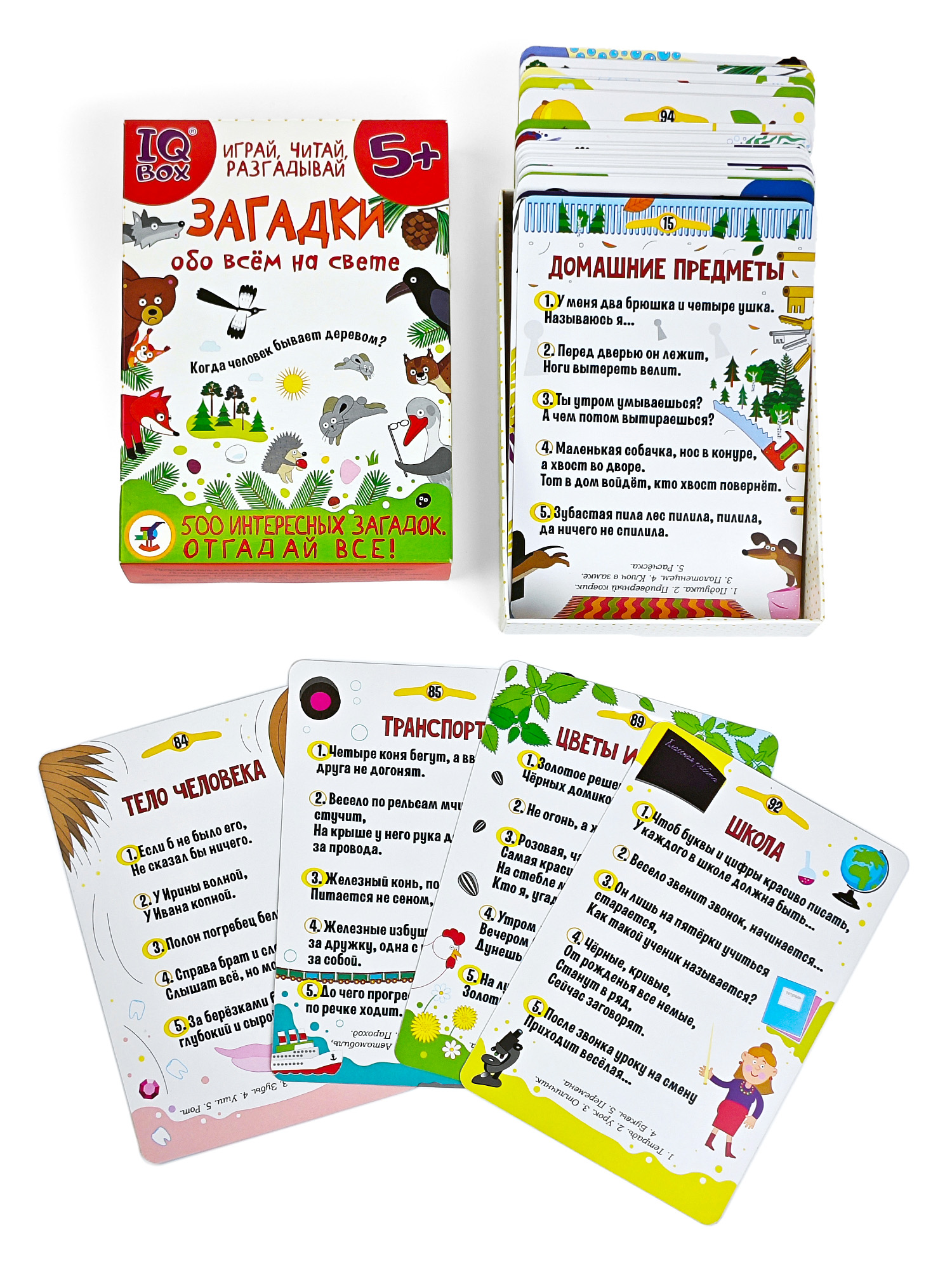 В карточной игре «Загадки обо всём на свете» собрано 500 загадок на разные темы — животные и птицы, явления природы и времена года, учёба и праздники, искусство и спорт, буквы и математика, а также загадки-шутки и логические вопросы. Каждой теме посвящена отдельная карточка, а всего их 50.