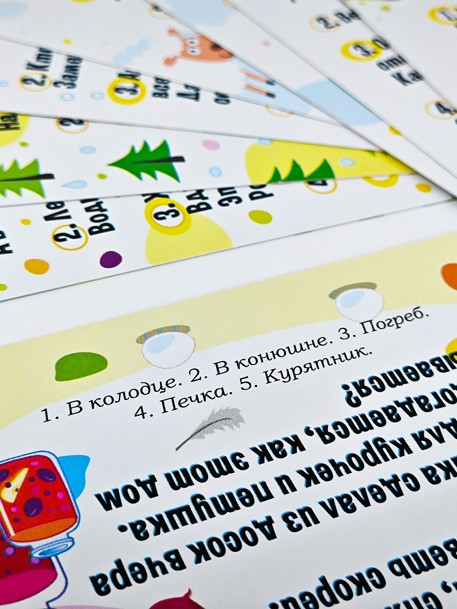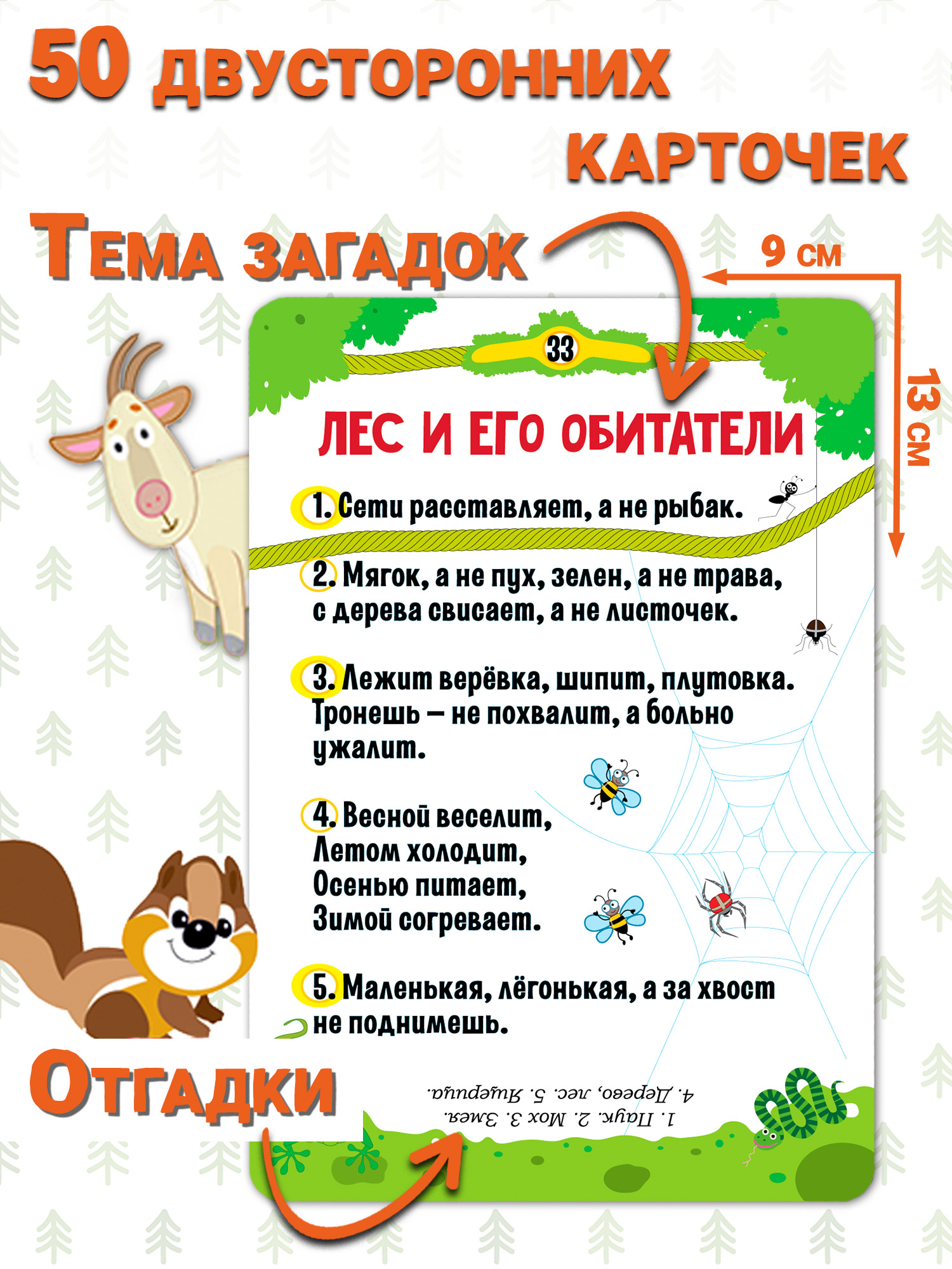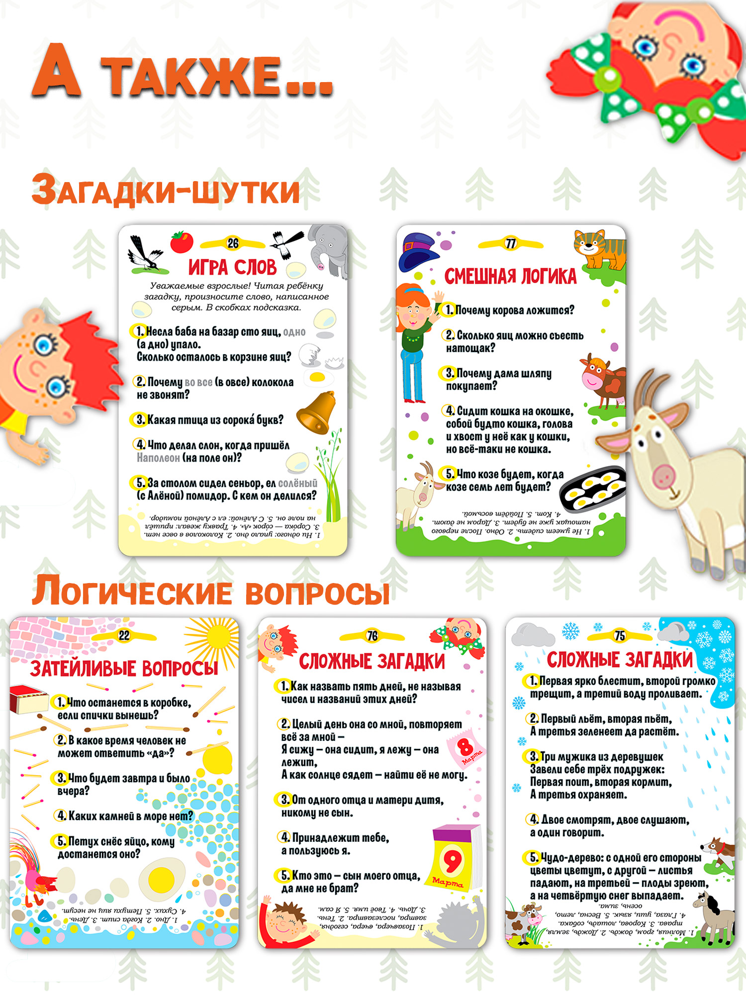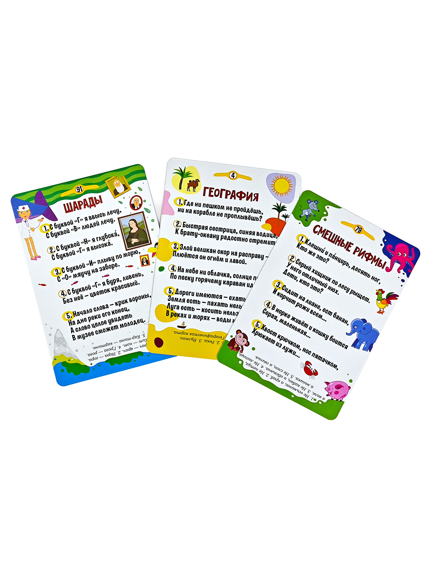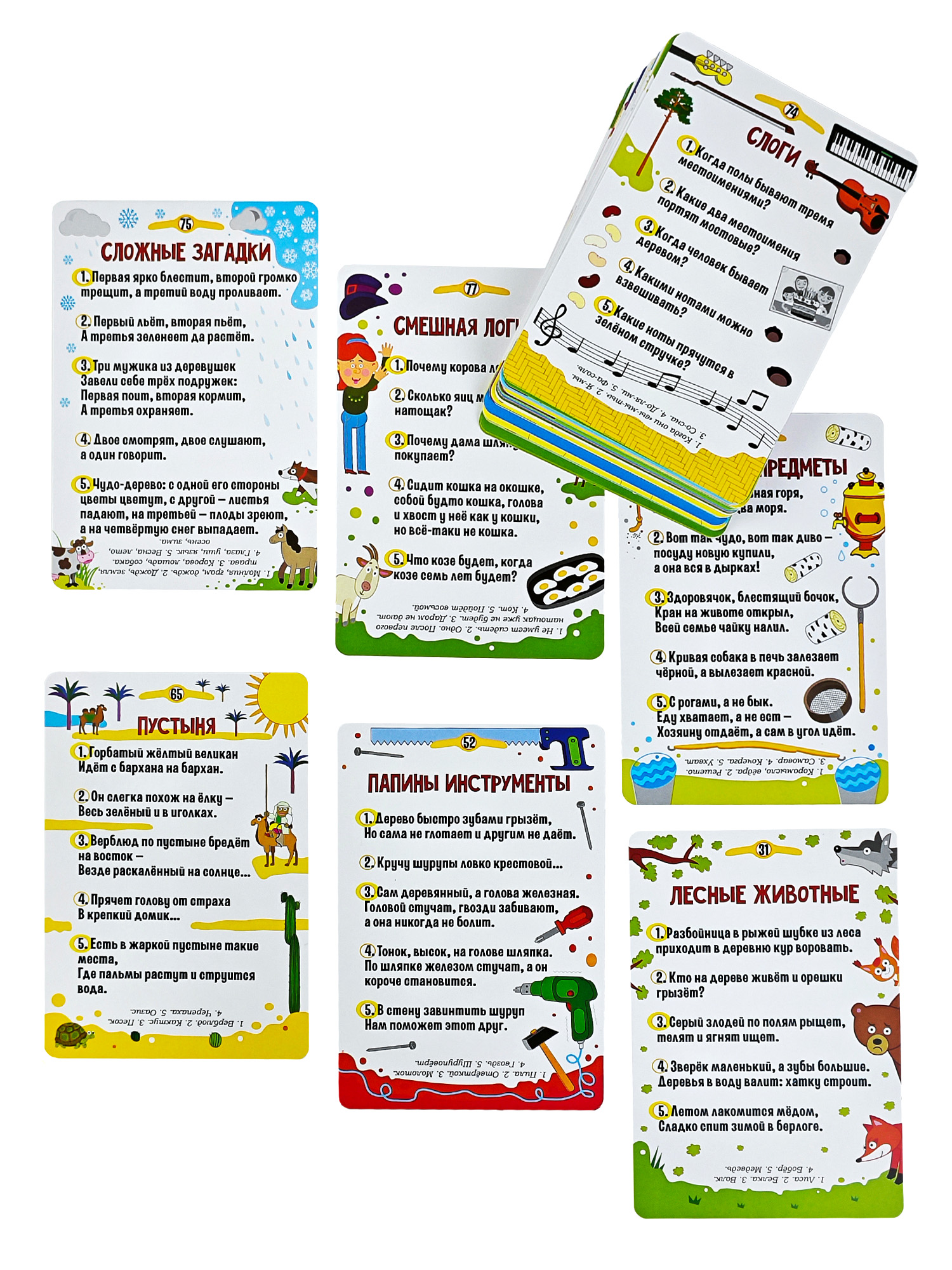 Отгадки написаны в нижней части каждой карточки. Играть в загадки можно как одному, так и с родителями или друзьями. Благодаря компактным размерам игру удобно брать с собой в путешествия. Подходит для использования дома, в детском саду, школе.