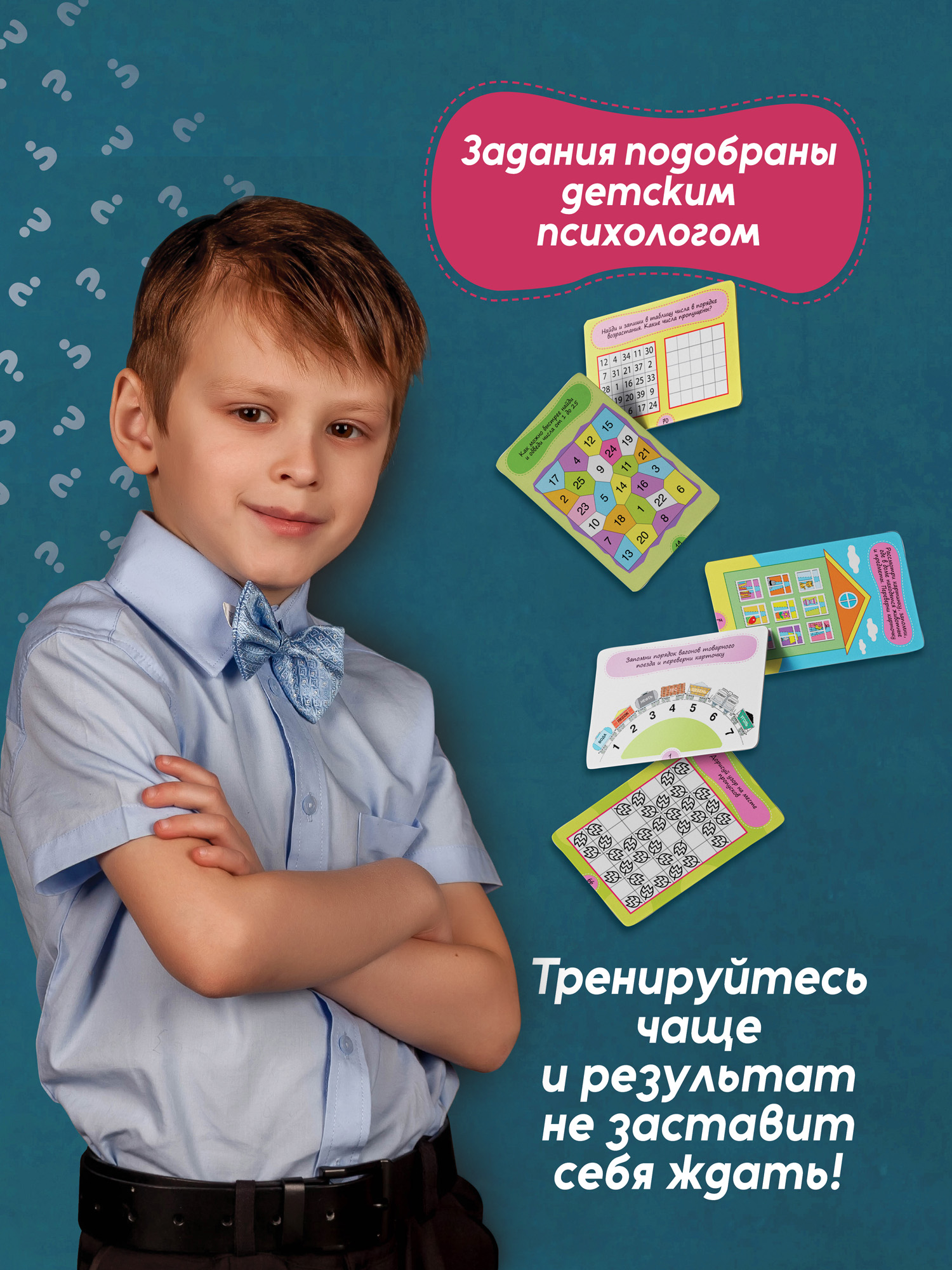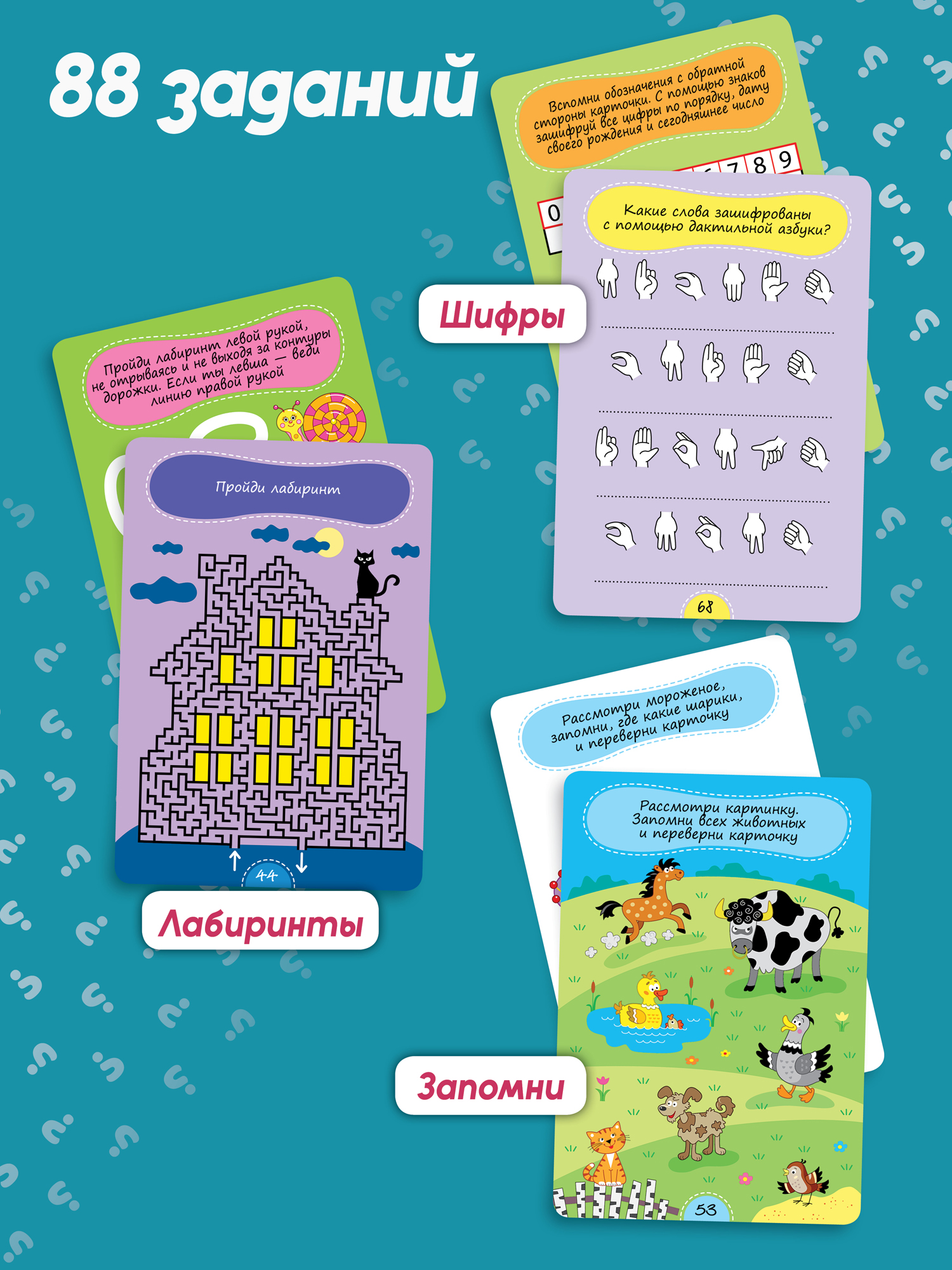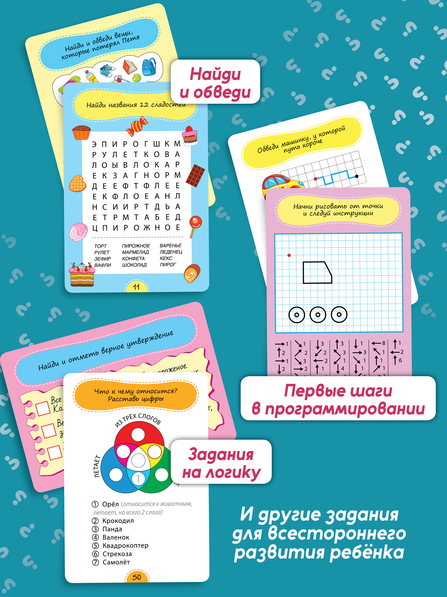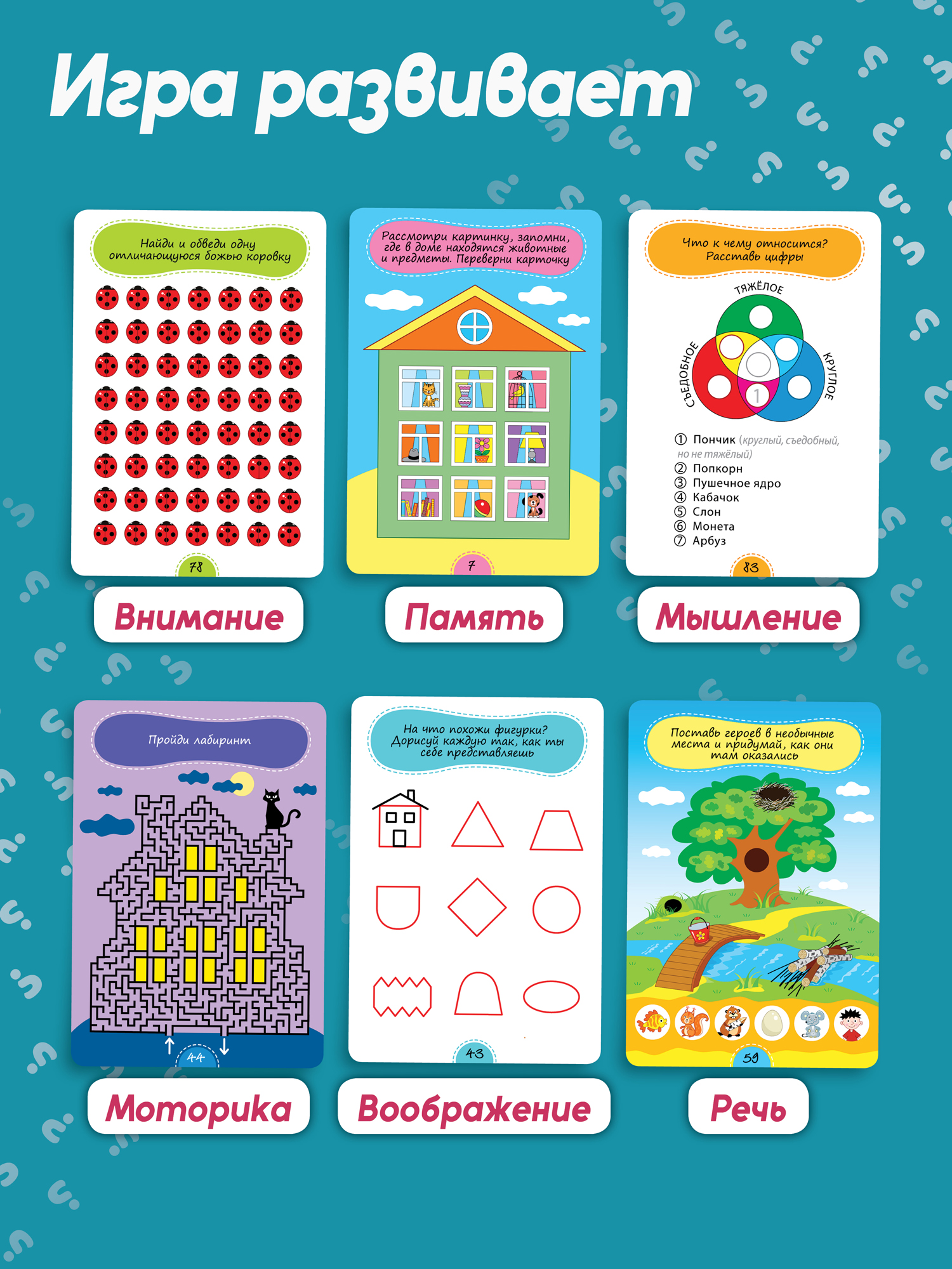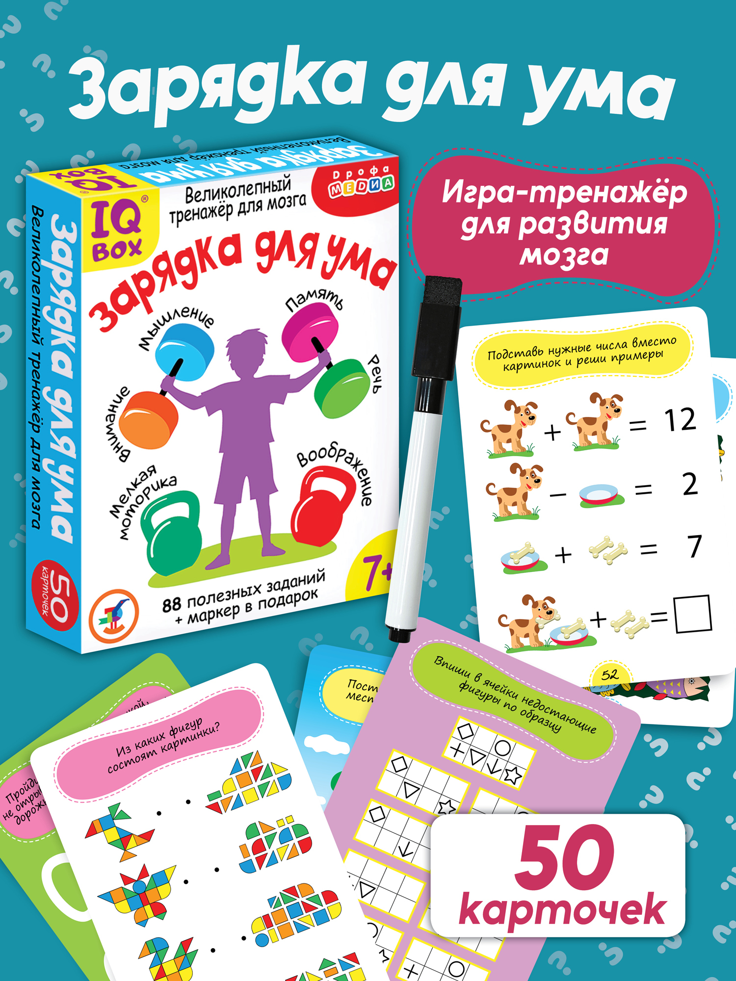В коробке 50 двухсторонних многоразовых карточек с увлекательными задачками и играми на развитие разных видов мышления, внимания и памяти, которые подойдут детям от 7 лет. Занимаясь с карточками, ребёнок будет решать логические, графические и творческие задачи, развивать мышление, внимание, память, воображение и мелкую моторику, тем самым улучшая работоспособность мозга.