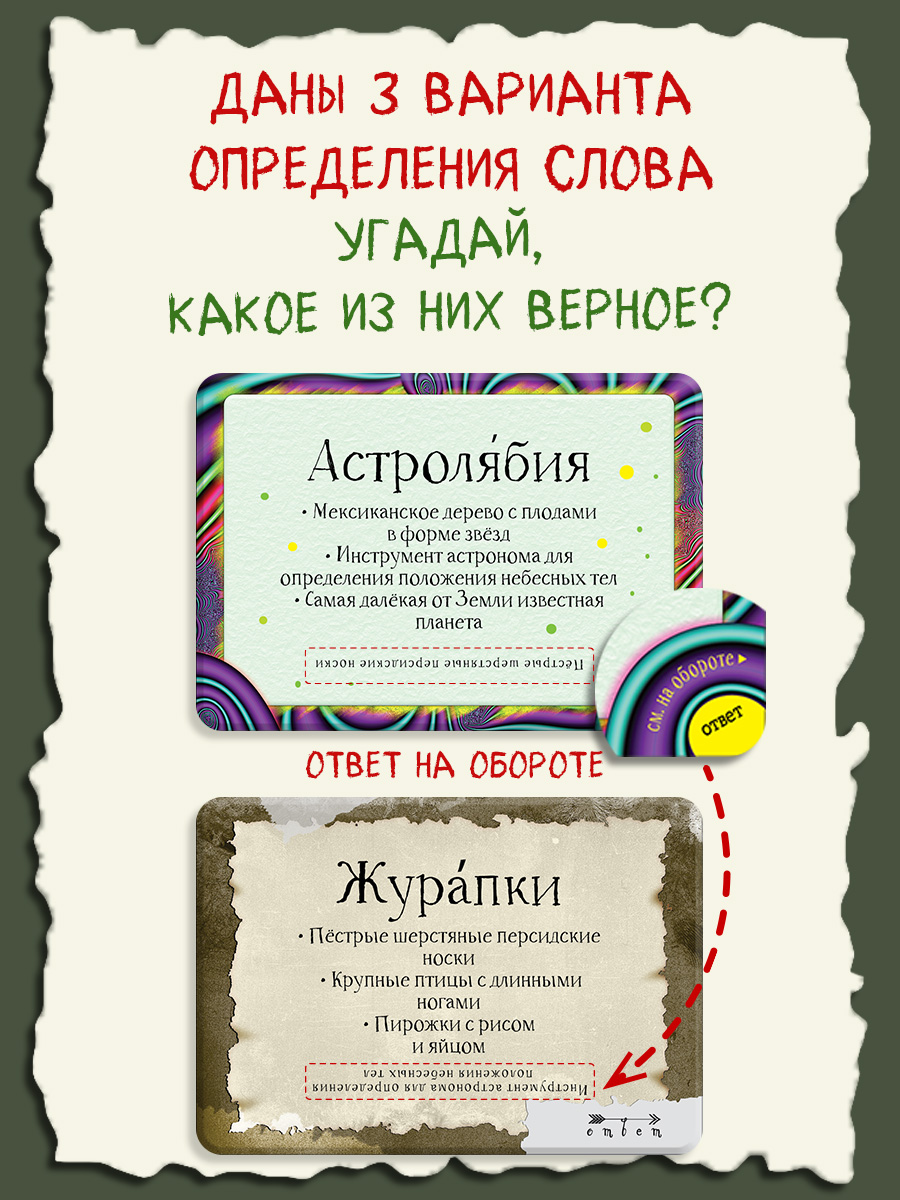 На одной стороне каждой карточки представлены современные слова, а на другой – устаревшие. К каждому слову даны три варианта определения. Осталось только угадать, какое из них верное.