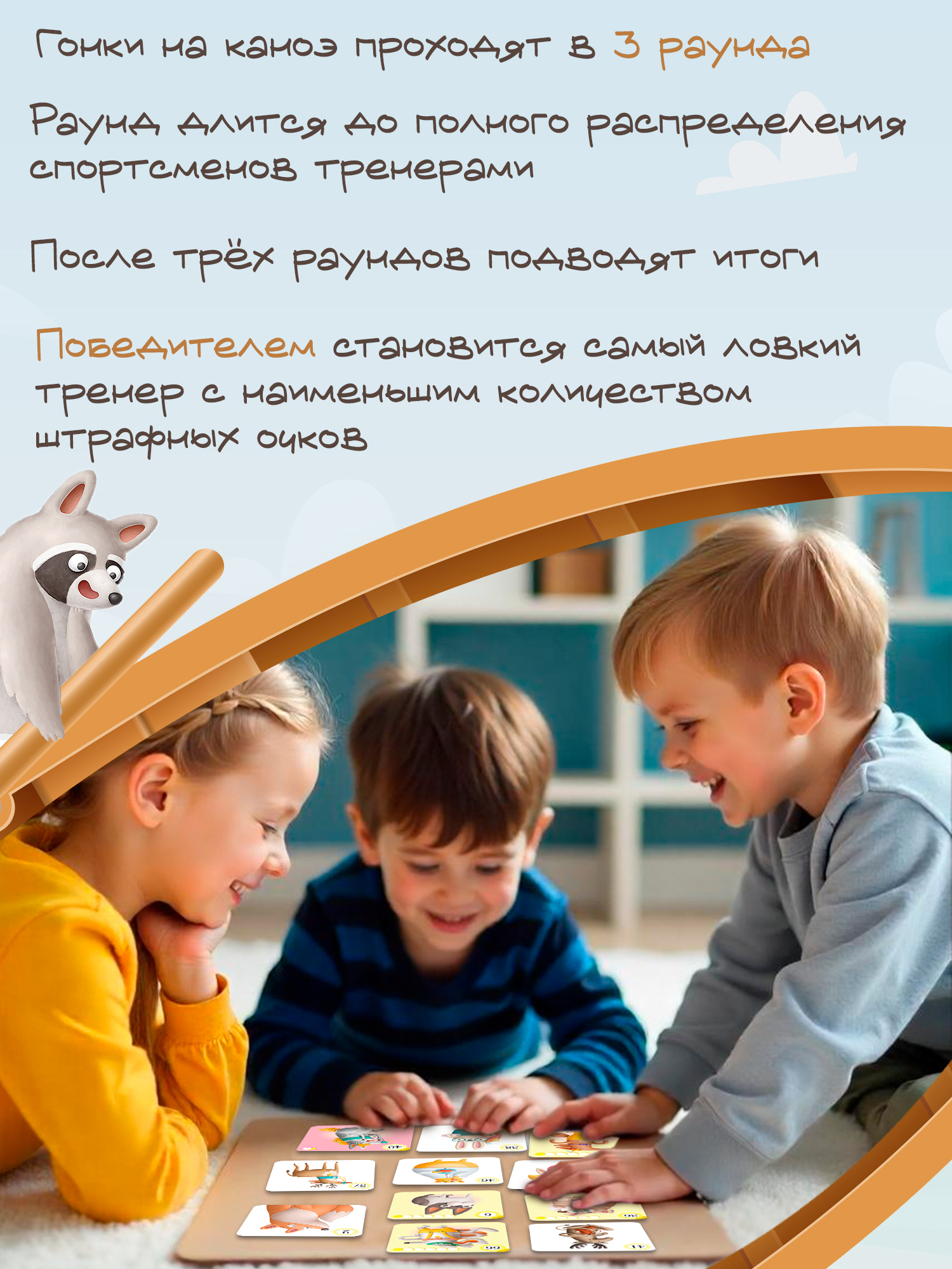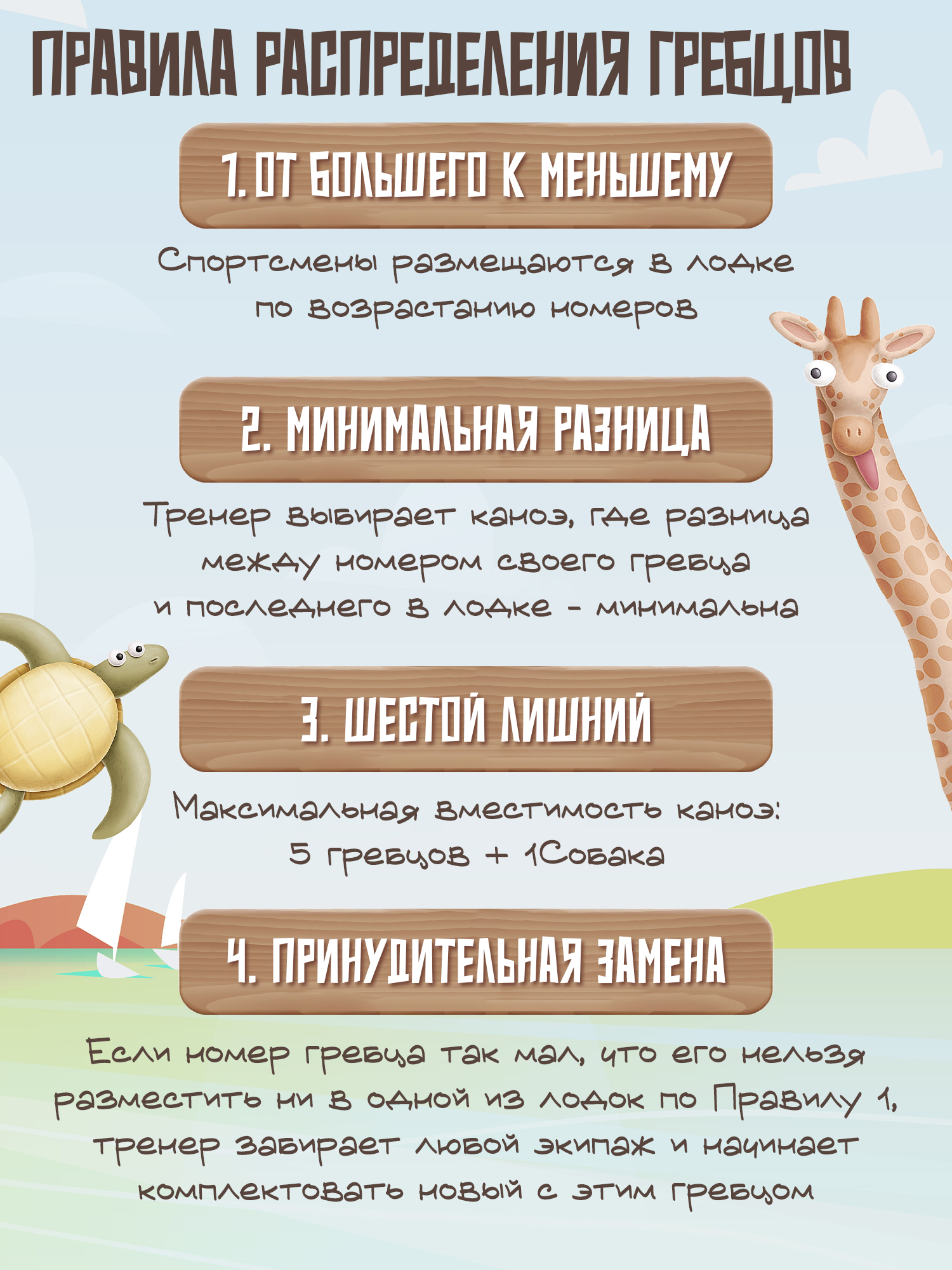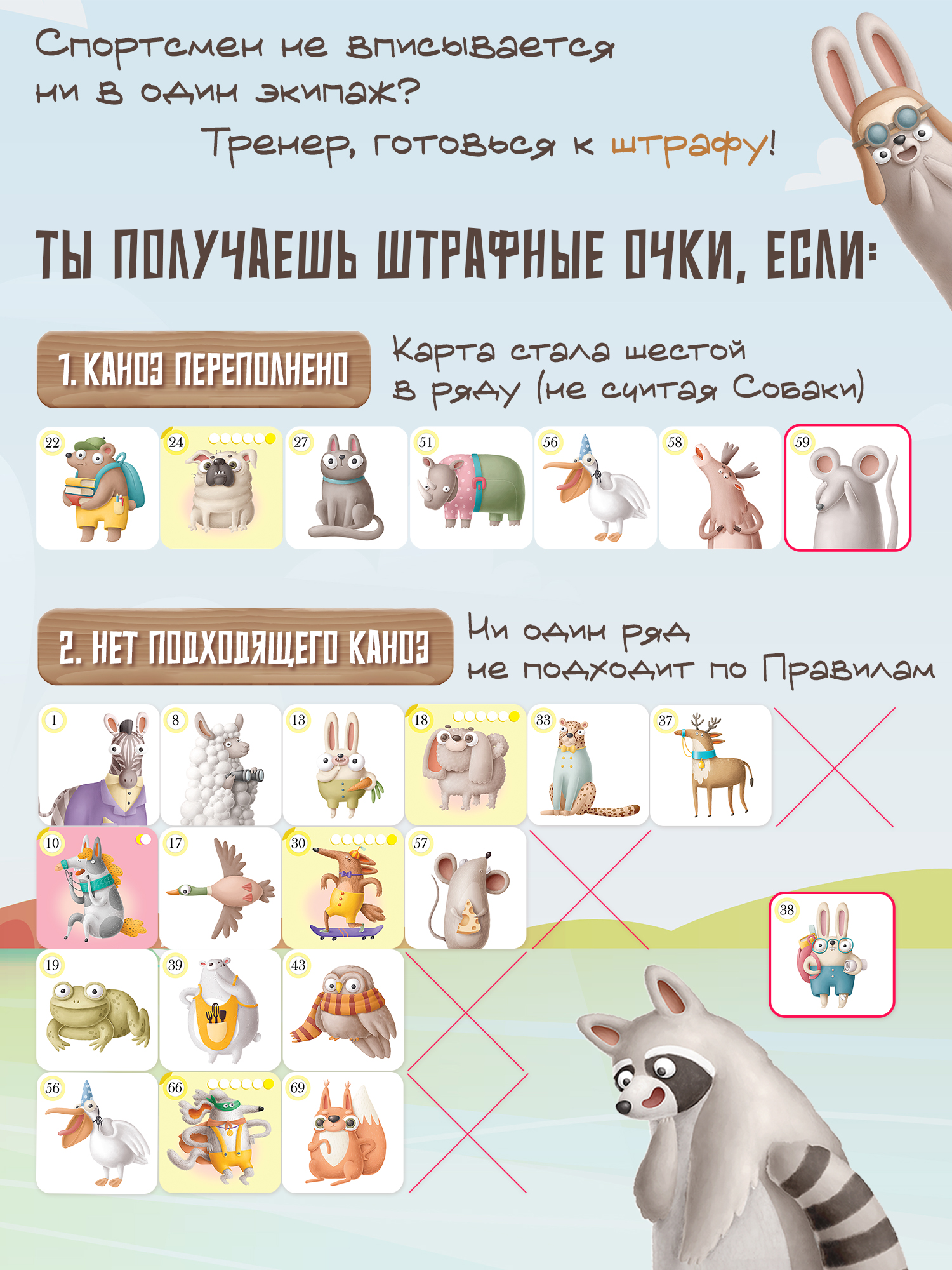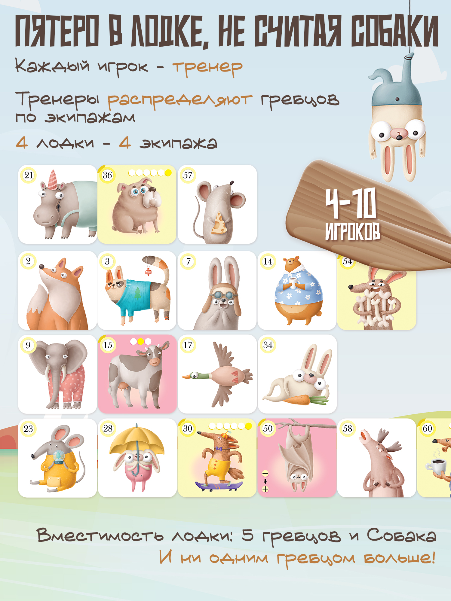 Игрокам предстоит собрать команду для участия в гонках на каноэ, но не всё так просто! Каждое каноэ вмещает только пять гребцов, не считая собаки, и ни одним гребцом больше. Каждый «лишний» пассажир приносит штрафные очки. Поэтому игроки стараются выкладывать каждую карту так, чтобы она не стала шестой в ряду. Побеждает тот, кто получит меньше всего штрафных очков.