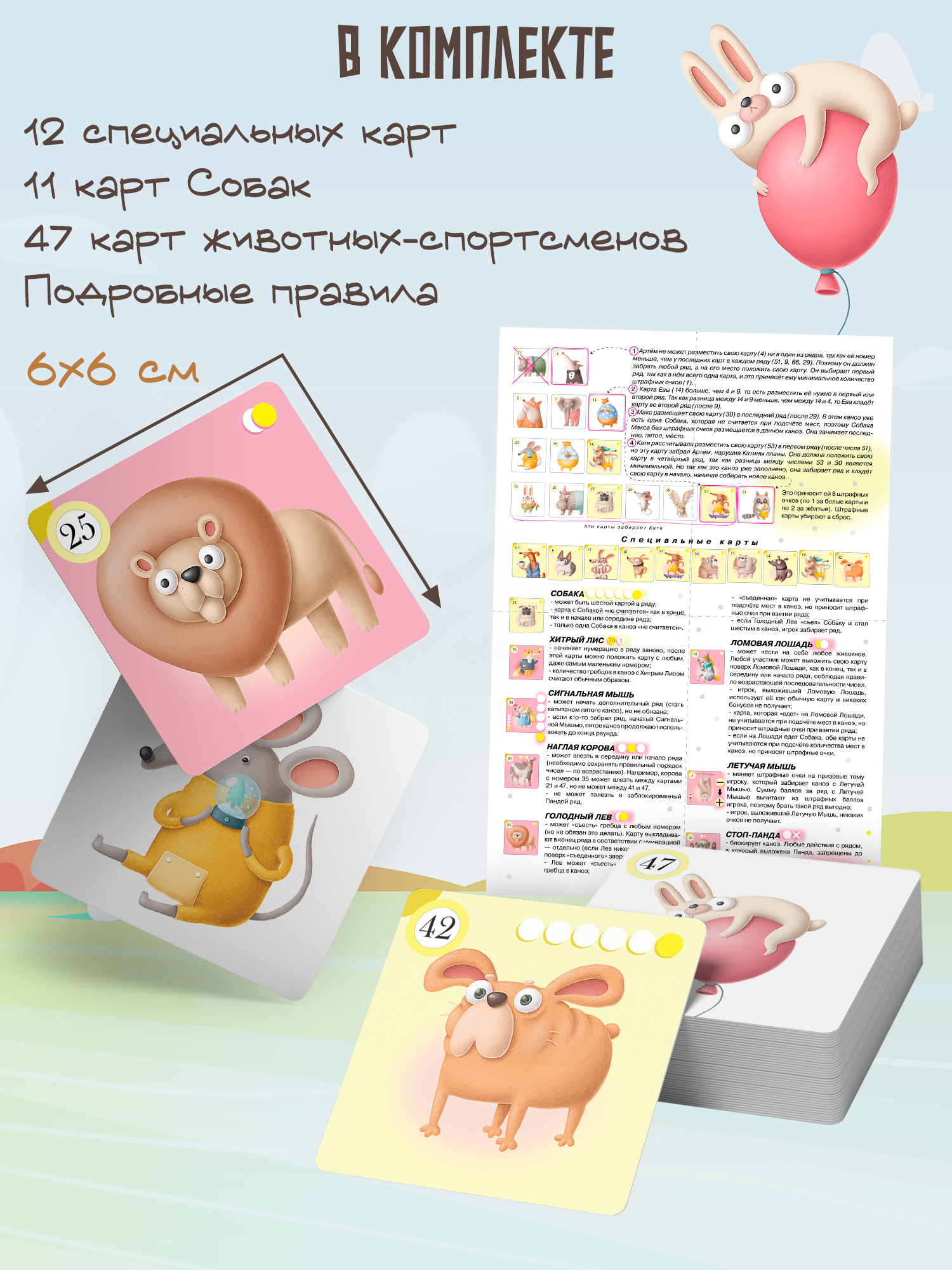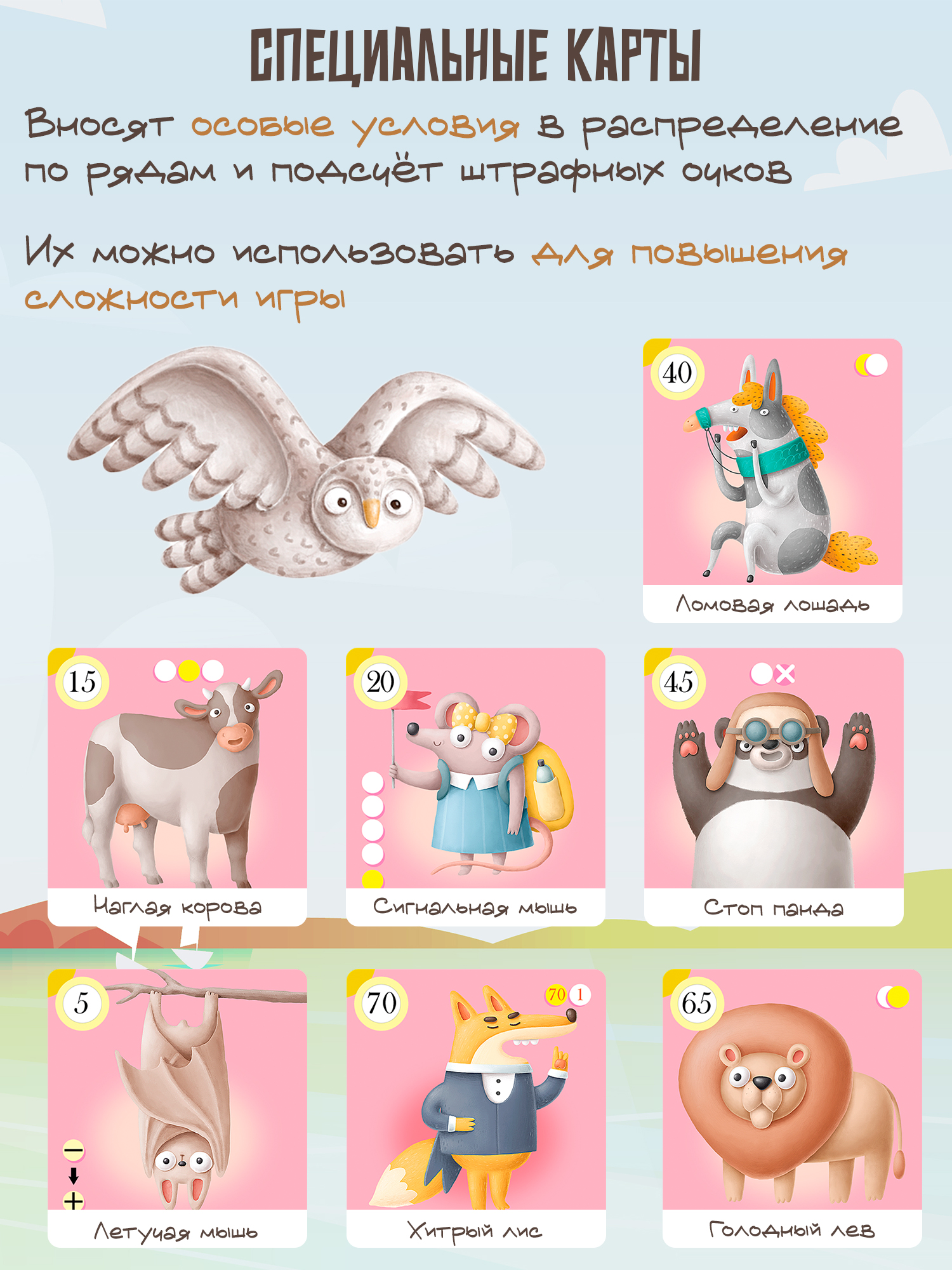 Участников ждут приятные бонусы в виде специальных карт (Хитрый Лис, Наглая Корова, Ломовая Лошадь…), которые помогут собрать команду, но эти же карты могут сработать и в обратную сторону и разрушить все планы.