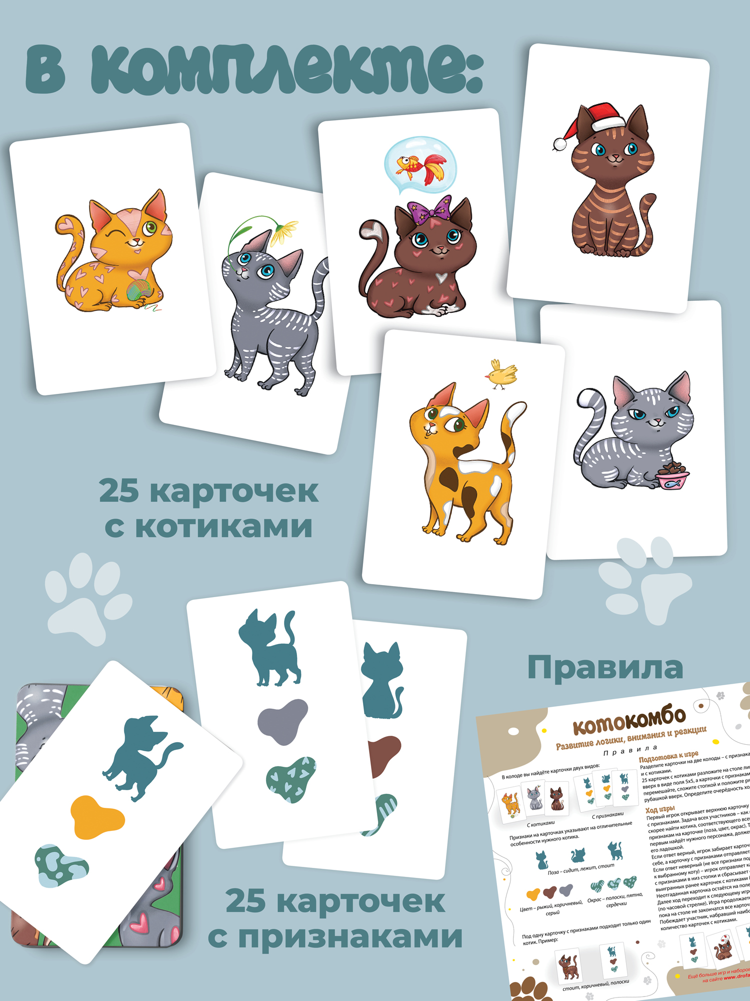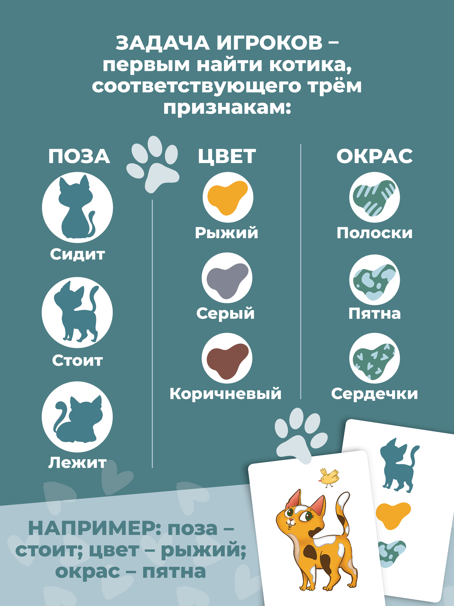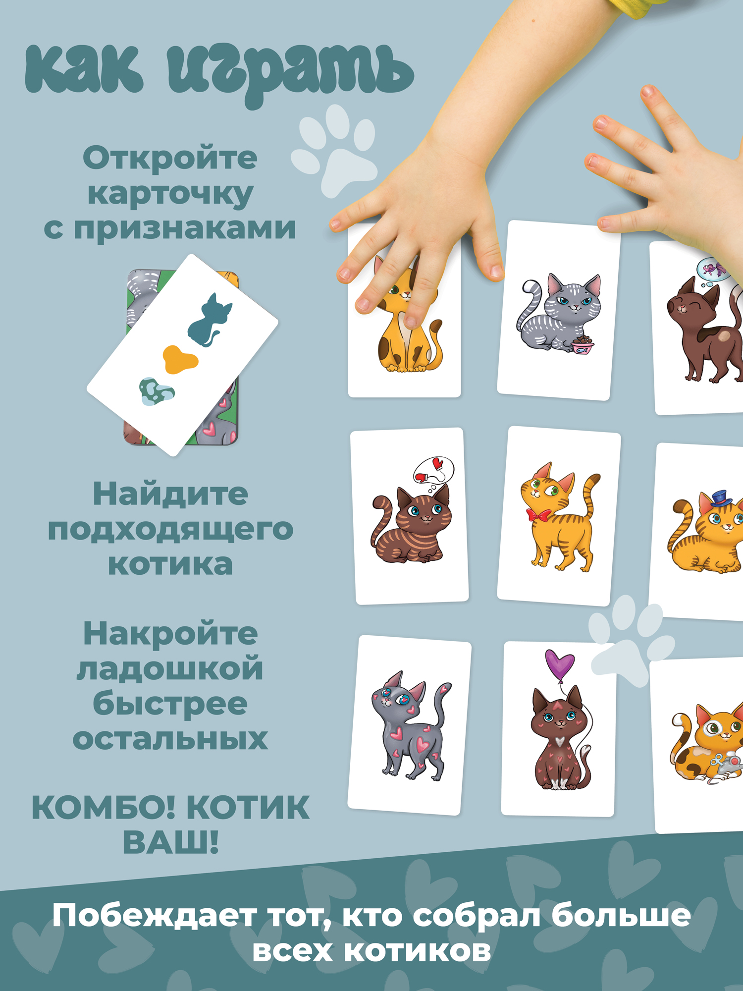 В комплекте 25 карточек с разными котиками и 25 карточек с признаками. Каждая комбинация признаков подходит только одному котику. Найдите нужного котика и накройте ладошкой быстрее других игроков!
