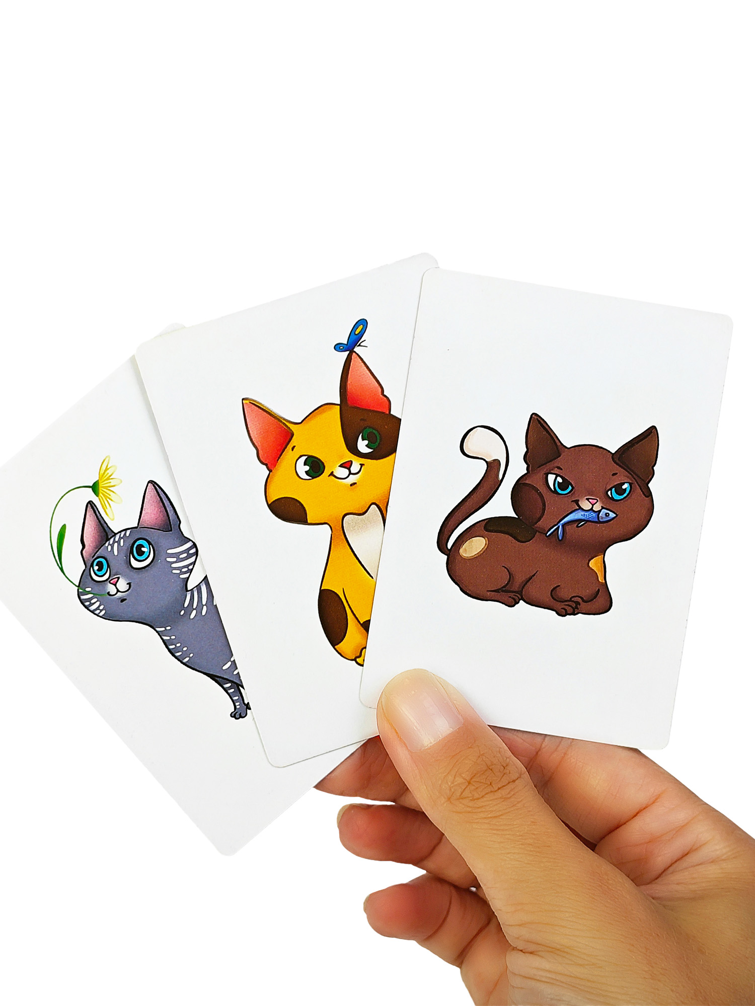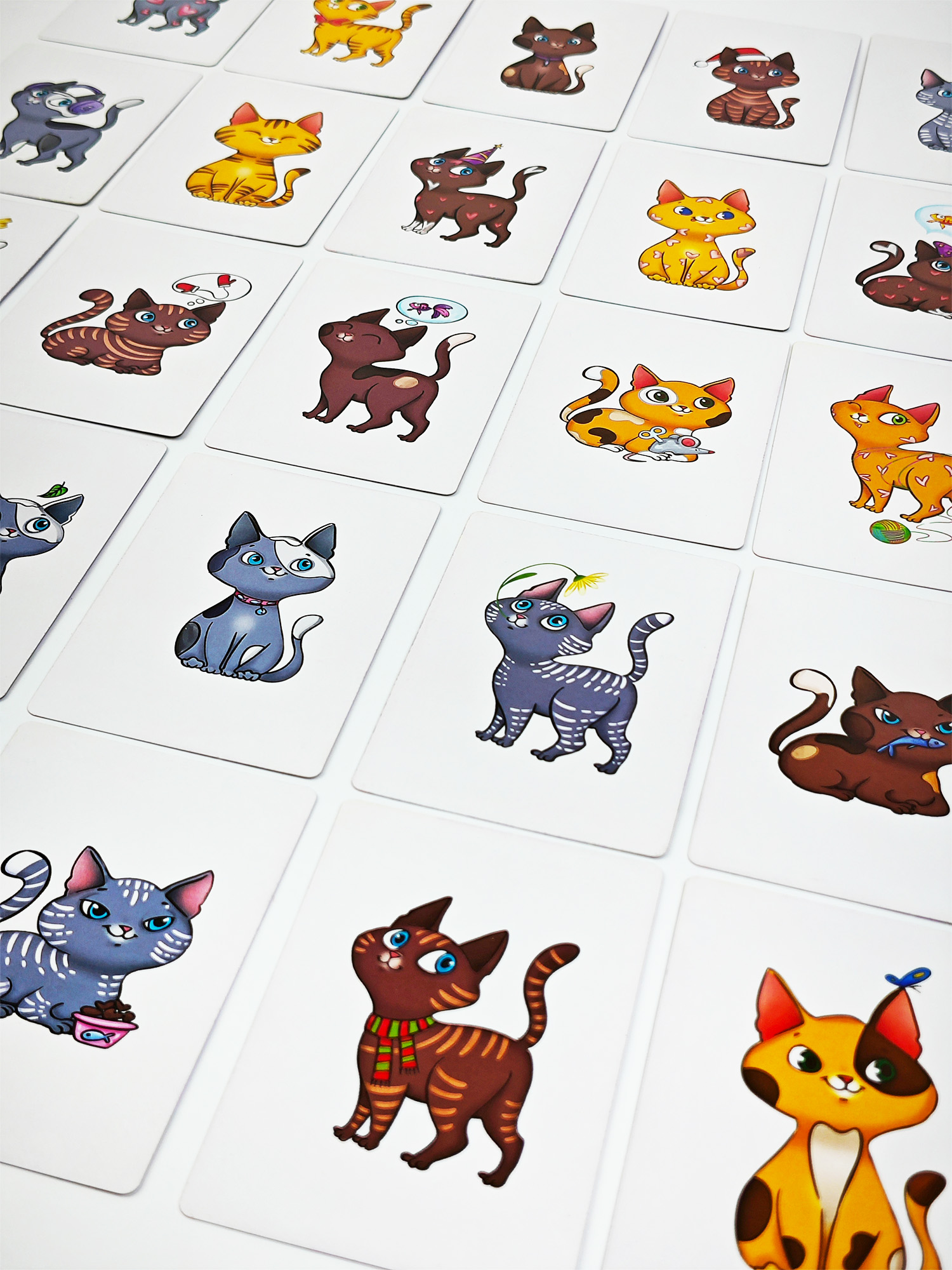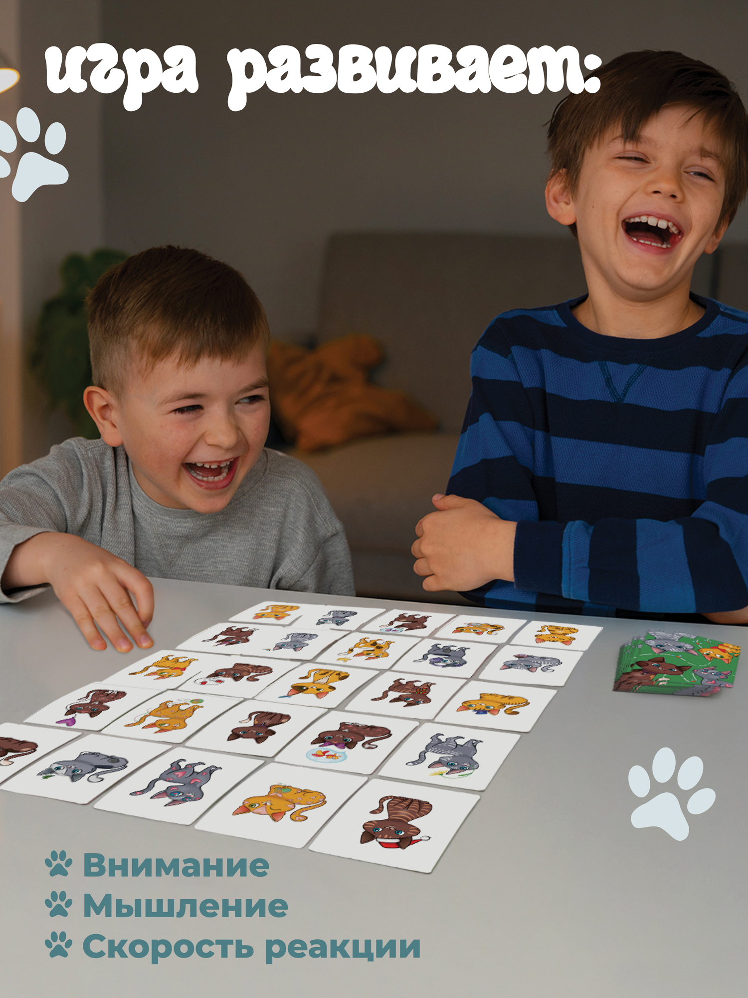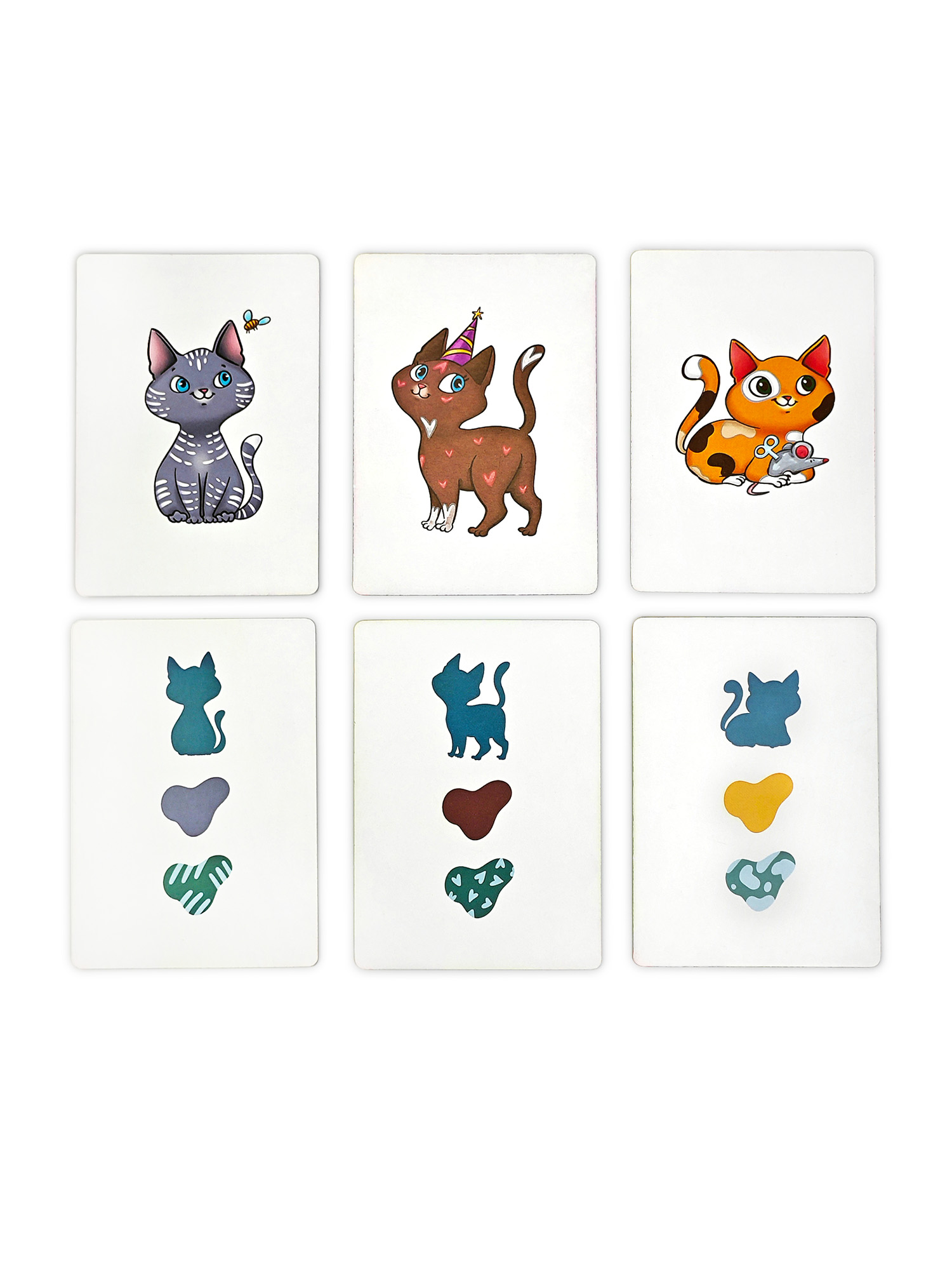 В комплекте 25 карточек с разными котиками и 25 карточек с признаками. Каждая комбинация признаков подходит только одному котику. Найдите нужного котика и накройте ладошкой быстрее других игроков!