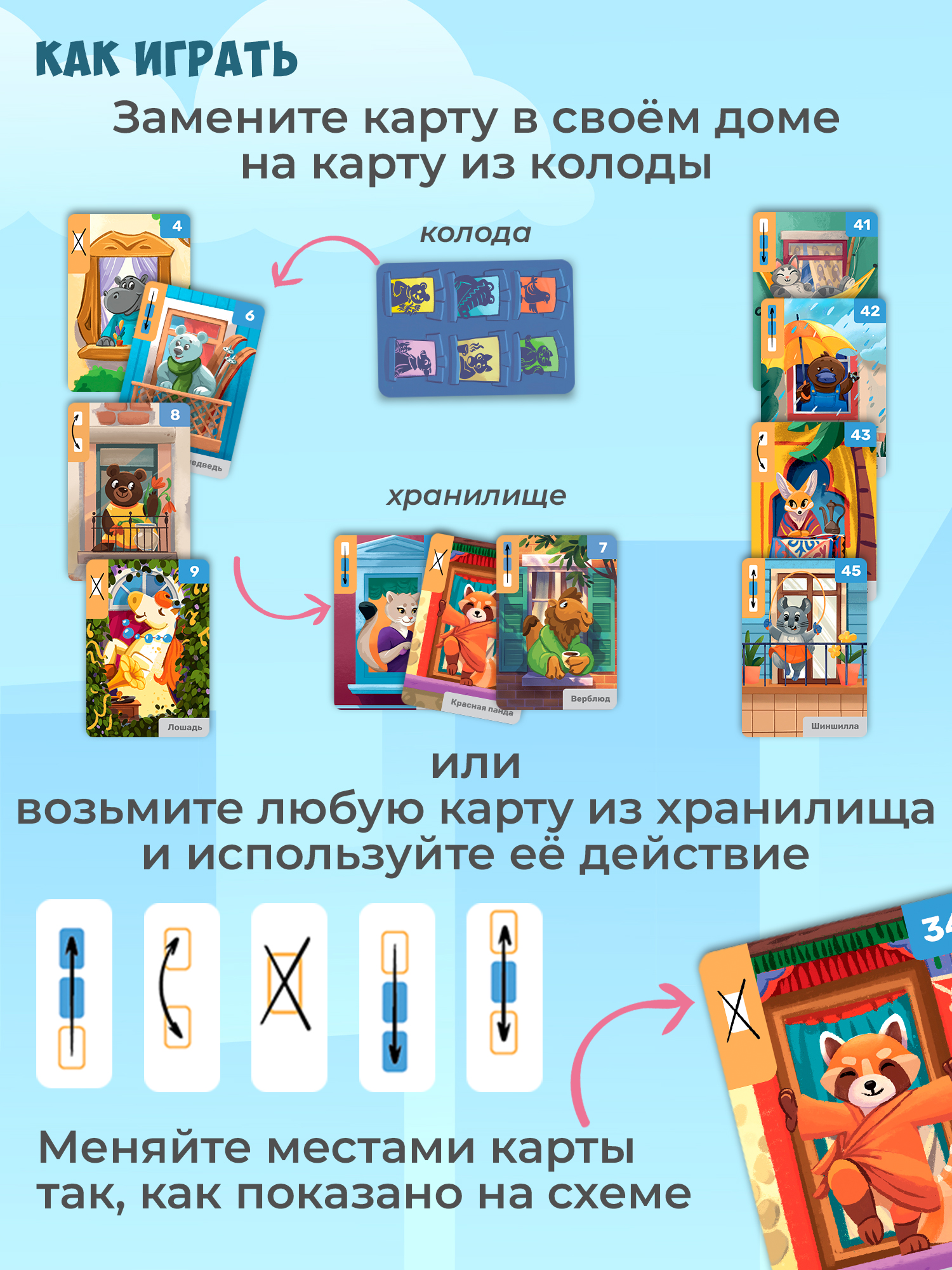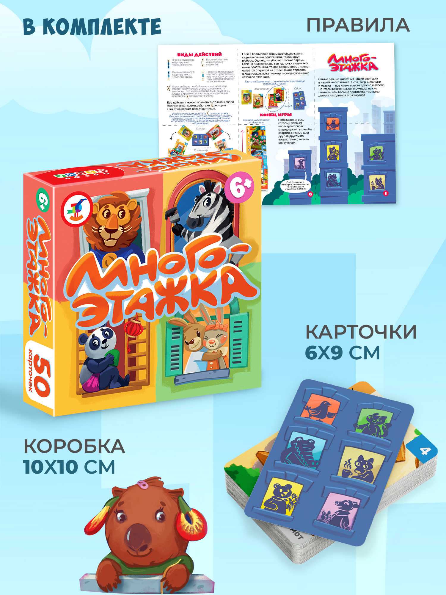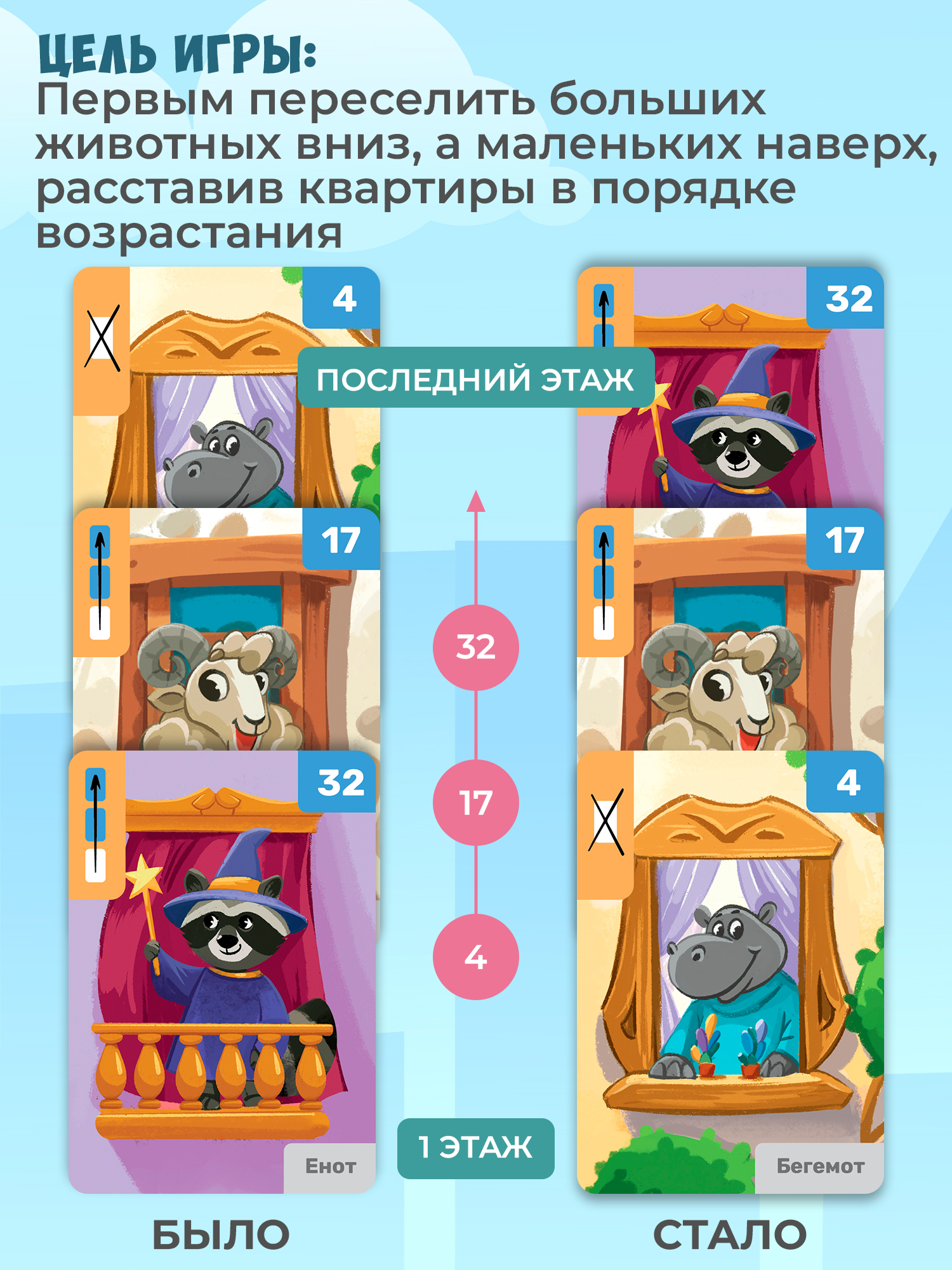 Каждому игроку необходимо не только построить многоэтажку, но и быстрее всех правильно расселить в ней зверей, используя специальные действия, изображённые на картах. Чтобы победить, используйте изобретательность, внимание и логику!
