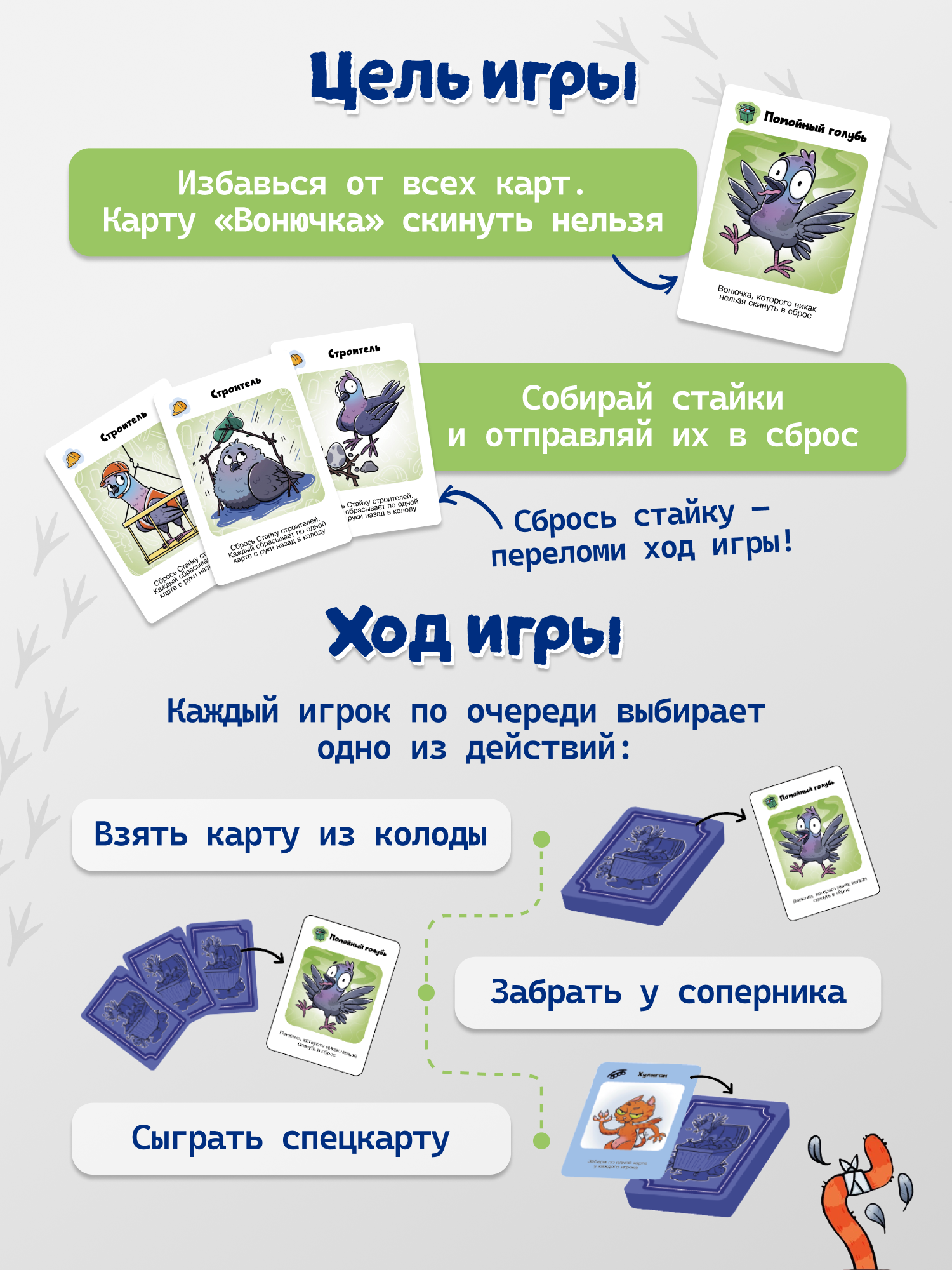 Каждому игроку необходимо быстрее остальных сбросить ВСЕ карты с руки. Однако, задачка это не из лёгких: Помойный голубь тот ещё прилипала, и избавиться от него стандартными методами не выйдет. Придётся включать смекалку, чтобы передать надоедливого вонючку своему противнику.