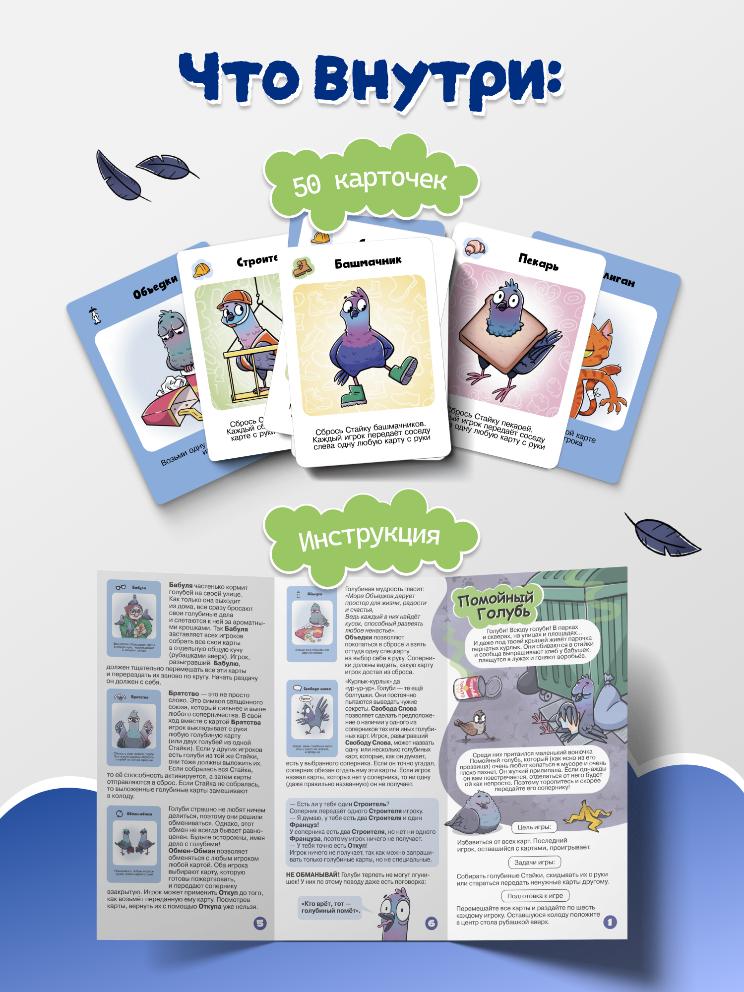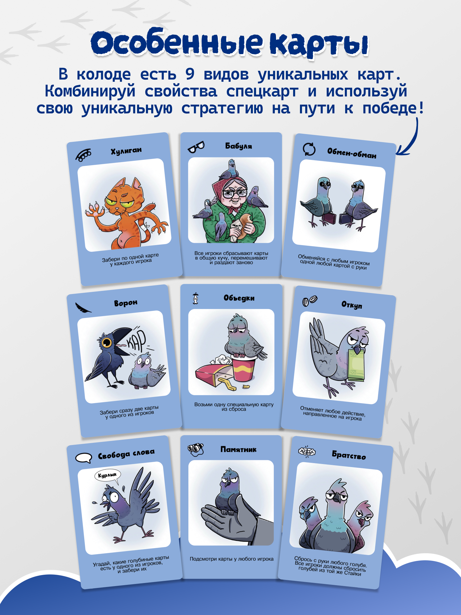 «Помойный голубь» – по своей сути довольно простая игра. Чтобы победить, нужно собирать стайки голубей, сбрасывать их с рук и пытаться не вытянуть Помойного голубя. В этом помогают специальные карты. Однако, различные их комбинации могут помочь выстроить свою совершенно уникальную стратегию игры.